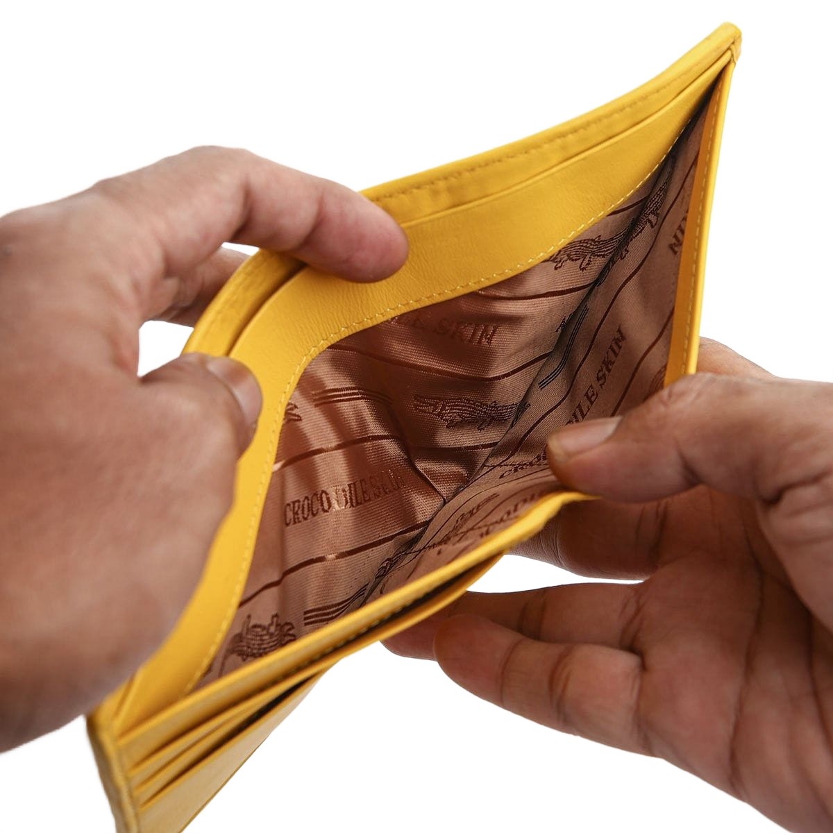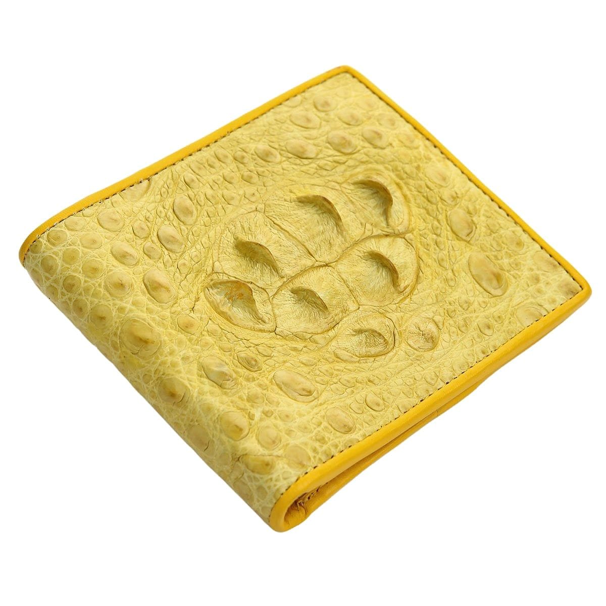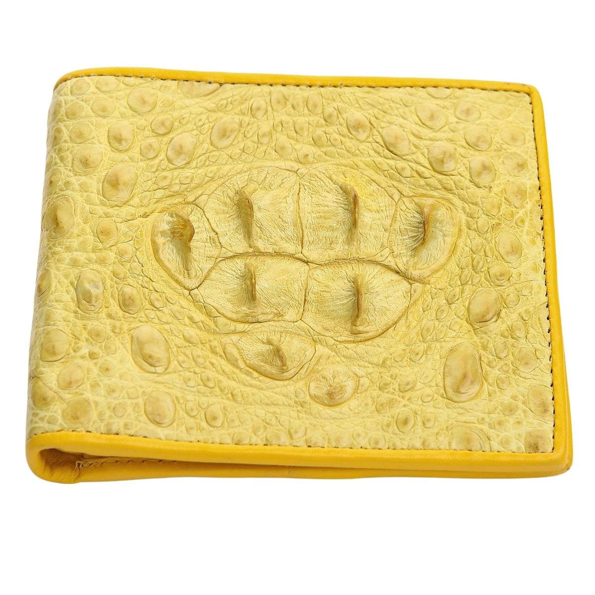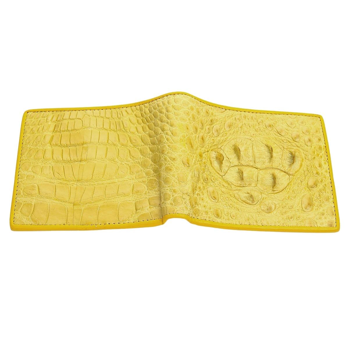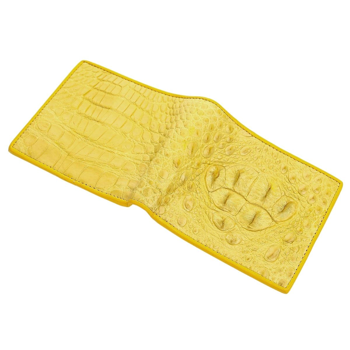 Q: Is this wallet made entirely of crocodile skin? A: The exterior of this yellow bifold wallet is 100% genuine crocodile hornback skin. The interior is made from high-quality, durable cowhide leather, dyed to match, which allows for a slimmer, more flexible wallet.