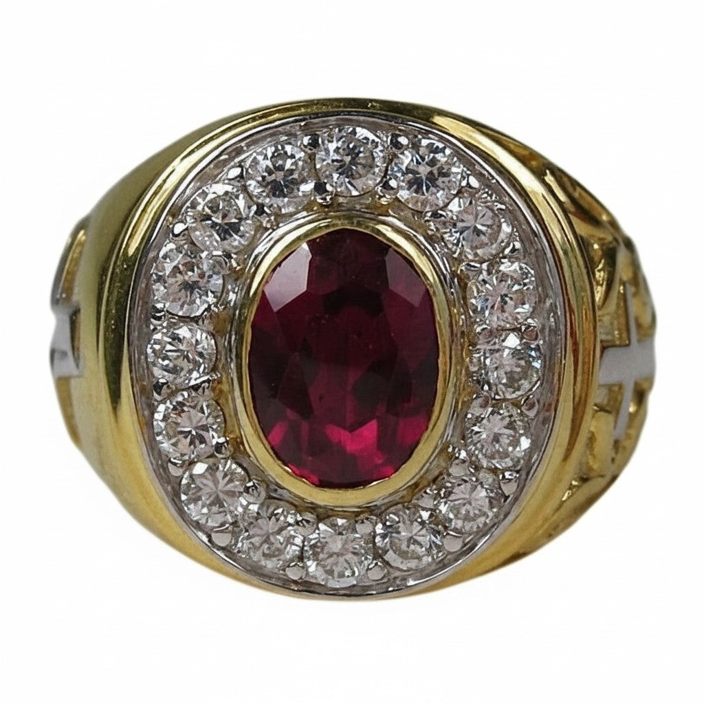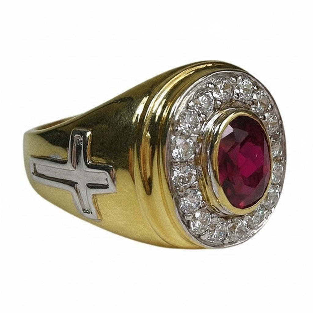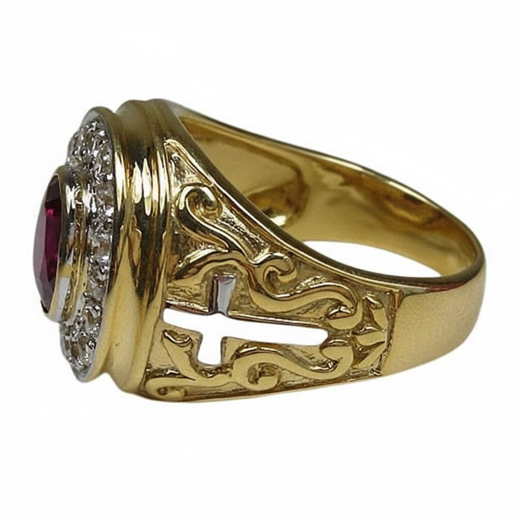 Add luxury to your style with our Yellow Gold Red Ruby & Clear Stone Bishop Ring. Expertly handcrafted from solid sterling silver with thick, radiant 14K yellow gold plating, this ring boasts a captivating ruby-red Cubic Zirconia centerpiece surrounded by sparkling clear stones. This piece is inspired by the grand, authoritative rings of high-ranking bishops, radiating an aura of opulence and reverence. Intricately detailed craftsmanship makes this accessory truly unforgettable, capturing elegance and sophistication from every angle.