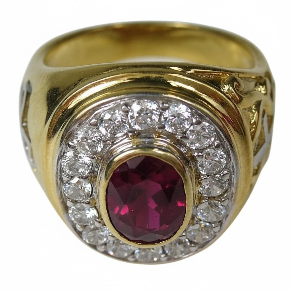 We believe a ring this magnificent deserves to be crafted from fine materials. The foundation is forged from solid .925 sterling silver, providing strength and a substantial feel. The entire piece is then expertly plated with a thick, high-quality layer of 14k yellow gold for a luxurious and lasting finish. The magnificent centerpiece is a high-grade ruby-red Cubic Zirconia, complemented by a halo of sparkling clear CZ stones. The .925 trademark stamp inside the band is your guarantee of the sterling silver base.