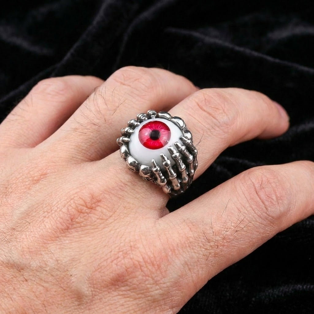 No momento em que desliza este anel no seu dedo, você nota-o imediatamente – aquele peso satisfatório de 19 gramas de prata esterlina sólida a assentar contra a sua articulação. Os dedos esqueléticos polidos envolvem a bola ocular vermelha em forma de cúpula com uma pegada quase protetora, e quando a luz apanha a íris carmesim, há uma beleza inquietante que faz as pessoas olharem duas vezes. Eu usei o meu em concertos, inaugurações de galerias e fins de semana casuais, e sem falta, alguém sempre pergunta onde o comprei.