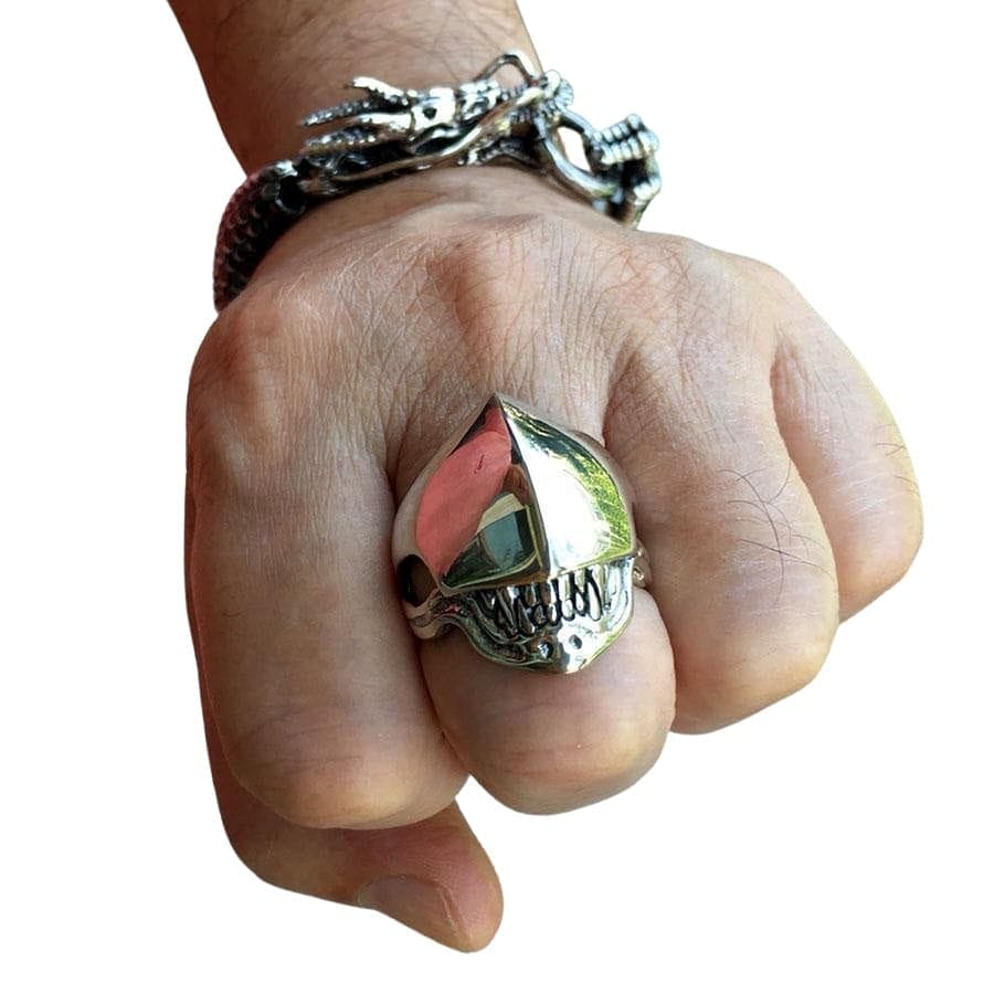 P: Quão durável é o acabamento polido da cabeça? R: O anel é feito em prata de lei maciça, tornando o material extremamente resistente. O polimento espelhado da cúpula pode adquirir micro riscos com uso intenso e diário, o que é normal em qualquer metal polido. Muitos proprietários consideram que isso acrescenta carácter ao anel, conferindo-lhe um aspeto de sobrevivente de batalha. Se preferires um acabamento impecável, pode sempre ser polido novamente por um ourives profissional.