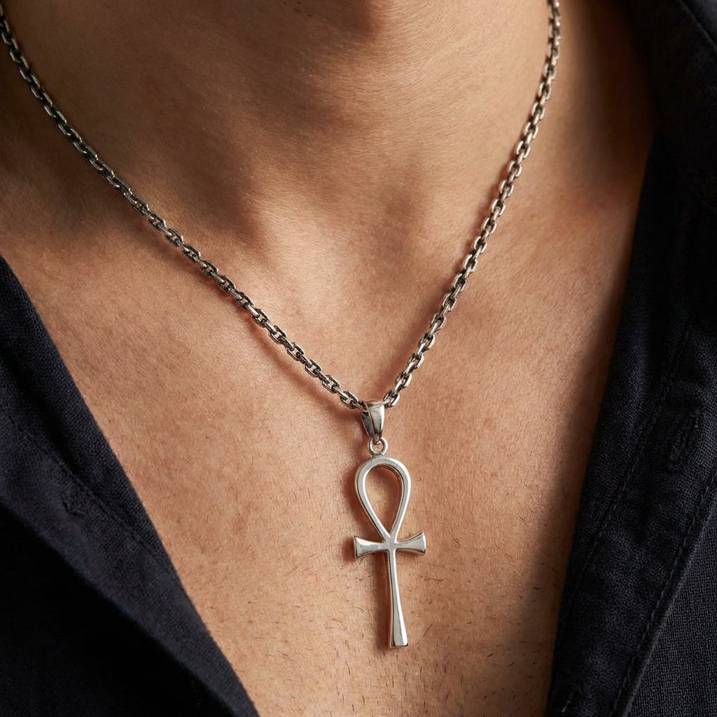 Leve o antigo símbolo da vida eterna perto do seu coração com o nosso deslumbrante pendente ankh, uma homenagem moderna e elegante a um dos ícones mais poderosos da história. Meticulosamente feito à mão em prata esterlina sólida, este pendente é mais do que um acessório; é um talismã pessoal que representa a sagrada Chave da Vida e a própria respiração da vida.