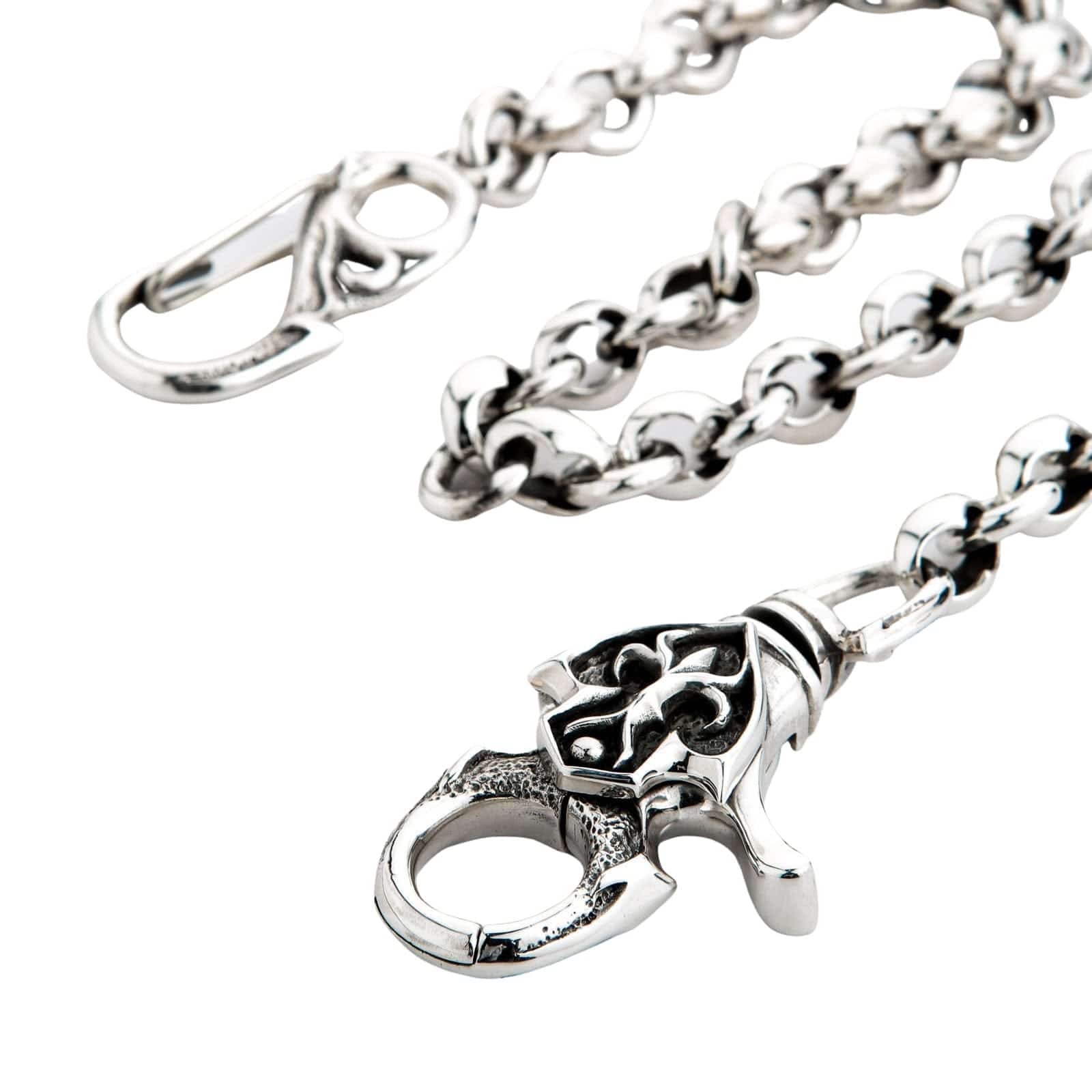 A força desta corrente reside no seu fecho personalizado. Apresenta dois mosquetões ornamentados de grandes dimensões, cada um gravado com um feroz motivo tribal. Uma extremidade tem um mosquetão rotativo robusto que prende com segurança ao cinto, evitando torções e nós. A outra tem um gancho em S estilizado para a carteira ou chaves, garantindo uma ligação fiável e um visual intransigente.