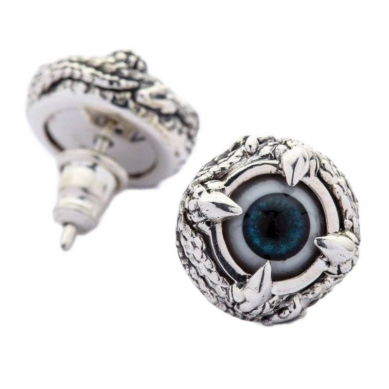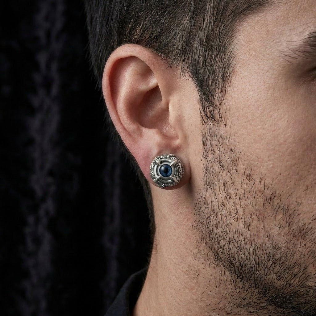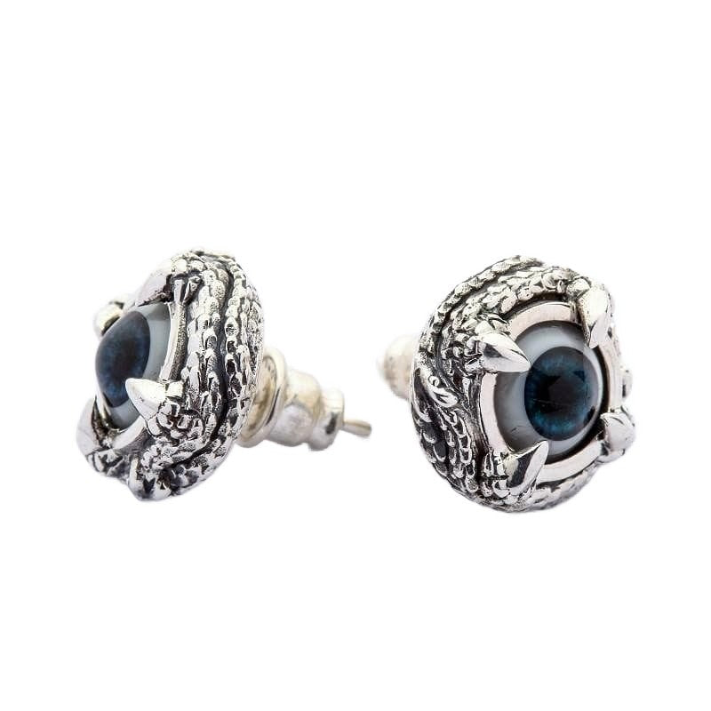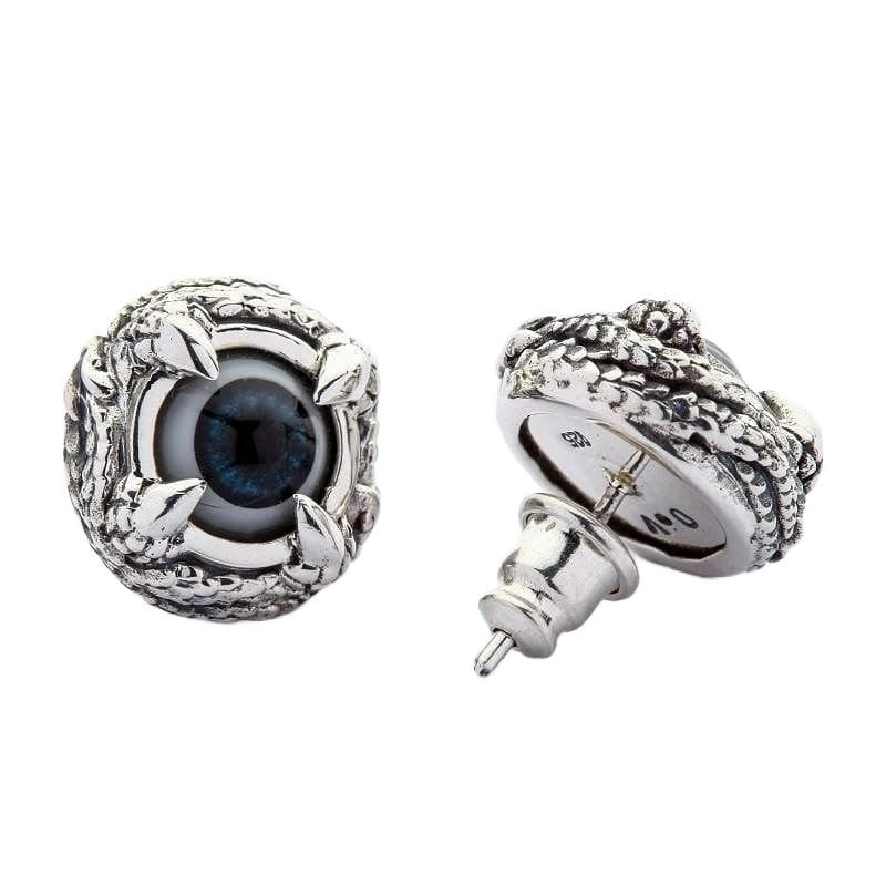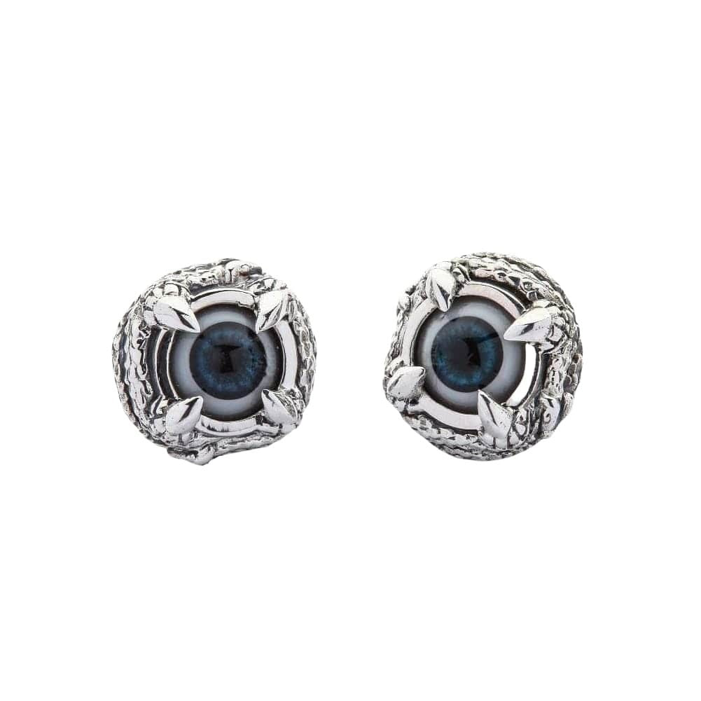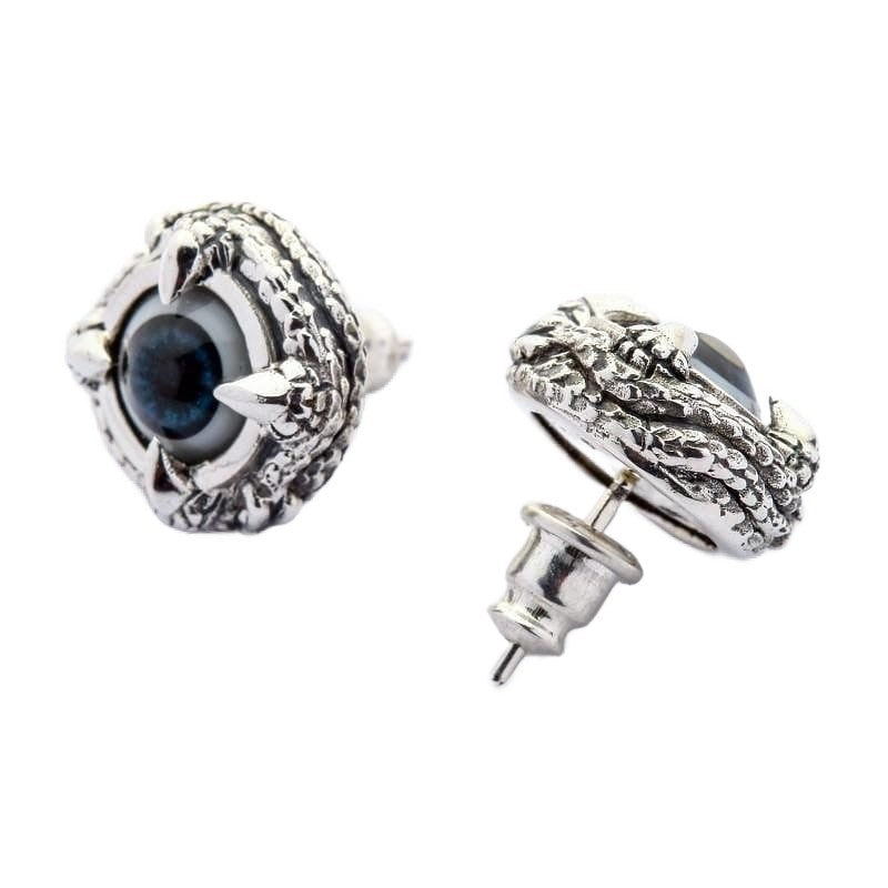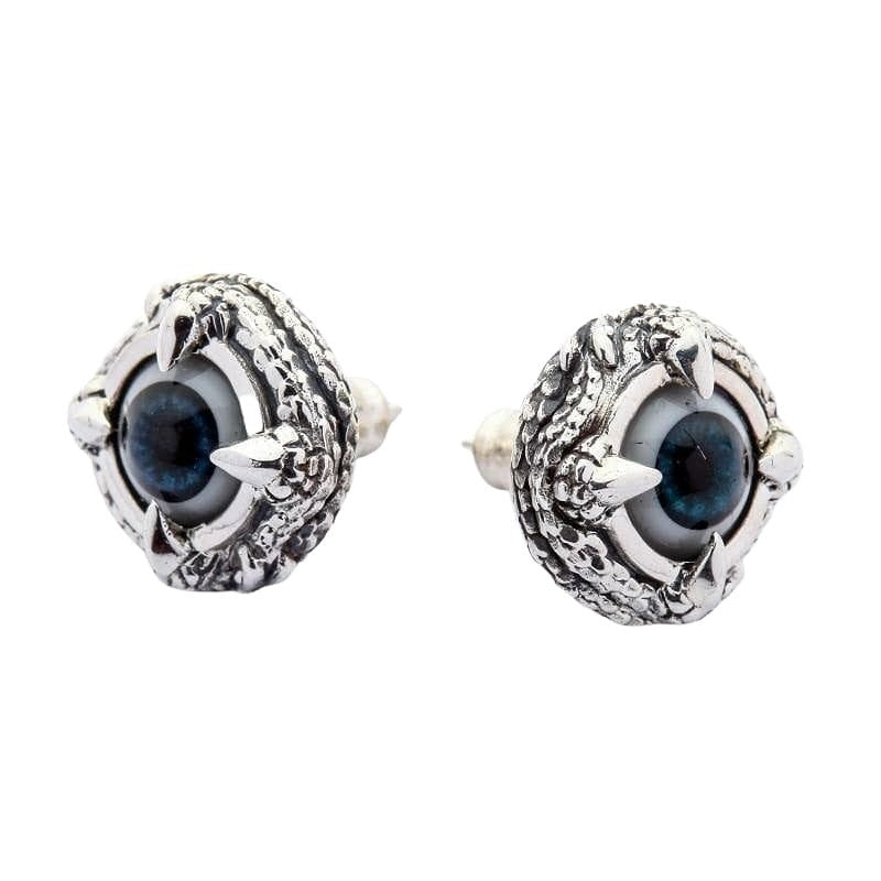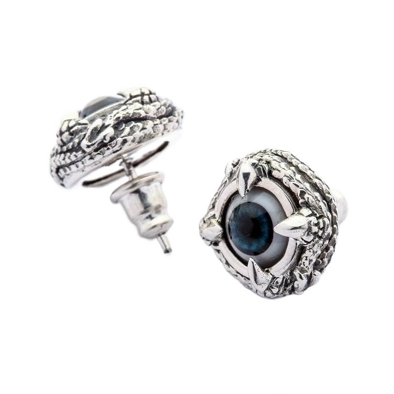 Cada olho azul profundo olha de volta com um realismo inquietante que capta a luz de forma diferente dependendo do seu ângulo. Os ganchos de garra acabados à mão agarram a esfera com precisão predatória, criando aquele equilíbrio perfeito entre o trabalho em prata elegante e a estética alternativa sombria que os verdadeiros colecionadores de joias góticas desejam.