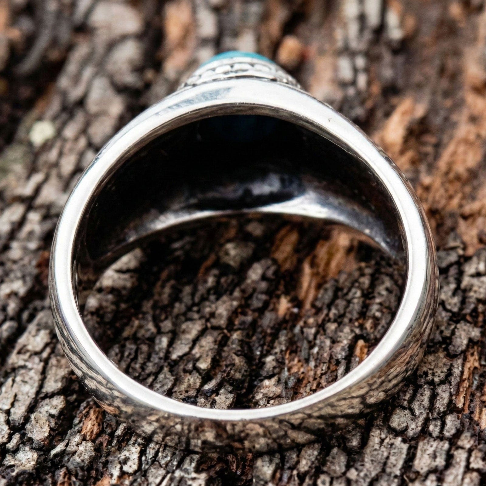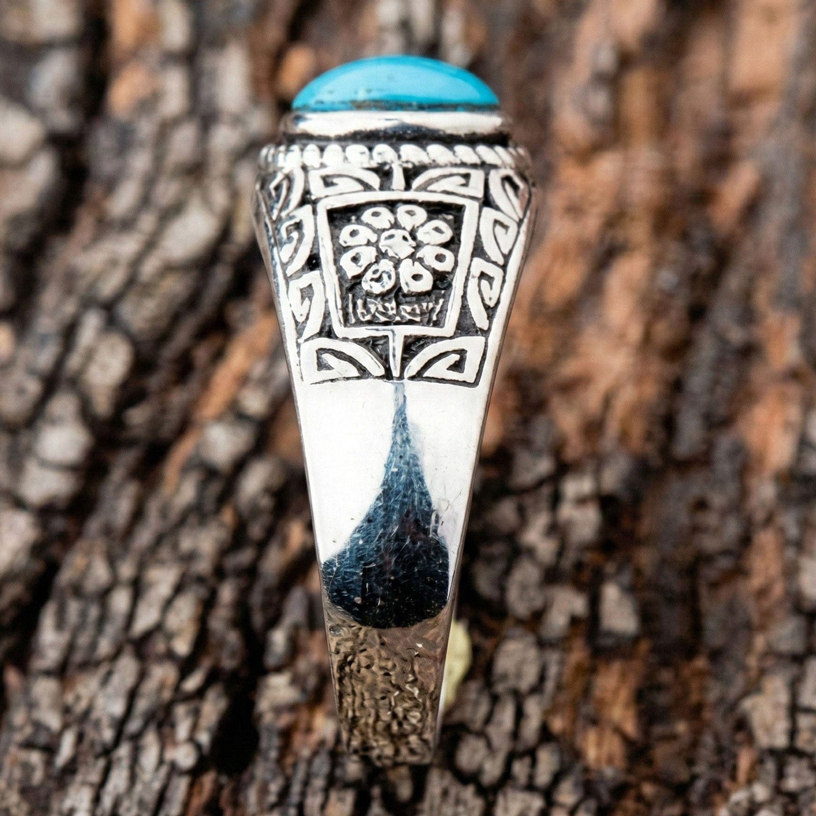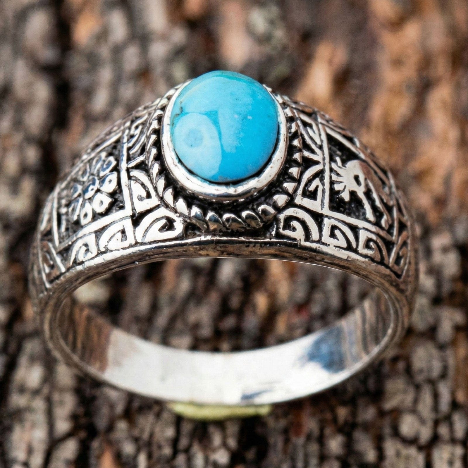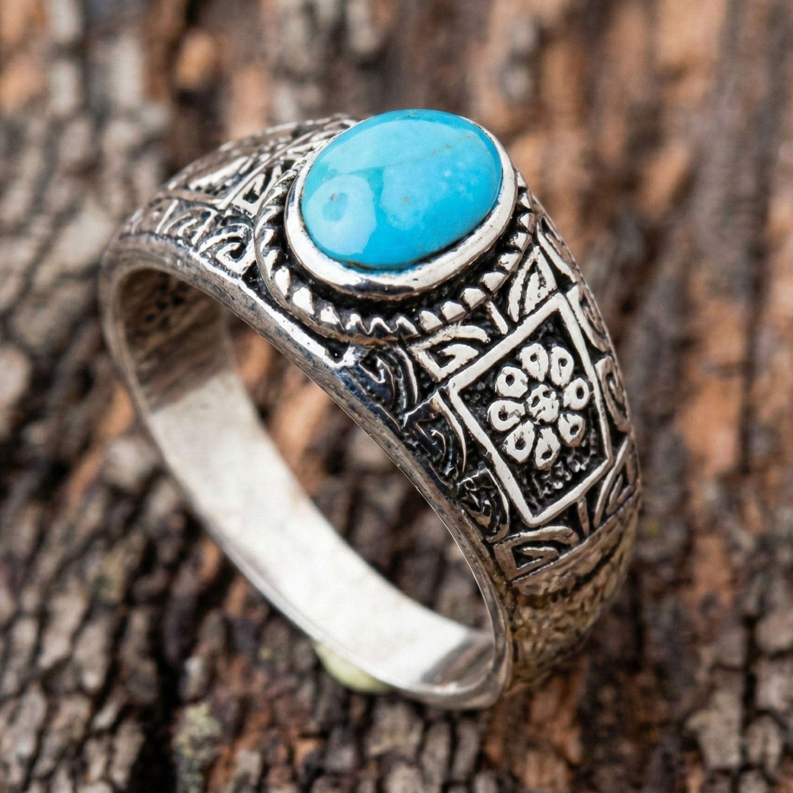 ✔ Padrões Étnicos Intricados: Motivos florais e gravações geométricas rodeiam a pedra, realçados com detalhes oxidados para profundidade.