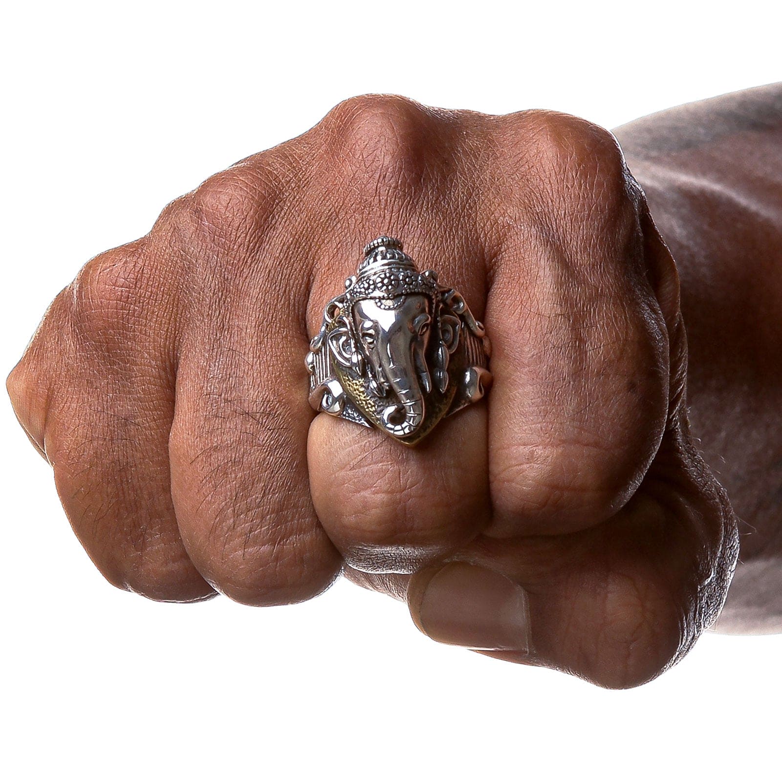 Todos os elementos deste anel de deus-elefante são cuidadosamente artesanais, criados por mestres artesãos. O design apresenta a cabeça divina de Ganesha em alto-relevo impressionante, com um elaborado Mukut (adereço de cabeça) e tromba enrolada, simbolizando sabedoria e a capacidade de distinguir o bem do mal. Este é um verdadeiro anel Ganesh masculino, com uma presença sólida e marcante na mão.