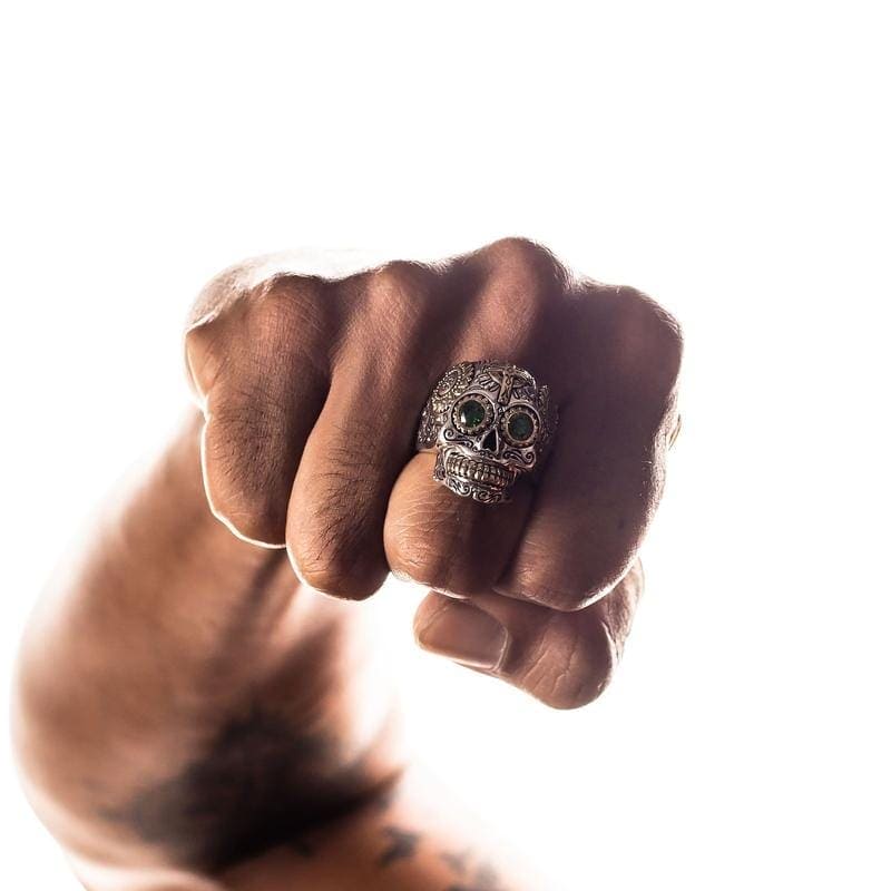 Anel Caveira Mexicana Olhos Verdes - Joalharia Masculina Calavera em Prata de Lei