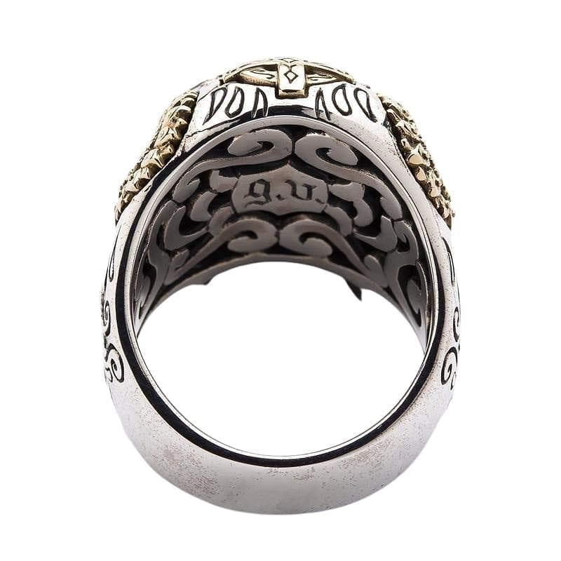 Inspirado na tradicional Calavera da arte popular mexicana, este anel é uma homenagem deslumbrante ao ciclo infinito da vida. O elemento mais marcante são os seus olhos penetrantes, cravejados com pedras CZ verdes lapidação brilhante que simbolizam vida, esperança e renascimento. Estas pedras vibrantes são rodeadas de detalhes intrincados – desde os padrões florais festivos à cruz sagrada na testa – tudo desenhado com o espírito de honrar os antepassados. Os nossos artesãos utilizam uma técnica bi-tom, sobrepondo detalhes dourados em latão sobre uma base sólida de prata de lei. Este contraste faz sobressair cada detalhe esculpido, criando uma peça de arte para usar.