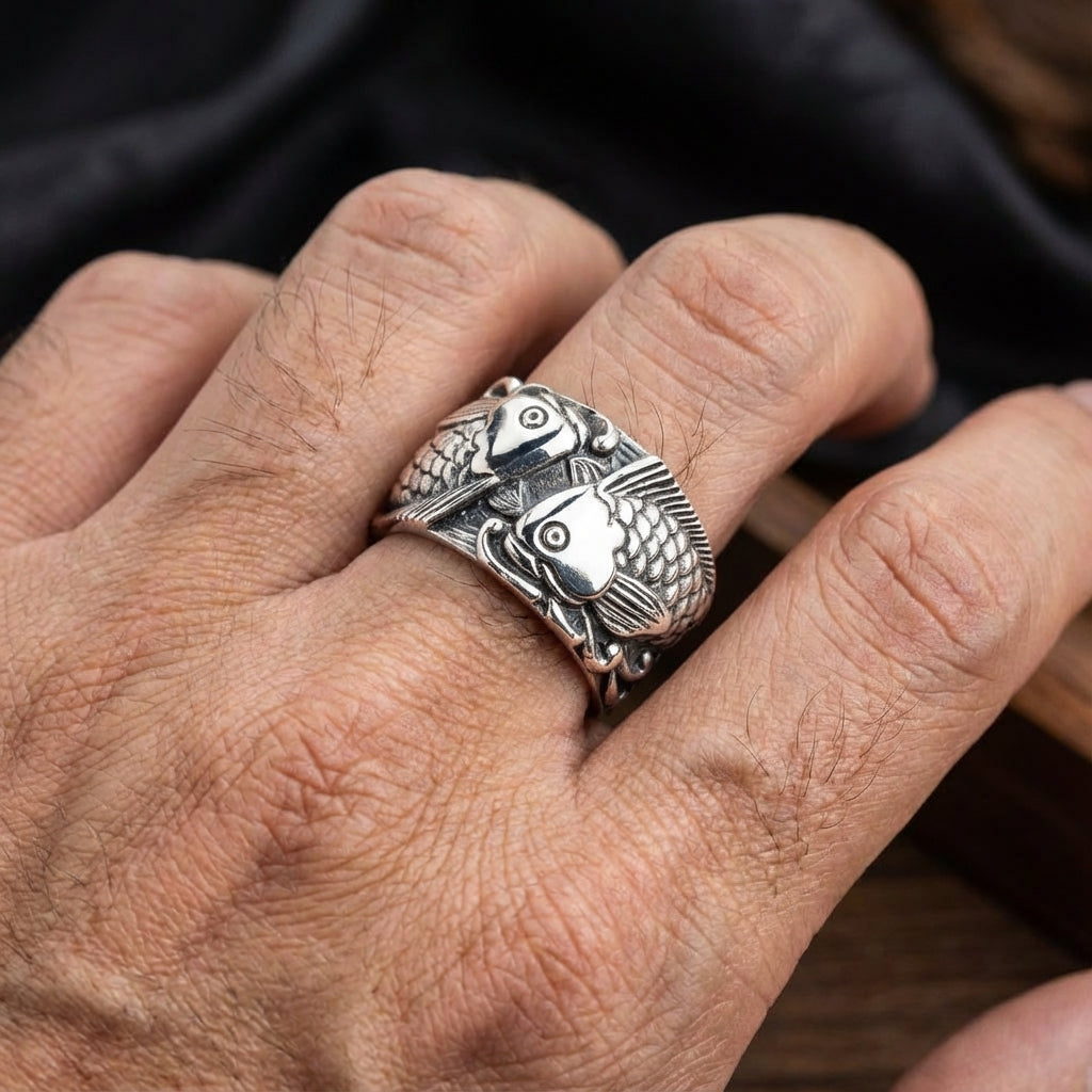 Na cultura japonesa, os koi são conhecidos por nadar contra a correnteza com determinação. Segundo a lenda, aqueles que conseguem têm a chance de se transformar em dragões. A união de dois koi incorpora o simbolismo yin-yang, representando equilíbrio, amor e lealdade e força mútua. Usar um anel koi de prata esterlina é considerado um convite à boa sorte, prosperidade e crescimento pessoal.
