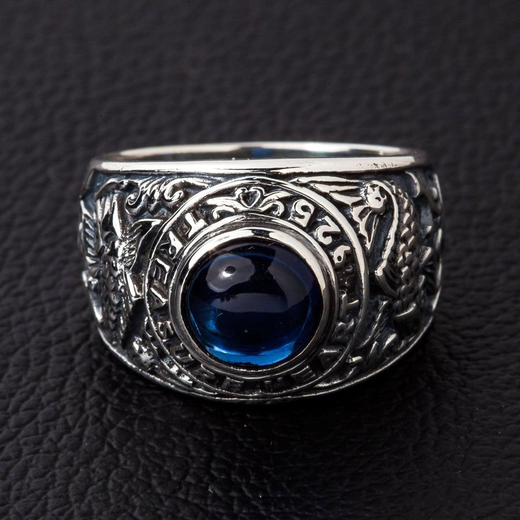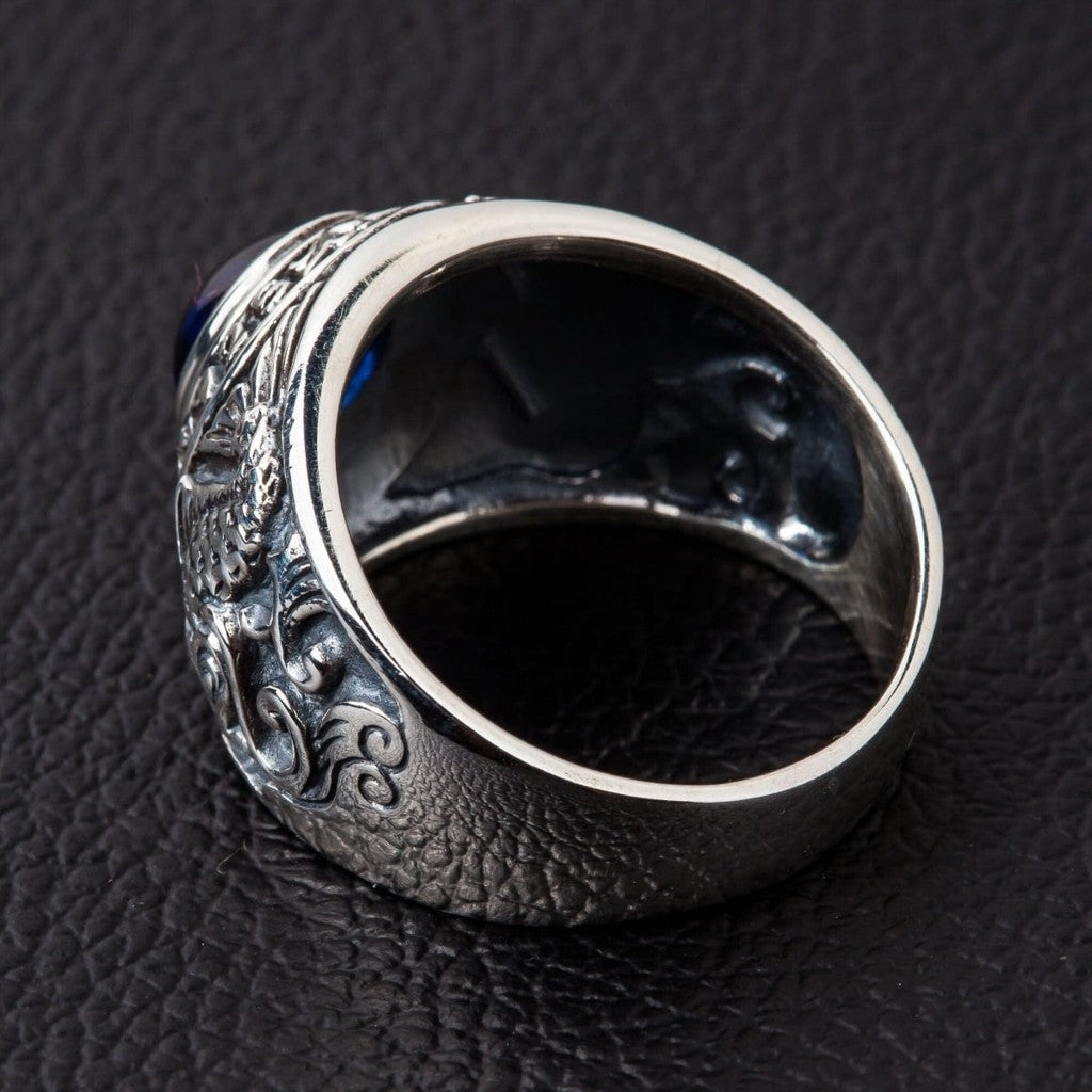 No momento em que deslizas este anel no teu dedo, sentes o seu peso assentar—uma presença sólida e reconfortante que te diz que este não é um pedaço de joalharia comum. A prata esterlina fresca aquece à tua pele, e o profundo cabochão azul safira capta a luz de todos os ângulos, brilhando como a luz da lua sobre águas calmas. Este é um anel feito para homens que apreciam um artesanato significativo e não têm medo de mostrar os seus valores nas mãos.