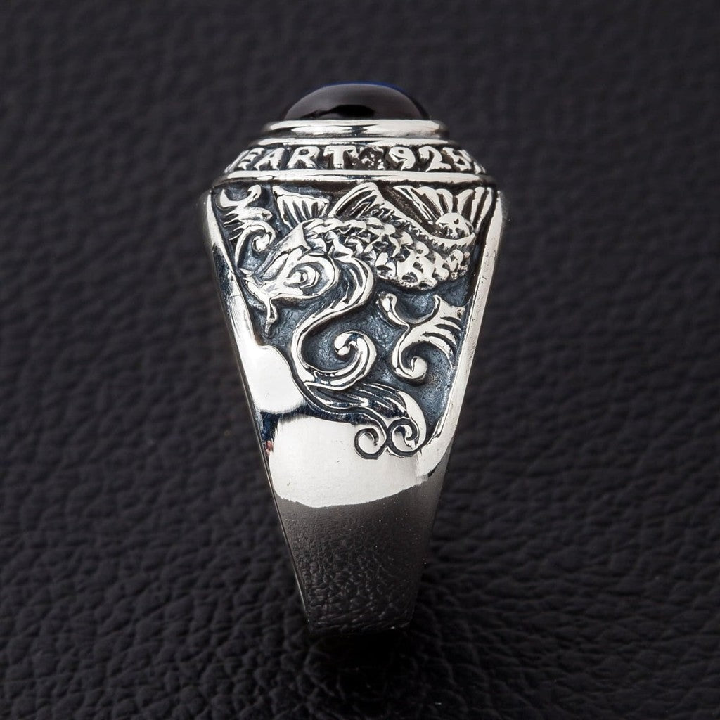 Anel de Peixe Koi em Prata Esterlina para Homens – Símbolo Japonês de Coragem com Pedra Azul Profunda