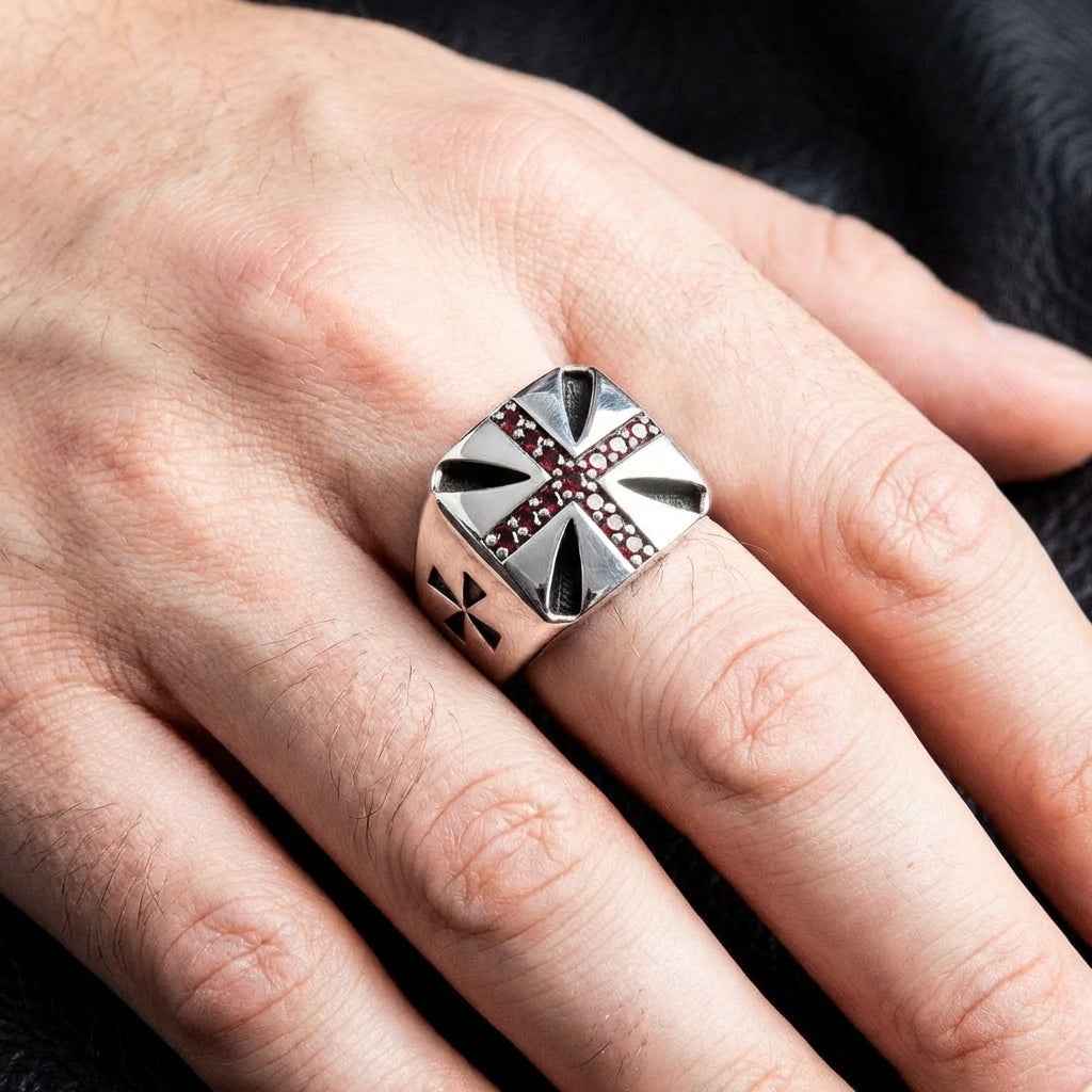 (Corpo do Conteúdo) Este anel é construído com um corpo pesado, polido, estilo anel de sinete, oferecendo uma sensação confortável, mas substancial na sua mão. O topo apresenta uma cruz proeminente, altamente polida, com seus braços meticulosamente definidos com incrustações vibrantes de pedras preciosas vermelhas que capturam a luz.