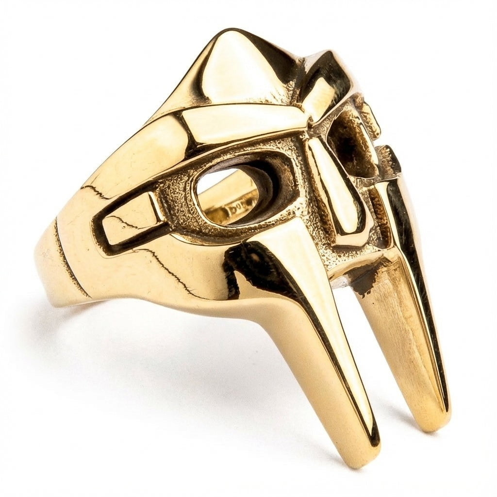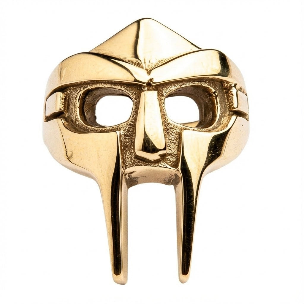 Esta peça é mais do que apenas joalharia; é um tributo utilizável à persona do Super Vilão que redefiniu o género do rap. O design apresenta a icónica silhueta da máscara estilo gladiador, elaborada com detalhes precisos para capturar o olhar formidável da original. Ao combinar a durabilidade crua do latão sólido com o brilho luxuoso do revestimento em ouro amarelo 14K, criámos um anel que se sente substancial no dedo e parece premium sob qualquer luz.