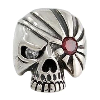 Fabricado à mão em prata de lei maciça 100%, este anel apresenta uma caveira de pirata com olhos de pedras preciosas — uma zircónia vermelha de granada a representar o clássico tapa-olho e uma zircónia transparente deslumbrante no outro olho.