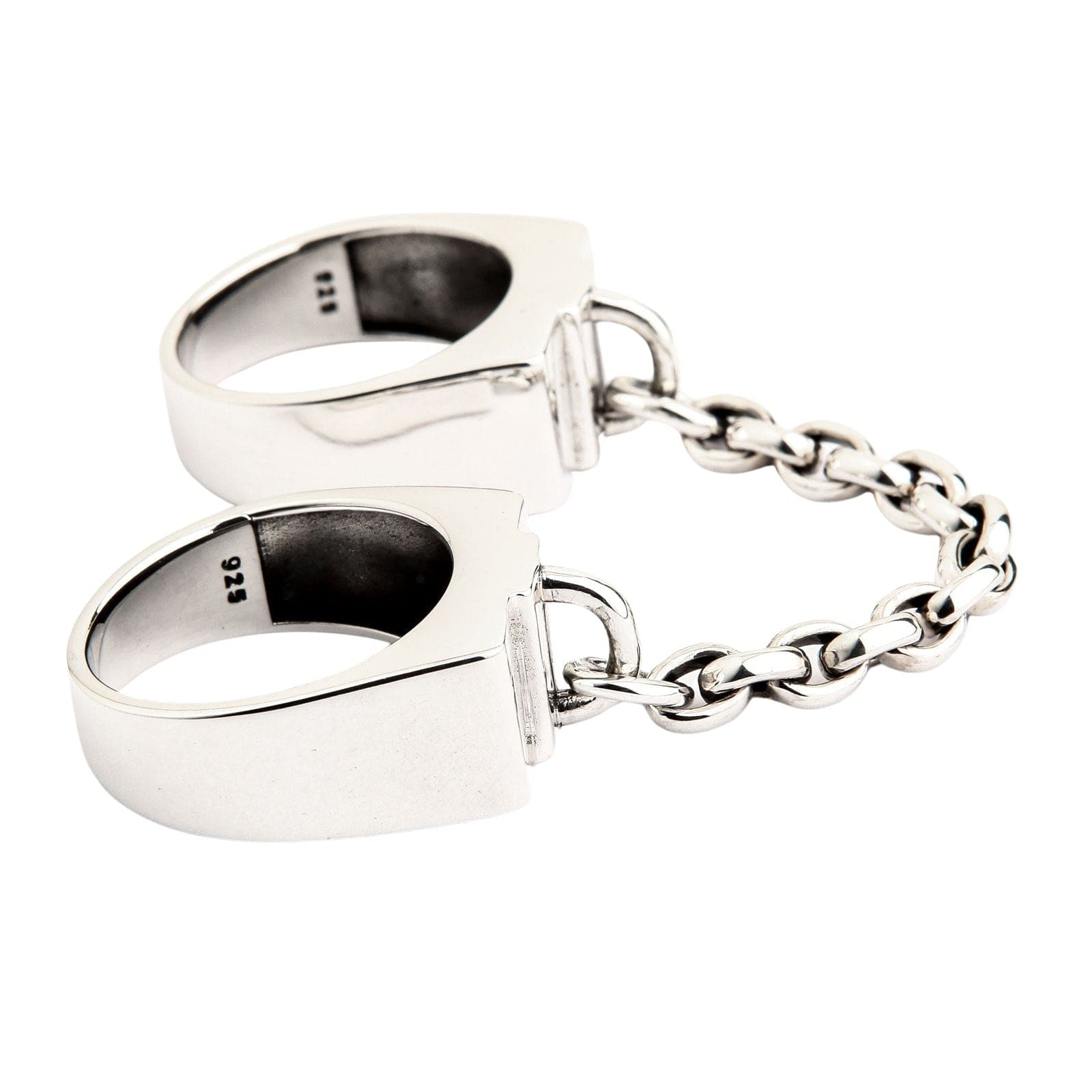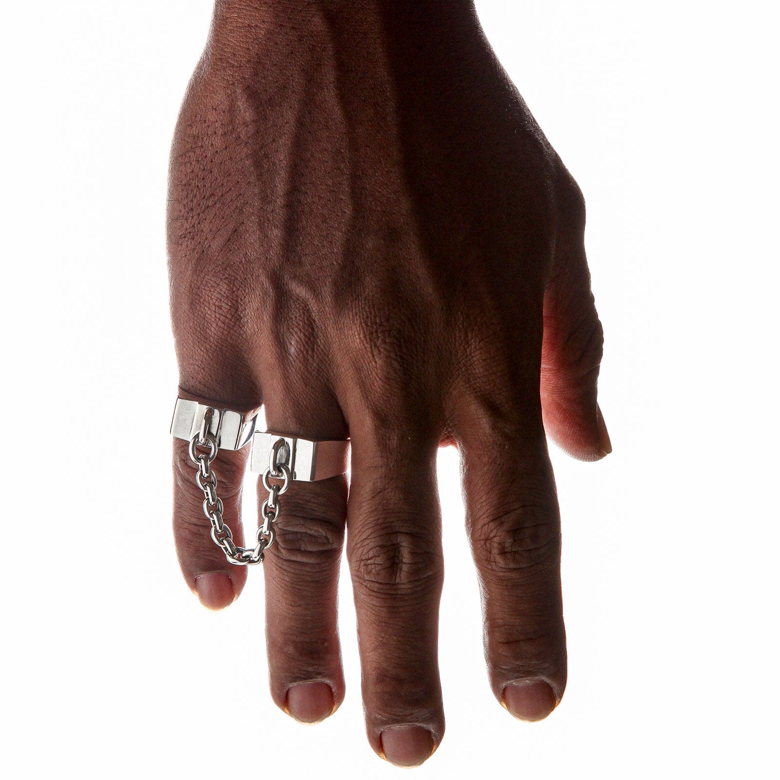 O génio desta peça reside na sua simplicidade crua e poderosa. Duas bandas maciças e polidas, moldadas como algemas modernas, foram desenhadas para serem usadas em dedos adjacentes. Estão permanentemente ligadas por uma curta e robusta corrente de prata de lei, criando uma silhueta ousada e provocadora. Este design é uma referência direta à estética punk rock e industrial, simbolizando um laço inquebrável e um espírito desafiante. A construção do anel é tão intransigente quanto a sua mensagem, forjada a partir de colossais 23 gramas de prata de lei 925 maciça. As linhas limpas e o polimento brilhante conferem-lhe uma elegância brutalista, tornando-o numa peça de arte usável, minimalista e impossível de ignorar.