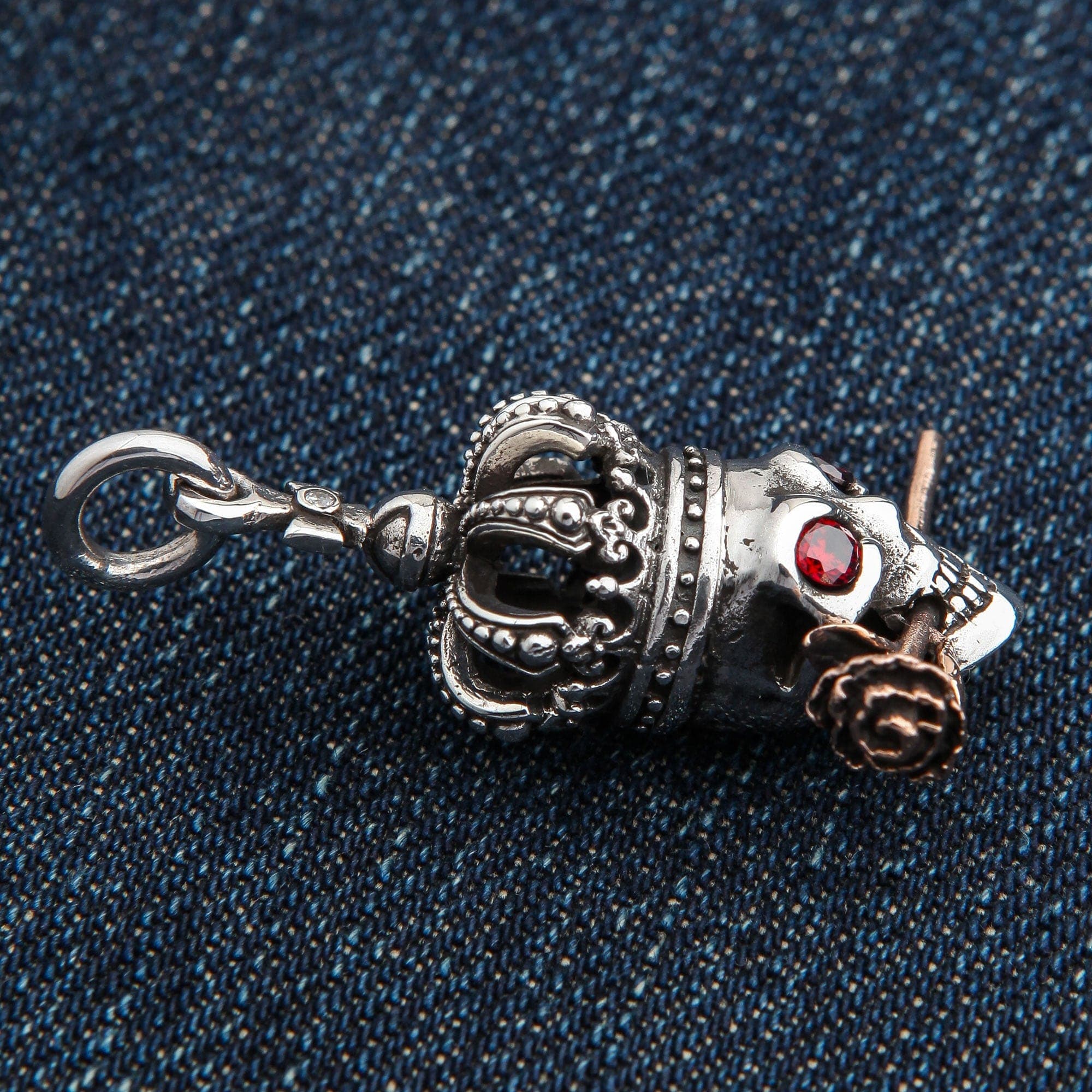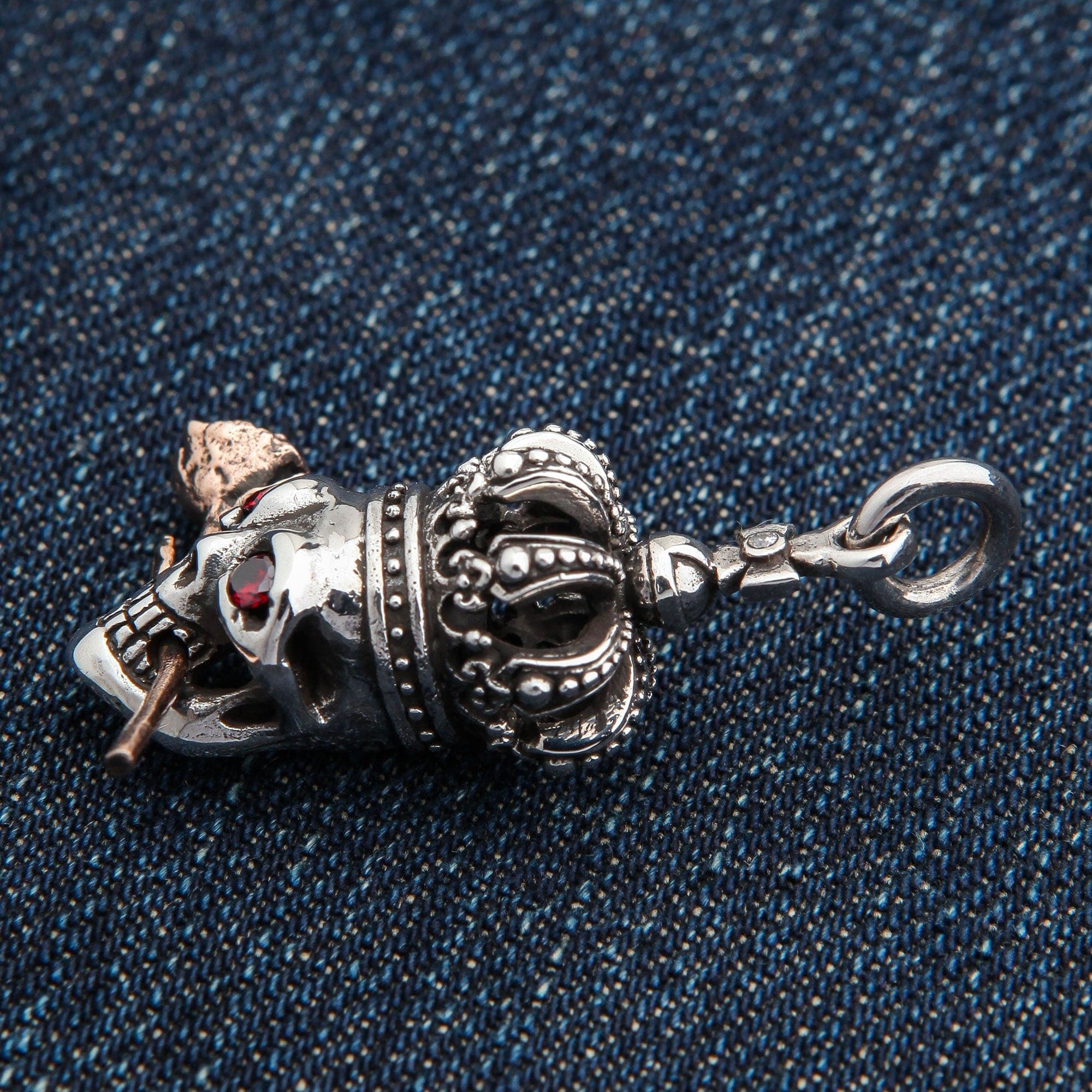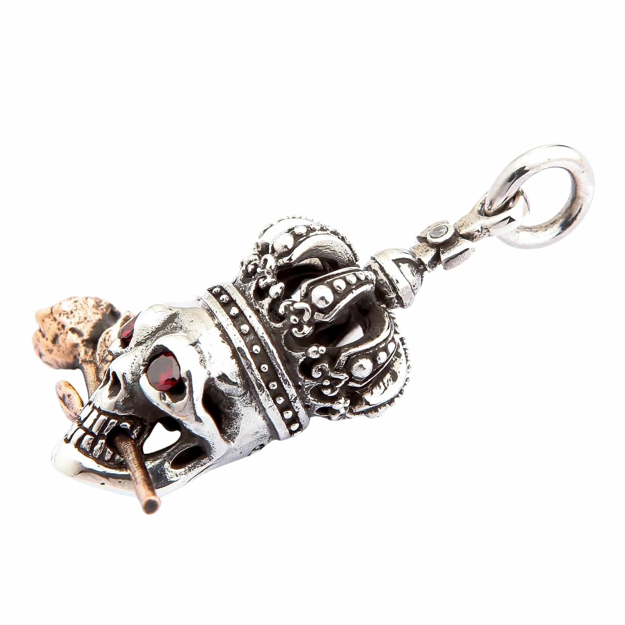 Pingente Gótico de Prata Esterlina com Caveira de Coroa e Olhos de Granada Vermelha e Rosa