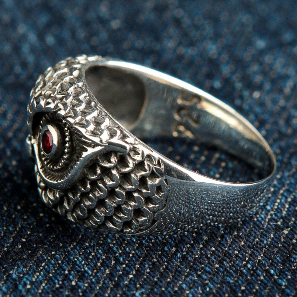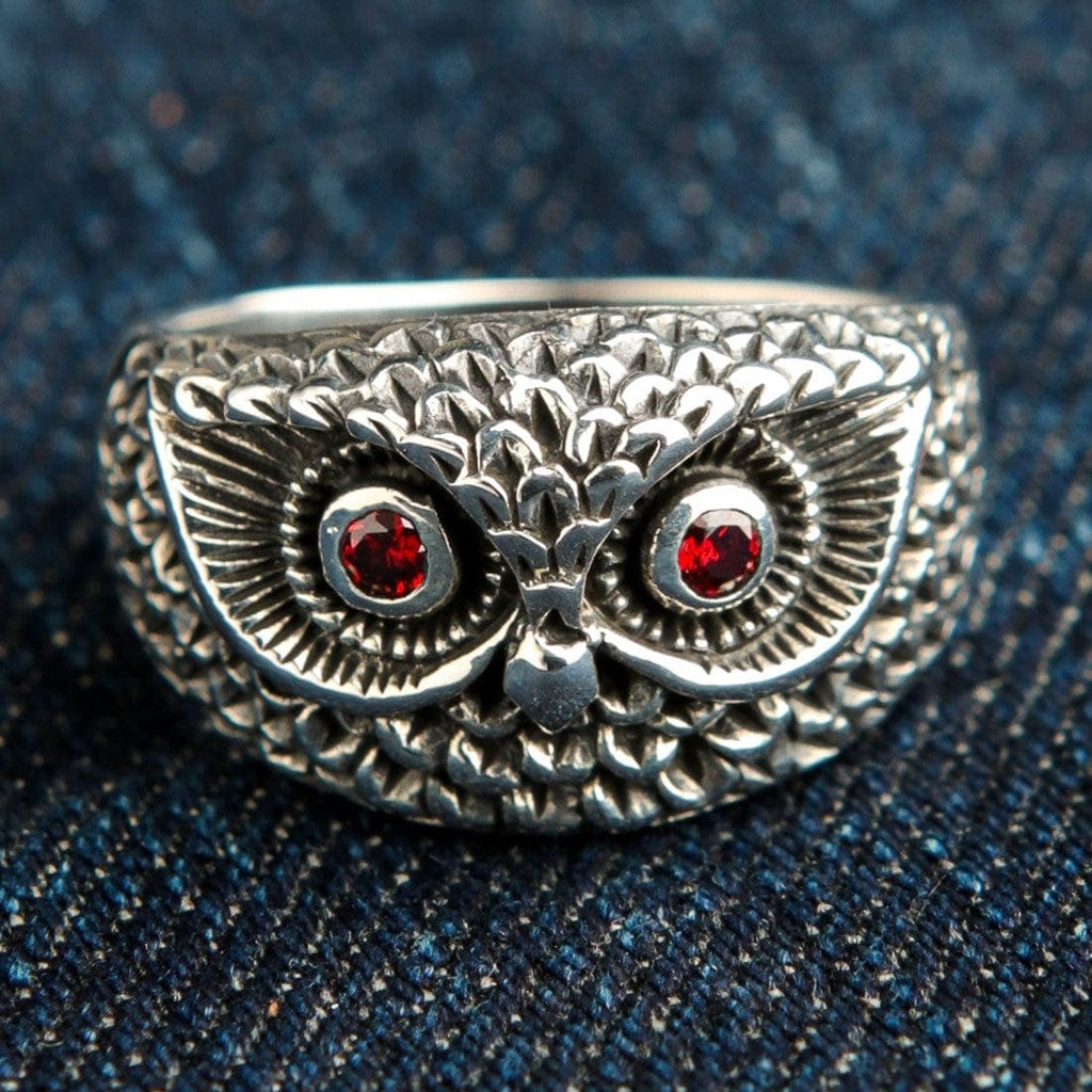 Anel de Coruja em Prata Esterlina com Olhos de Granate Ardente – O Seu Guardião das Verdades Ocultas
