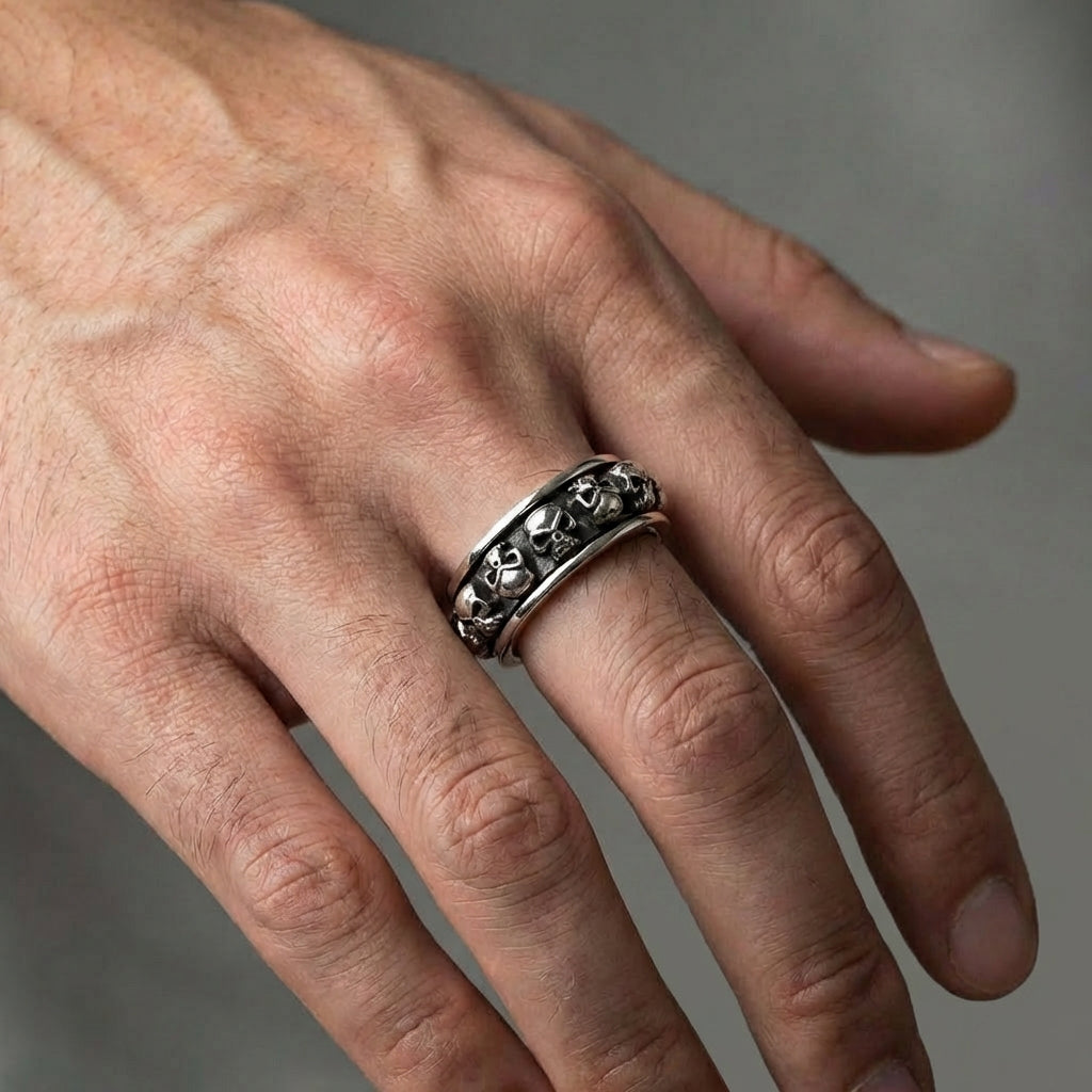 Medite sobre a mortalidade e encontre a sua calma no caos com este incrível anel giratório de caveira. Este é mais do que uma peça de afirmação ousada; é uma peça funcional de arte cinética projetada para o rebelde moderno. Forjado em prata esterlina sólida .925, a banda externa de caveiras intrincadamente esculpidas gira livremente em torno do anel interno, proporcionando um ponto de foco satisfatório e tornando este o anel de ansiedade definitivo para aqueles com um estilo sombrio e desafiador.