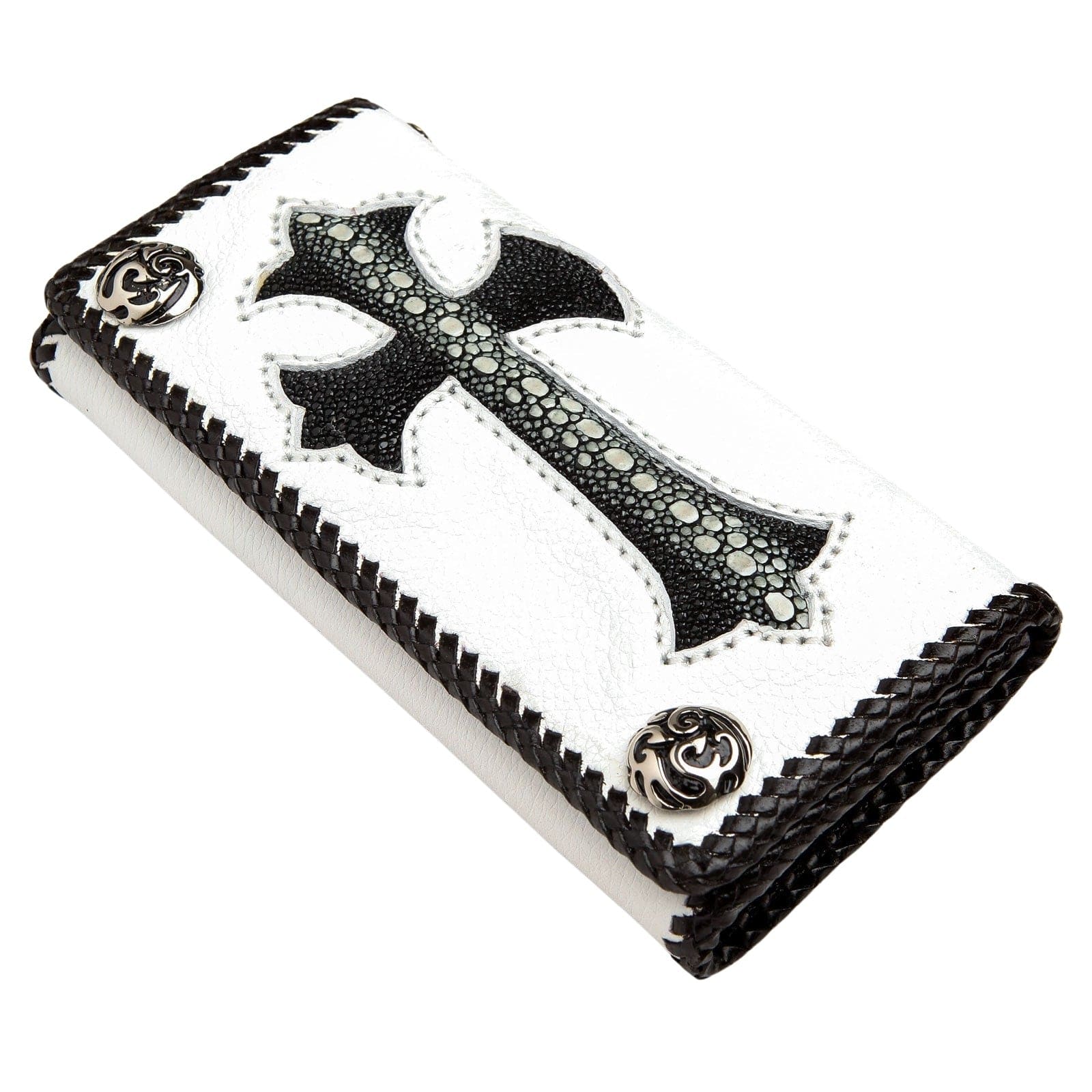 A força desta carteira está no seu contraste visual marcante. O corpo é feito de couro de vaca branco premium, uma base ousada e limpa. Inserida está uma imponente cruz de estilo gótico em couro de raia preto genuíno. Conhecido pela sua textura única, semelhante a caviar, e pela sua quase indestrutibilidade, o detalhe em raia oferece um ponto focal deslumbrante. Toda a peça é rematada por uma resistente borda entrançada à mão em couro preto, que une o design. O hardware é igualmente impressionante, com dois botões de pressão flamejantes prateados para fecho seguro e um ilhó em prata de lei maciça pronto para a sua corrente favorita. No interior, o prático formato triplo abre-se para revelar amplo espaço de arrumação, incluindo um bolso com botão para moedas ou pequenos objetos.