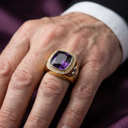Este deslumbrante anel é um tributo aos históricos anéis pontifícios usados por clérigos de alta patente. No seu coração, encontra-se uma enorme ametista genuína em corte almofada, a pedra tradicional dos bispos, simbolizando piedade, sabedoria espiritual e sobriedade. Esta gema roxa real, de qualidade AAA, é rodeada por um halo cintilante de 36 pedras brilhantes que captam a luz com uma brilhante divindade.