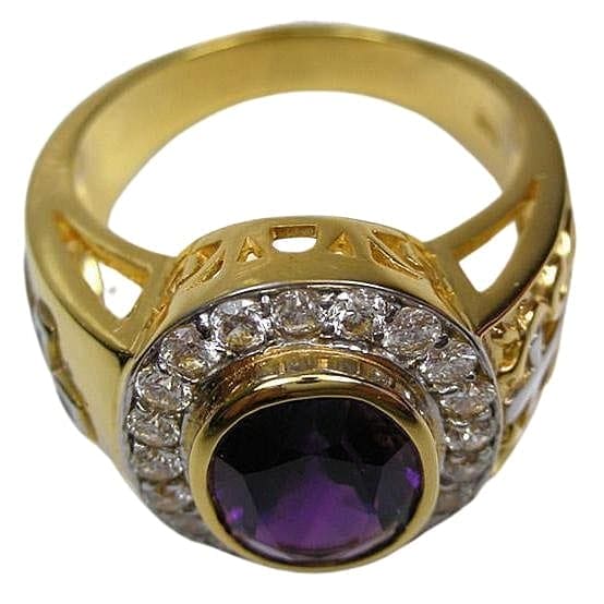 Designul culminează cu un magnific ametist tăiat oval. Ametistul mov regal, celebrat drept piatra lunii februarie, este montat în ramă și înconjurat de o aură sclipitoare de pietre CZ clare care reflectă lumina superb. Întreaga piesă are la bază argint sterling masiv, finisat apoi cu un strat gros de aur 14k. Pentru alte expresii unice ale credinței, explorează întreaga noastră colecție de inele creștine.