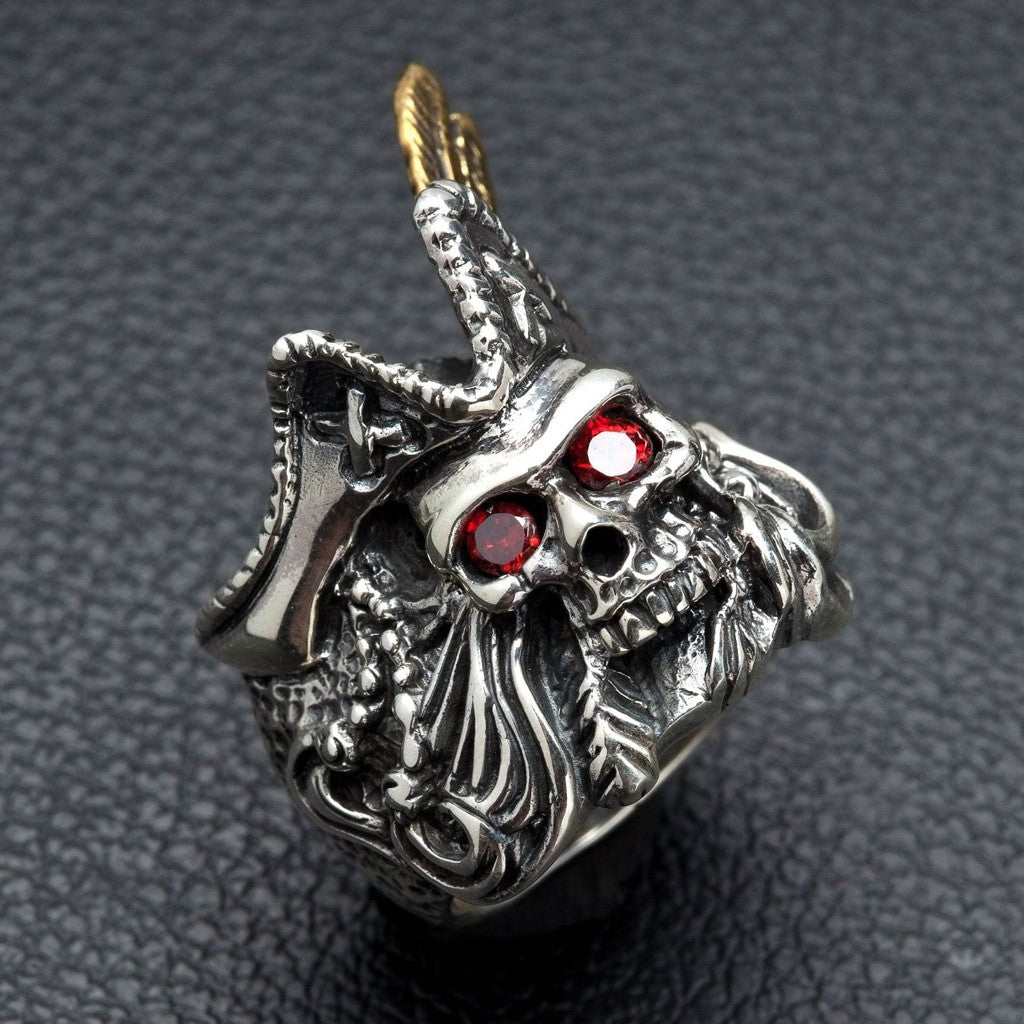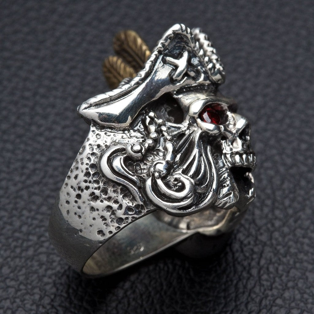 Inel de pirat cu pene – Bijuterie din argint cu craniu și ochi roșu pentru bărbați