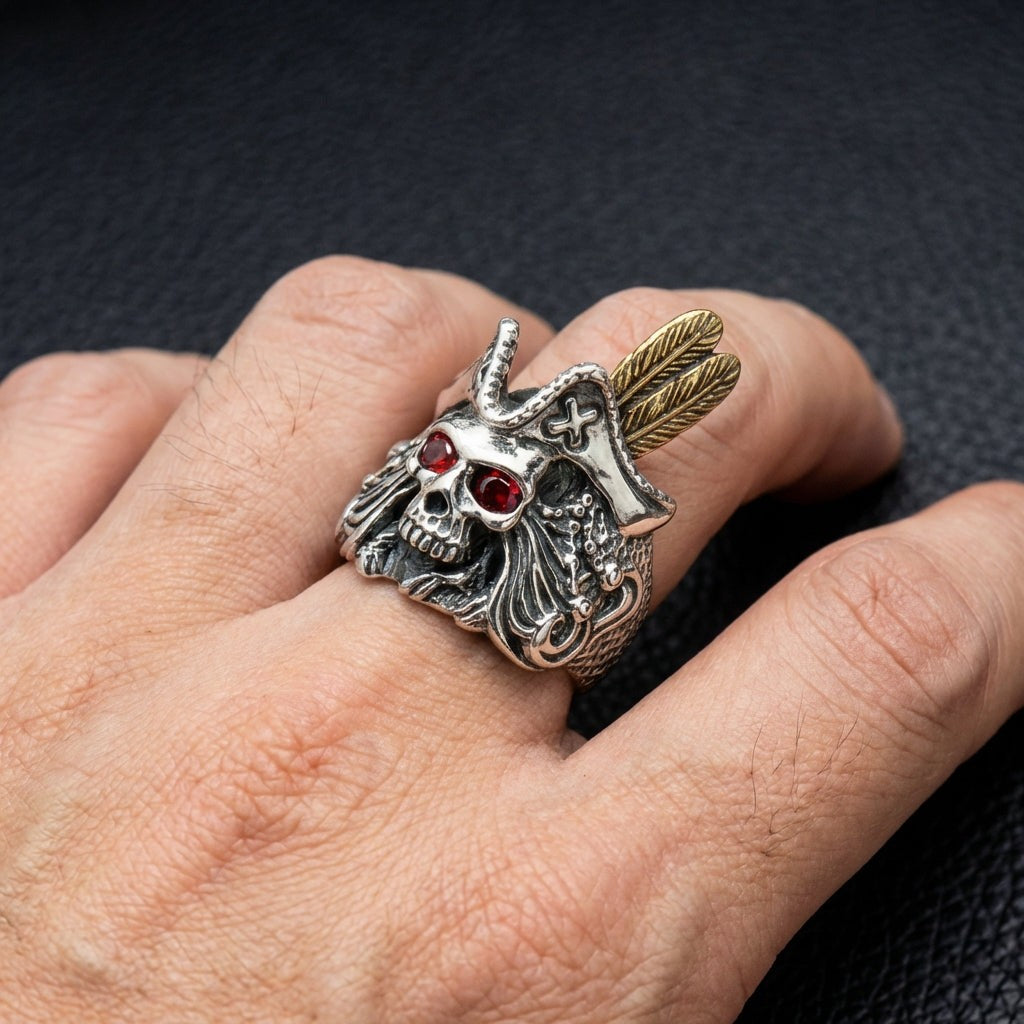 Acest inel uimitor surprinde portretul complet al unui temut și extravagant căpitan pirat. Un craniu sumbru, cu orbite ce par să ardă asemenea rubinelor blestemate, privește amenințător de sub o pălărie tricorn clasică. Pălăria este decorată cu o cruce și o tentaculă de caracatiță—simboluri puternice ale pericolului, credinței și misterelor adâncurilor.