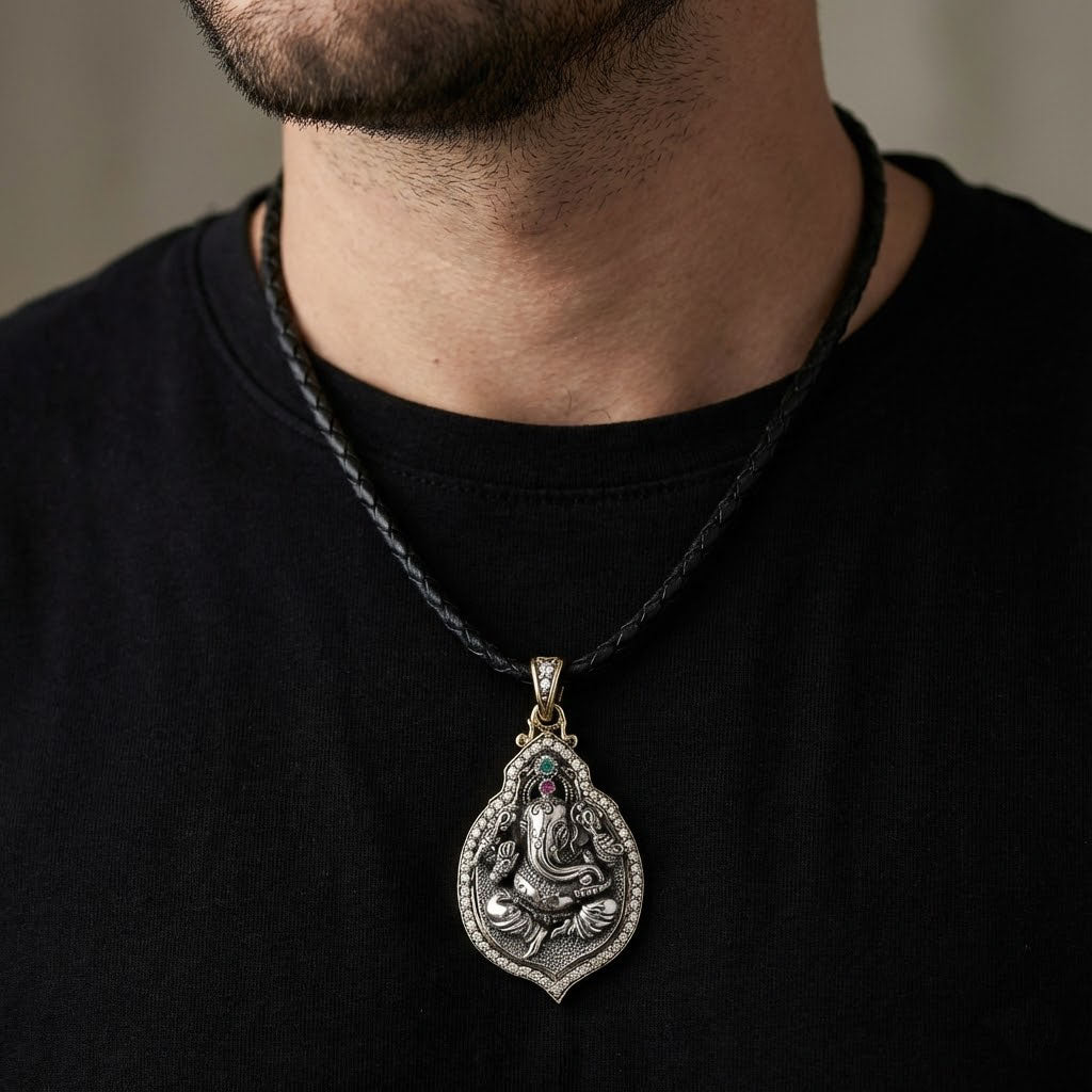 Celebrează eleganța și rafinamentul cu pandantivul nostru superb lucrat manual Ganesh din Argint Sterling. Realizat cu migală din argint sterling premium .925, acest pandantiv prezintă un motiv detaliat de elefant, simbolizând înțelepciunea și norocul. Împodobit cu pietre transparente strălucitoare de jur împrejur și accentuat cu pietre roz și pietre verzi captivante, acest pandantiv radiază frumusețe și farmec spiritual. Măsurând 30mm x 53mm și cântărind 19 grame, oferă o prezență substanțială, dar este suficient de confortabil pentru purtare zilnică. Finisat elegant cu detalii placate cu aur pe spate, fiecare piesă este lustruită la perfecțiune și include un șnur împletit din piele neagră de 18” (3mm grosime) pentru a putea fi purtat imediat. Marcajul .925 asigură autenticitatea și calitatea execuției. Ideal ca dar cu semnificație sau accesoriu sofisticat.
