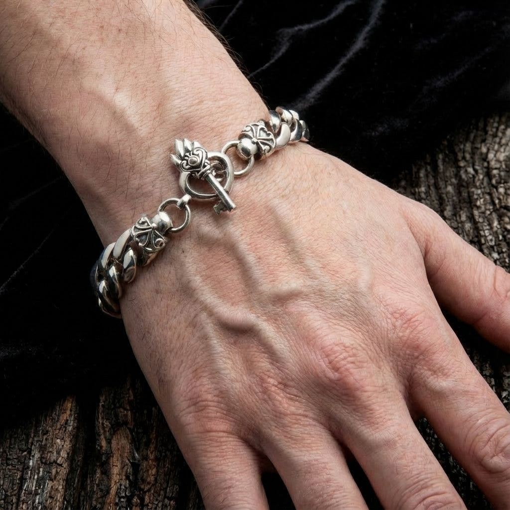 Sufletul acestei brățări se află în închiderea sa magnifică și profund simbolică. Nu este o închizătoare obișnuită, ci o poveste de devotament. Închiderea specială toggle prezintă o cheie ornamentată care trece printr-o inimă gotică, în flăcări. Împreună, creează o reprezentare puternică a simbolului atemporal „cheia inimii mele”—simbol al iubirii exclusive, al încrederii și al unei promisiuni de neclintit. Această piesă centrală spectaculoasă este completată de un lanț cubanez clasic, robust, de 10mm, simbol al forței de neclintit. Cu o greutate de 42 de grame, această capodoperă din argint masiv este o fuziune perfect echilibrată între arta romantică întunecată și forța masculină brută.
