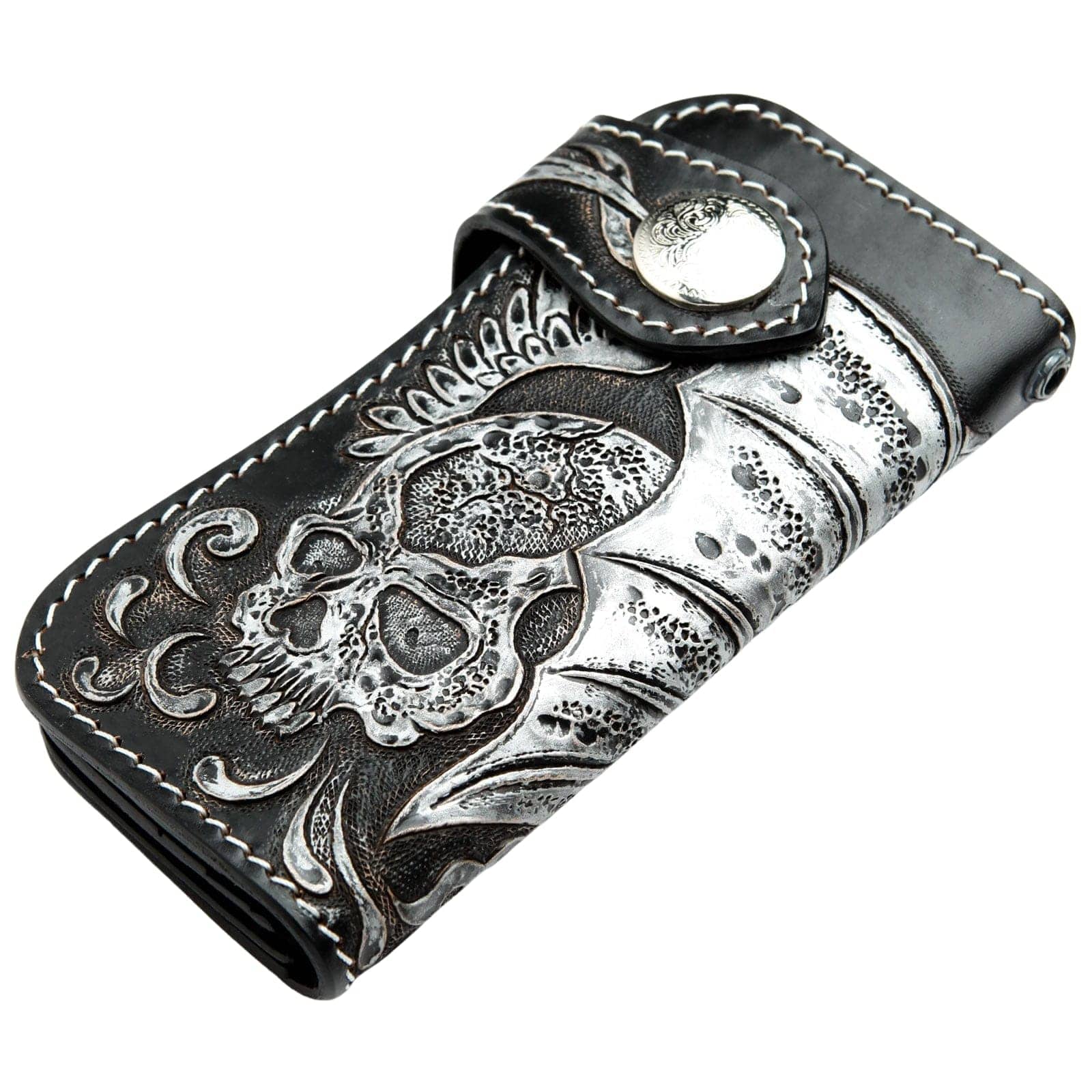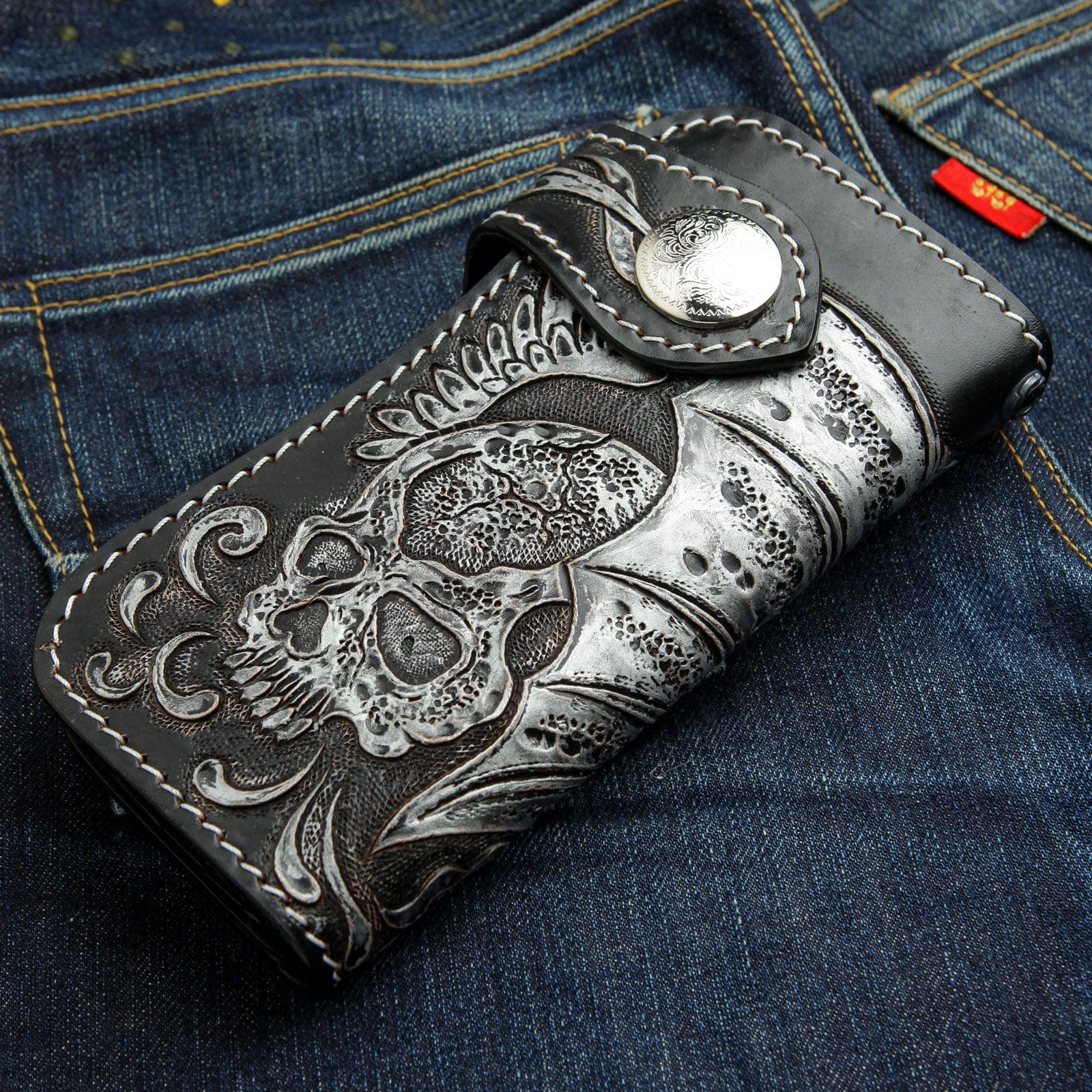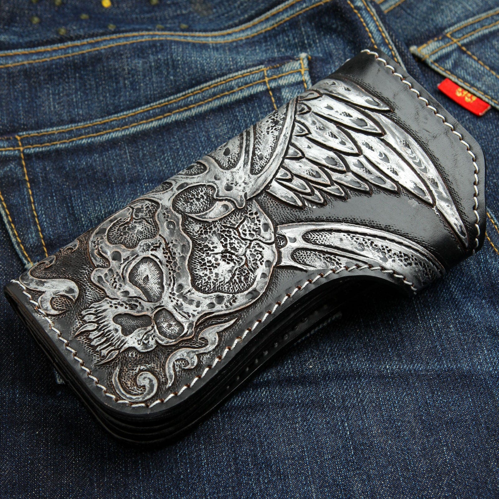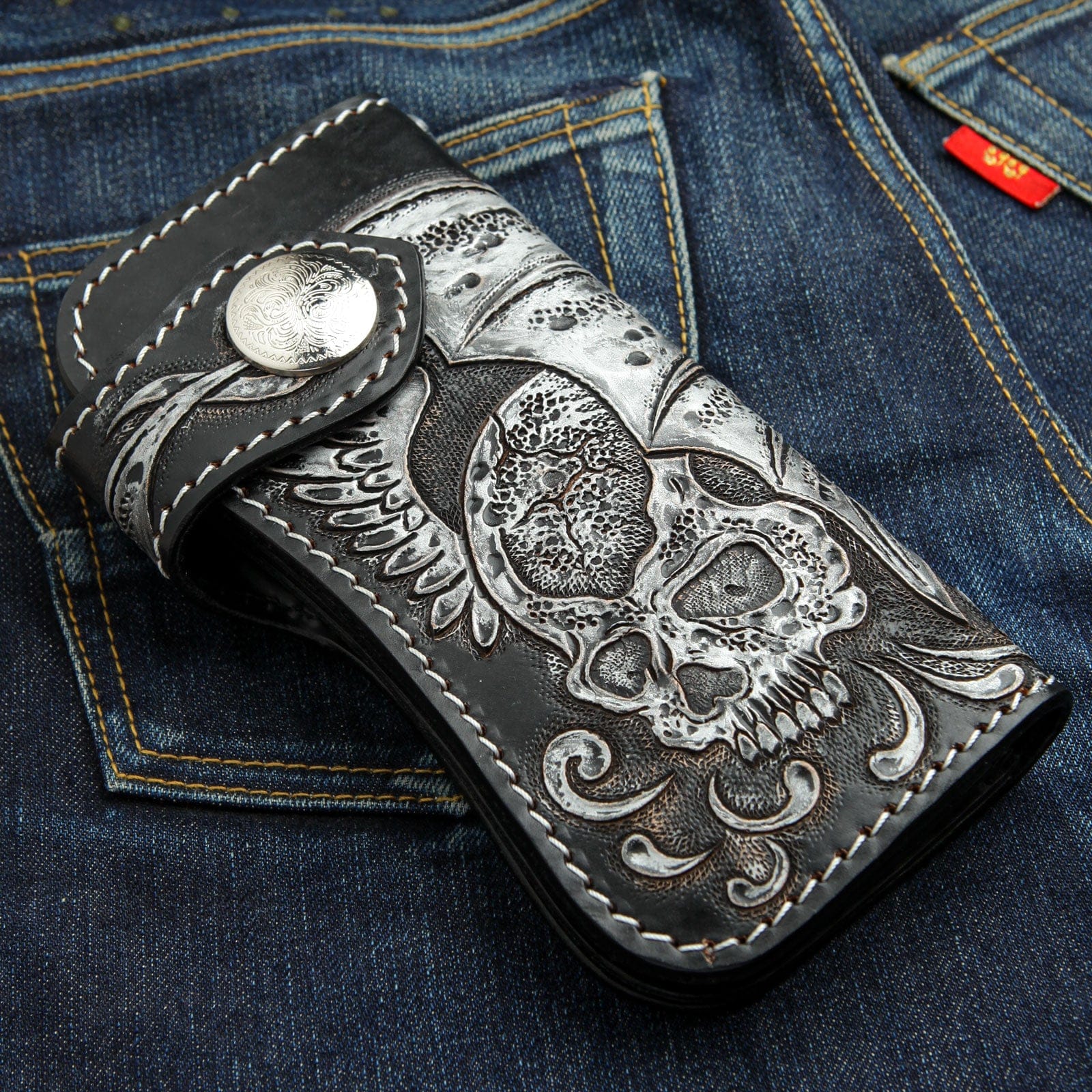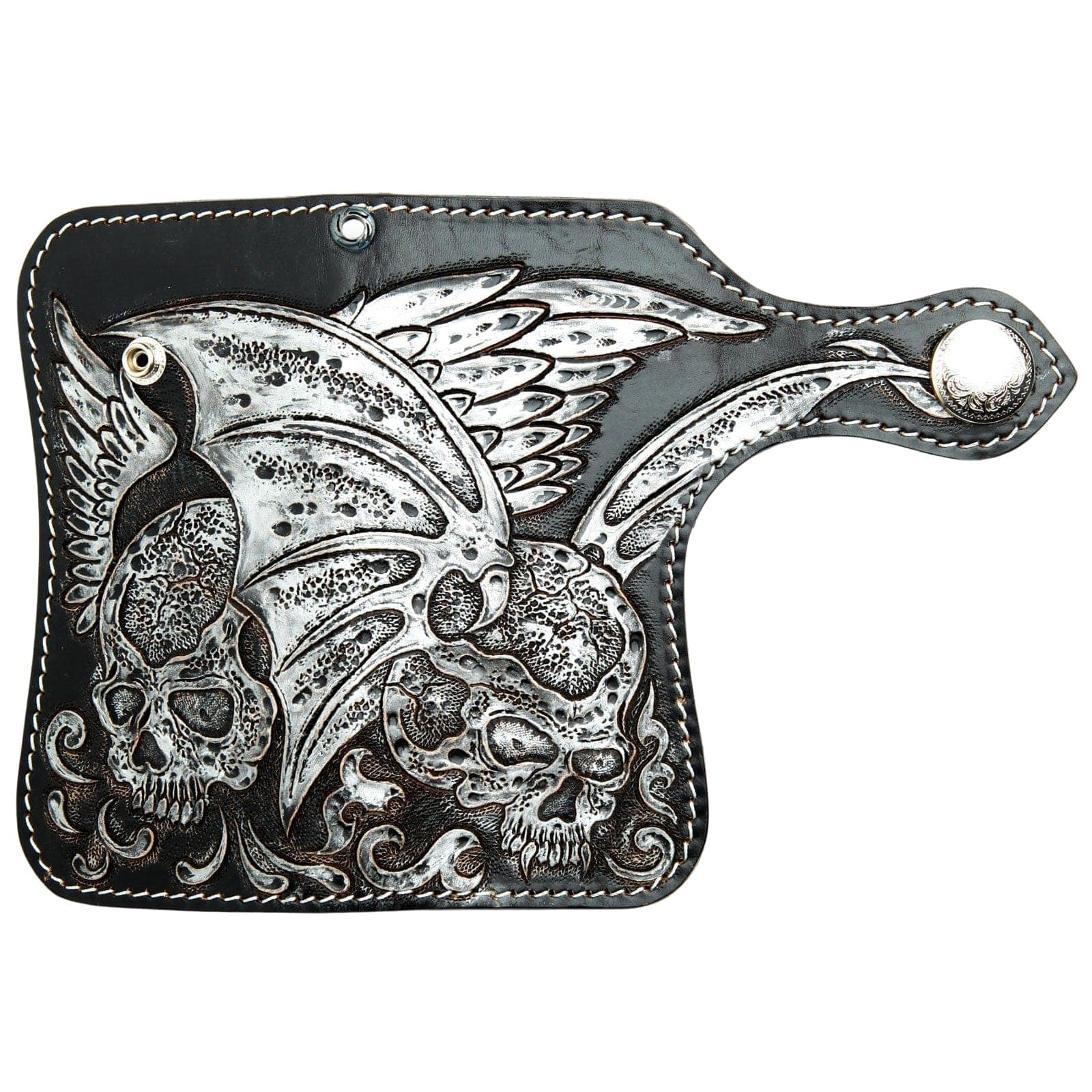 Portofel Biker din piele, sculptat manual, cu craniu înaripat