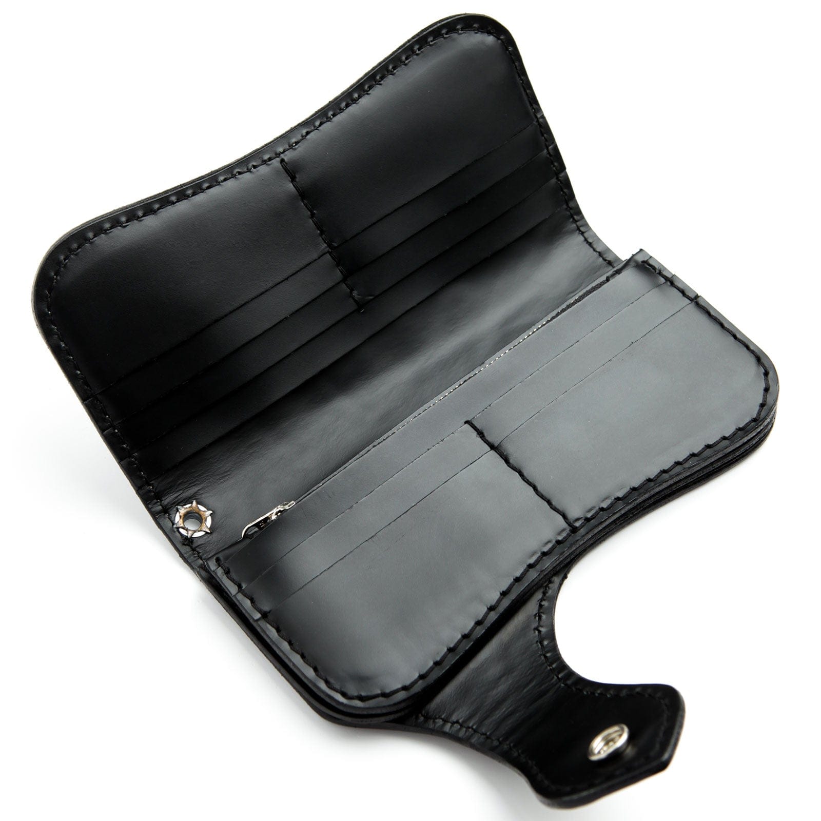 Sculptura detaliată, gri-argintie, iese în evidență pe pielea neagră intensă, creând un efect vizual spectaculos, tridimensional, pe care îl poți simți. Aceasta este măiestria pielăriei durabile la cel mai înalt nivel, creată pentru bărbatul care apreciază adevărata artă și un portofel de motociclist cu adevărat distinct.