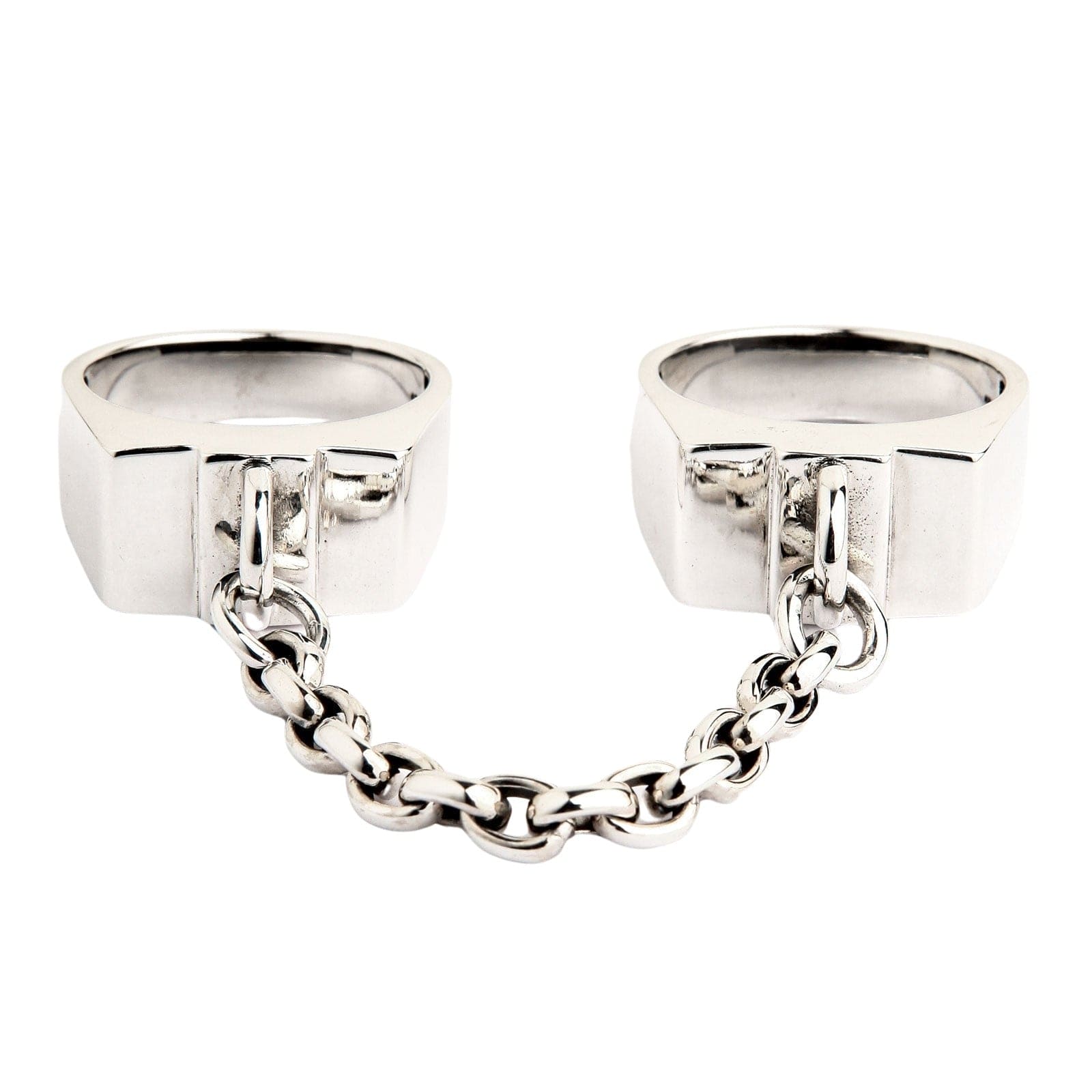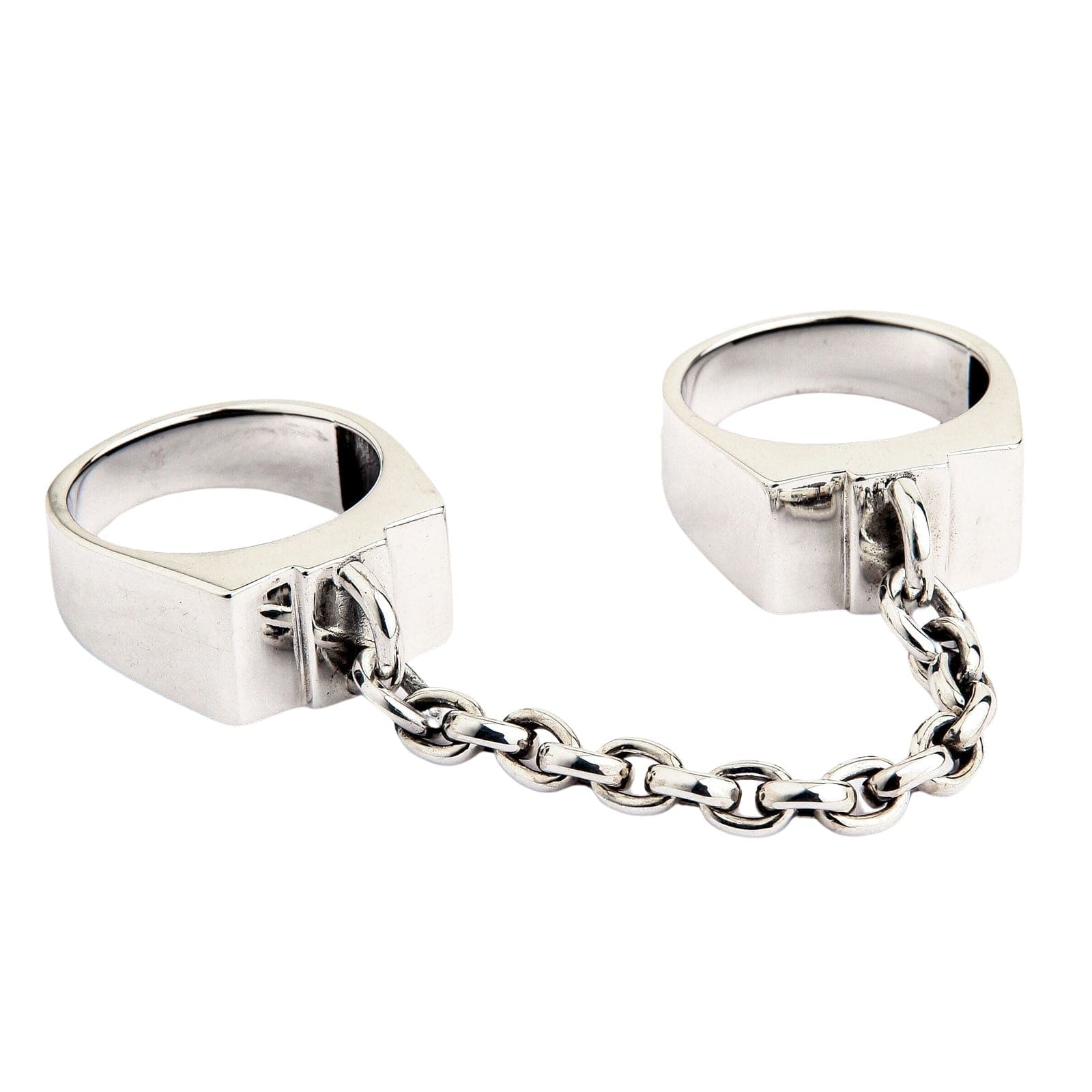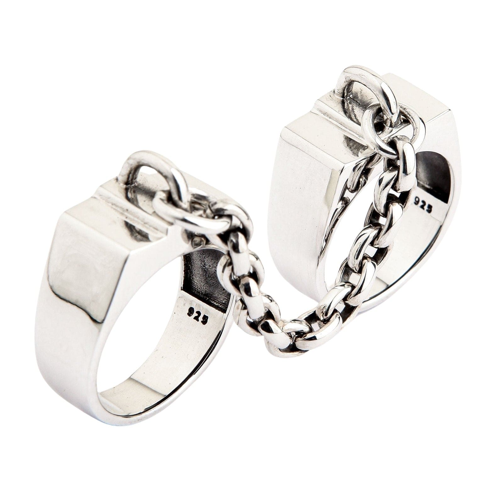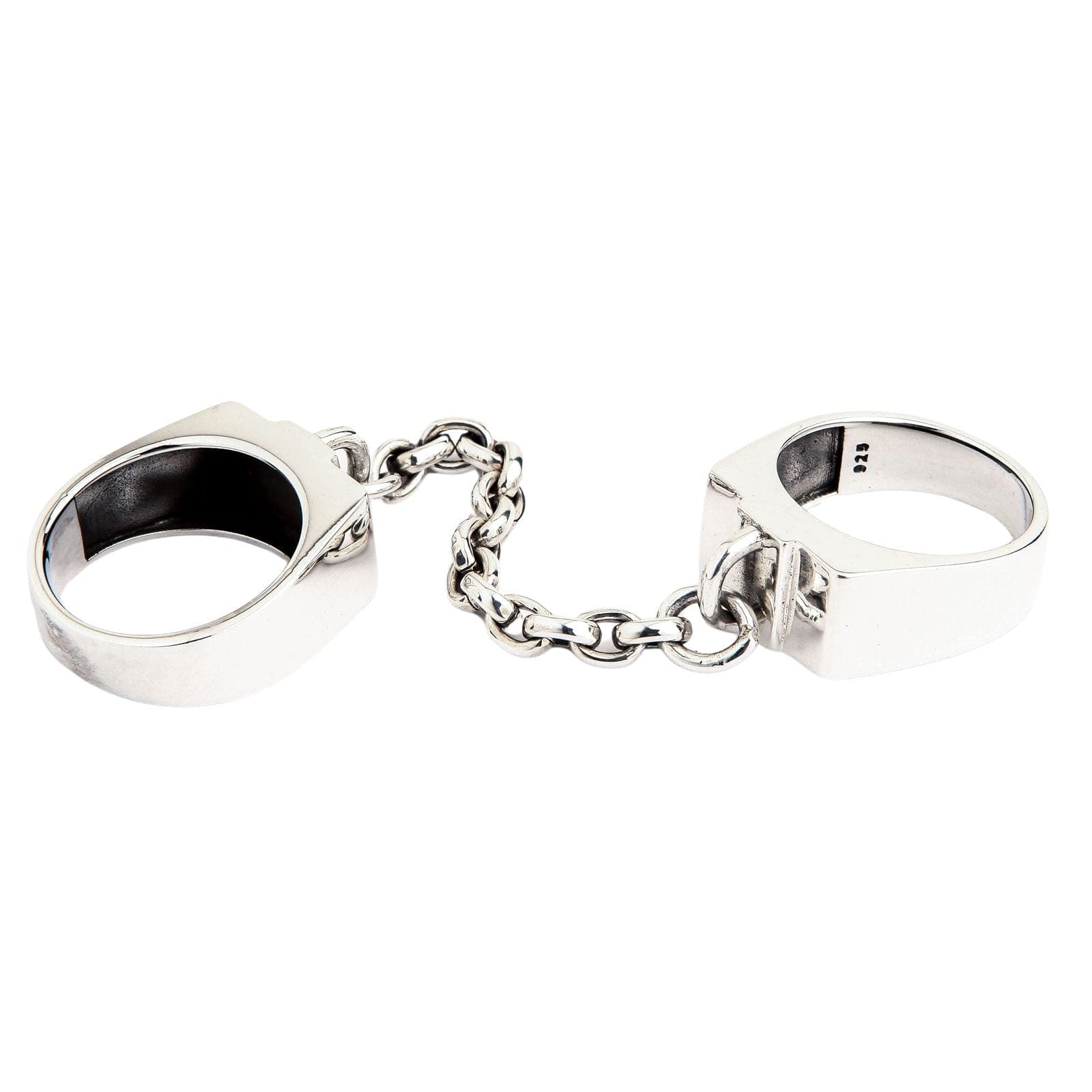 ⛓️ Design Distinctiv cu Verigi: Un inel unic și provocator pentru două degete, format din două benzi solide stilizate ca cătușe, unite printr-un lanț rezistent din argint masiv.