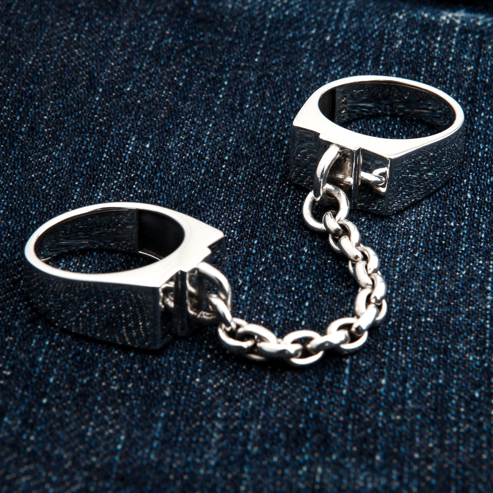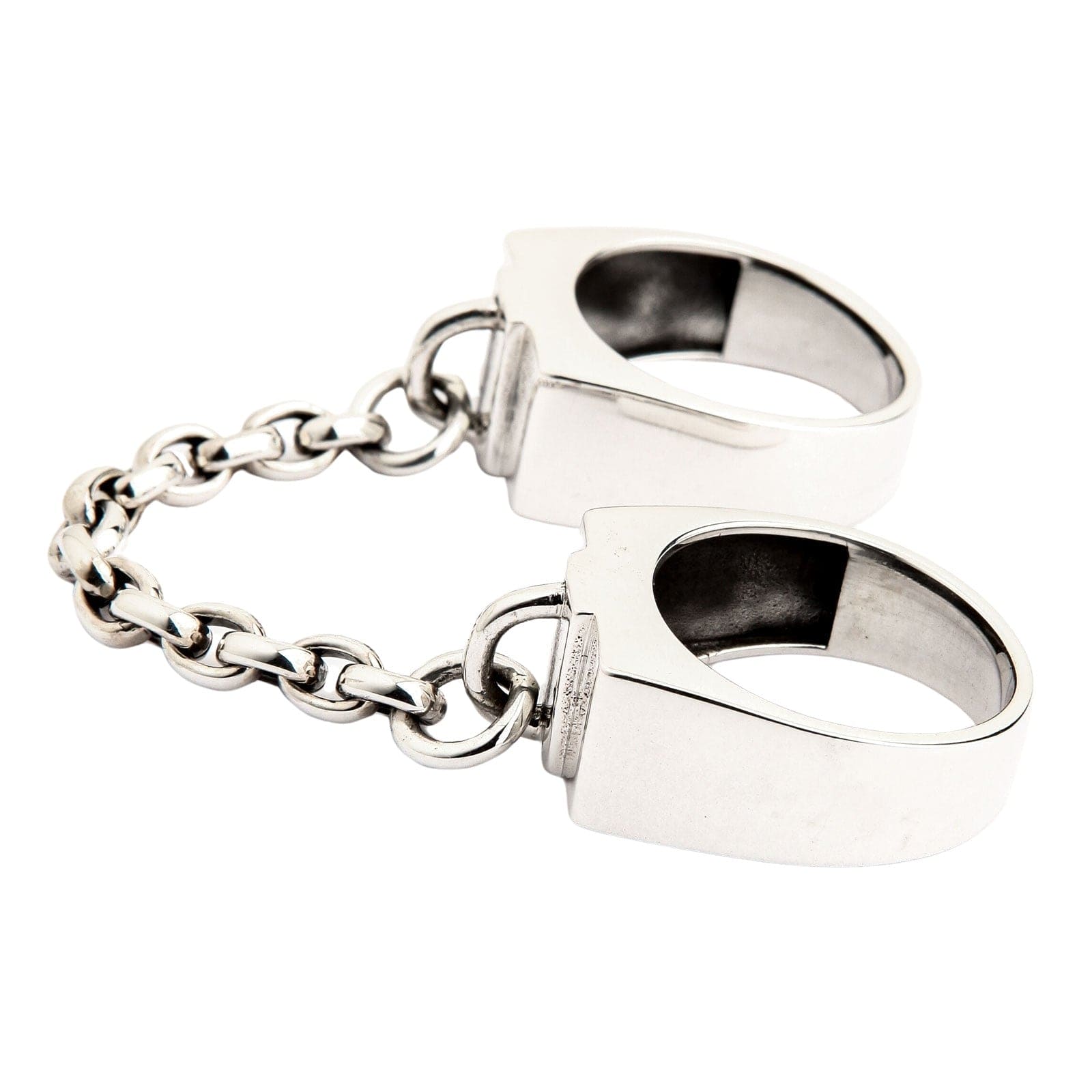 Geniul acestei piese constă în simplitatea sa puternică și directă. Două benzi masive, lustruite, modelate precum niște cătușe moderne, sunt concepute să fie purtate pe degete alăturate. Ele sunt unite permanent printr-un lanț scurt și robust din argint 925, creând o siluetă îndrăzneață și provocatoare. Acest design este un omagiu direct adus esteticii punk rock și industriale, simbolizând o legătură de neîntrerupt și un spirit sfidător. Construcția inelului este la fel de necruțătoare ca și mesajul său, fiind forjat dintr-o cantitate impresionantă de 23 grame de argint masiv 925. Liniile sale curate și finisajul strălucitor îi conferă o eleganță brutalistă, transformându-l într-o piesă de artă purtabilă, minimalistă și imposibil de ignorat.