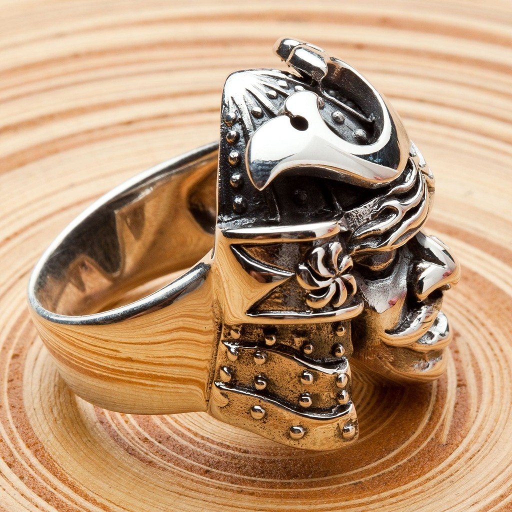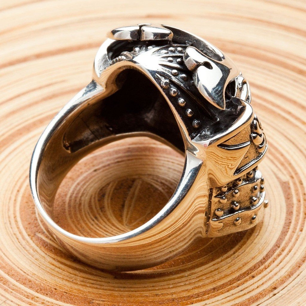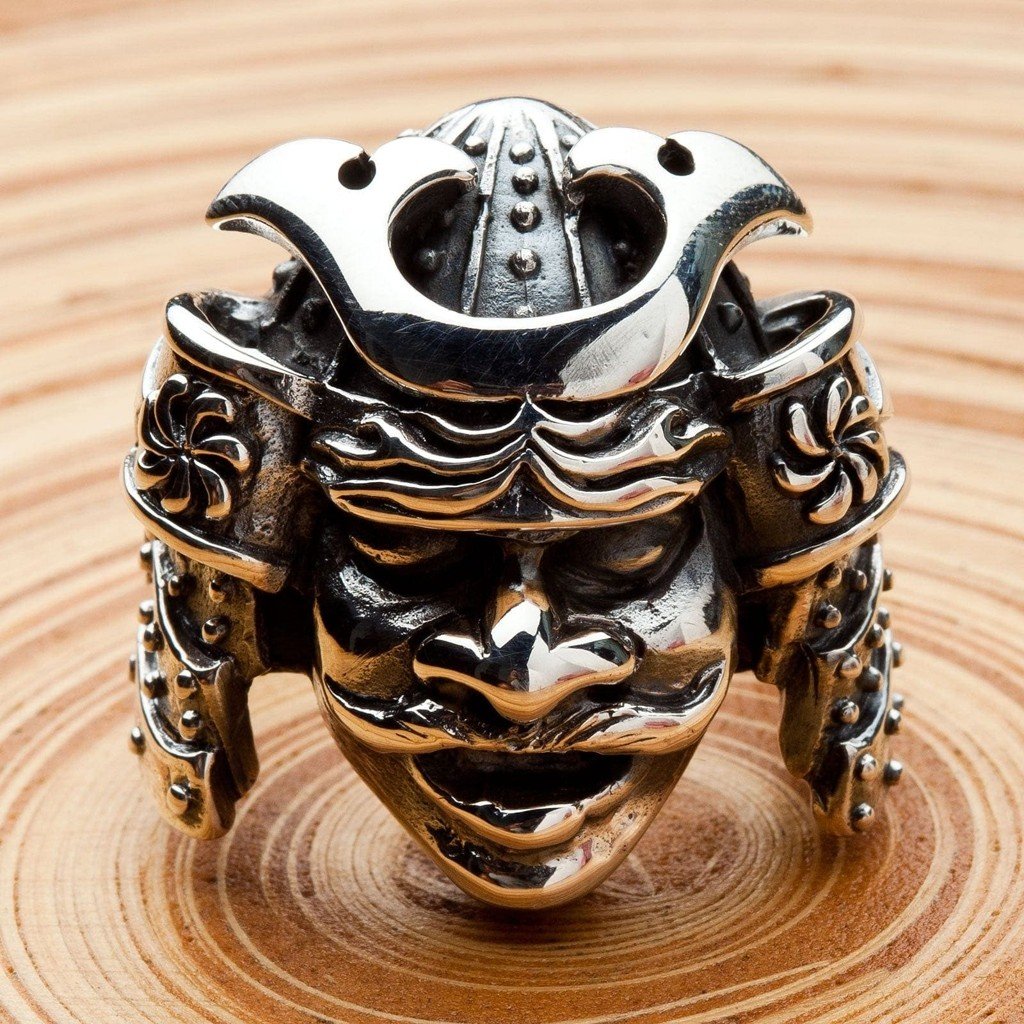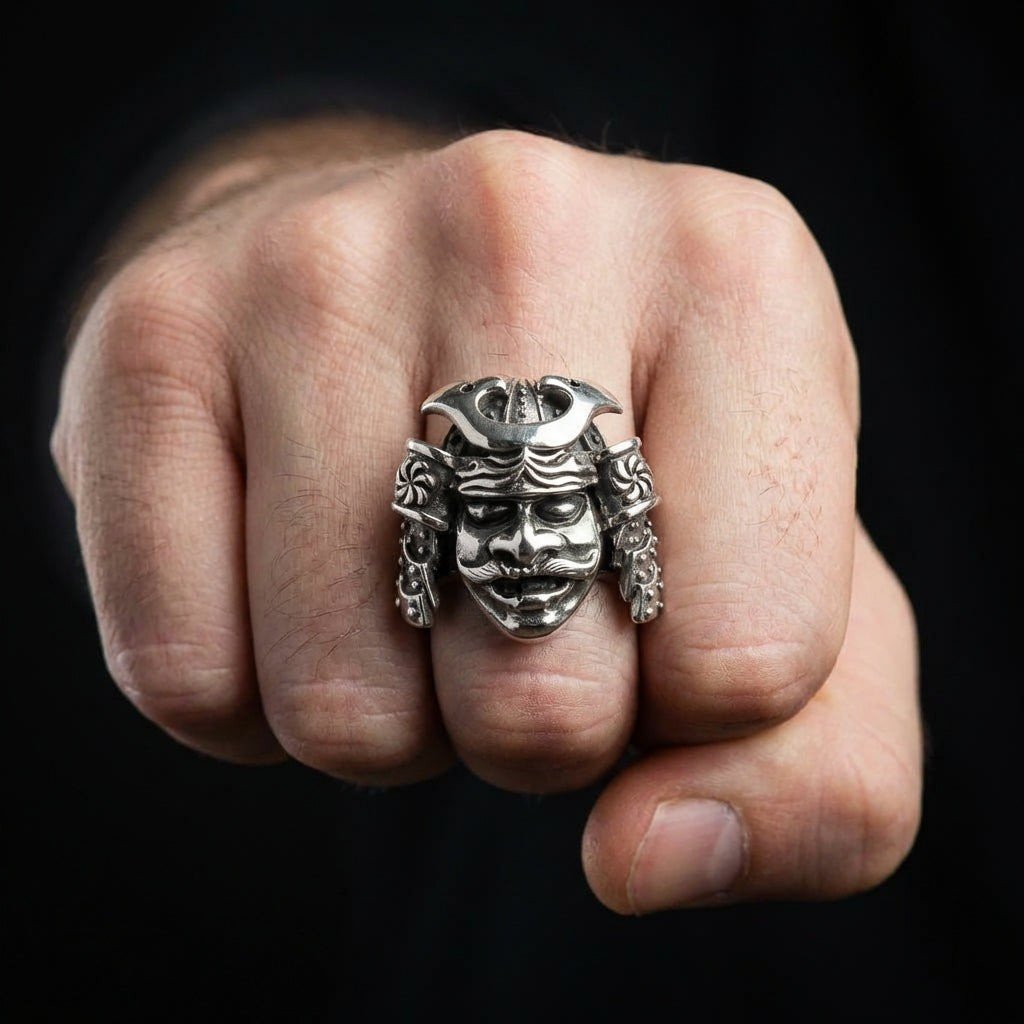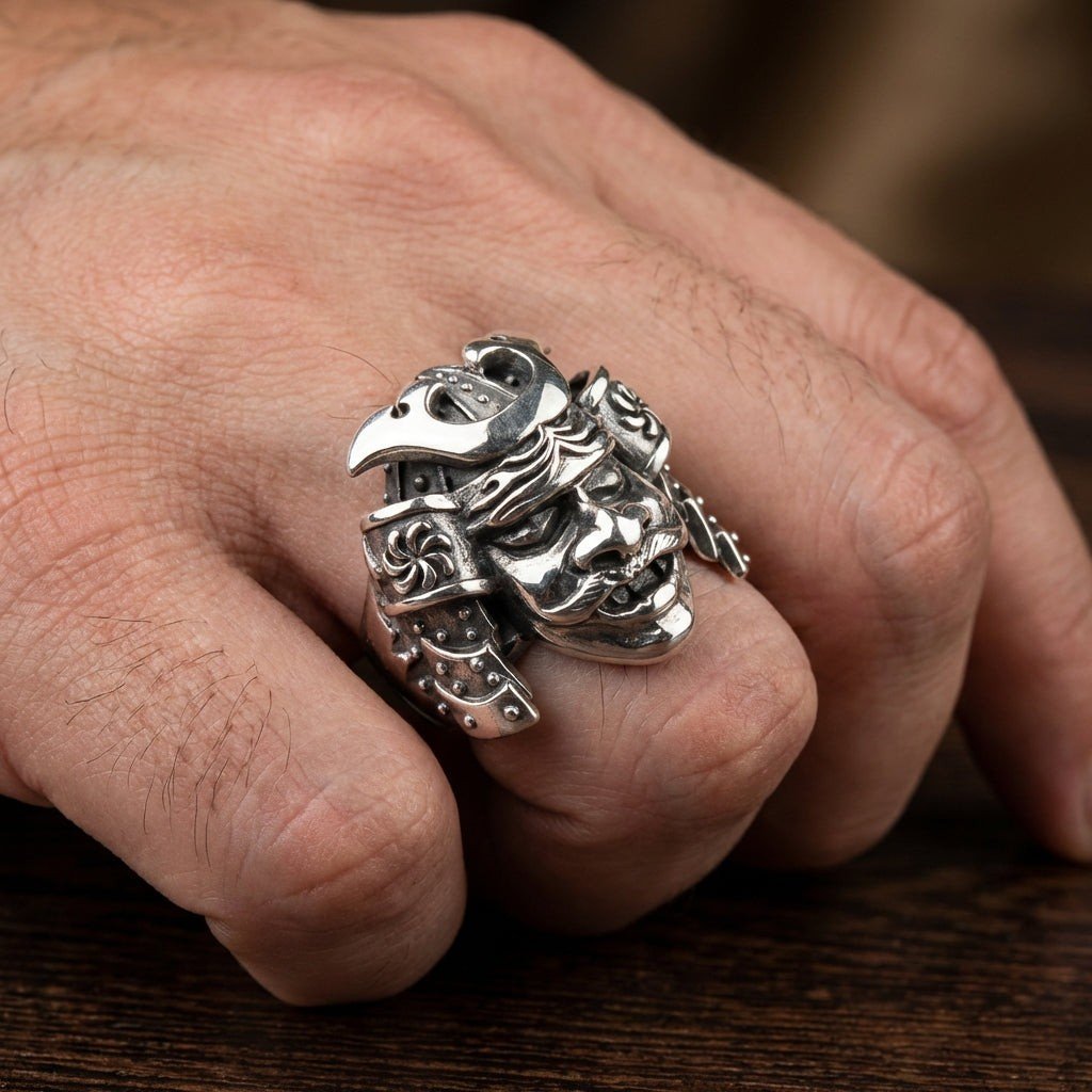 Fiecare detaliu al acestui inel a fost sculptat cu măiestrie pentru a surprinde spiritul unui samurai tradițional. Designul prezintă un kabuto (coif) clasic și o men-yori (mască), cu o privire feroce și intimidantă care impune respect. Argintarii noștri folosesc o combinație dinamică de finisaj lustruit și accente oxidate întunecate pentru a da viață detaliilor complexe ale armurii, oferind piesei o profunzime și un realism uimitor.