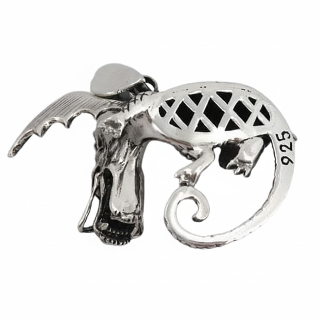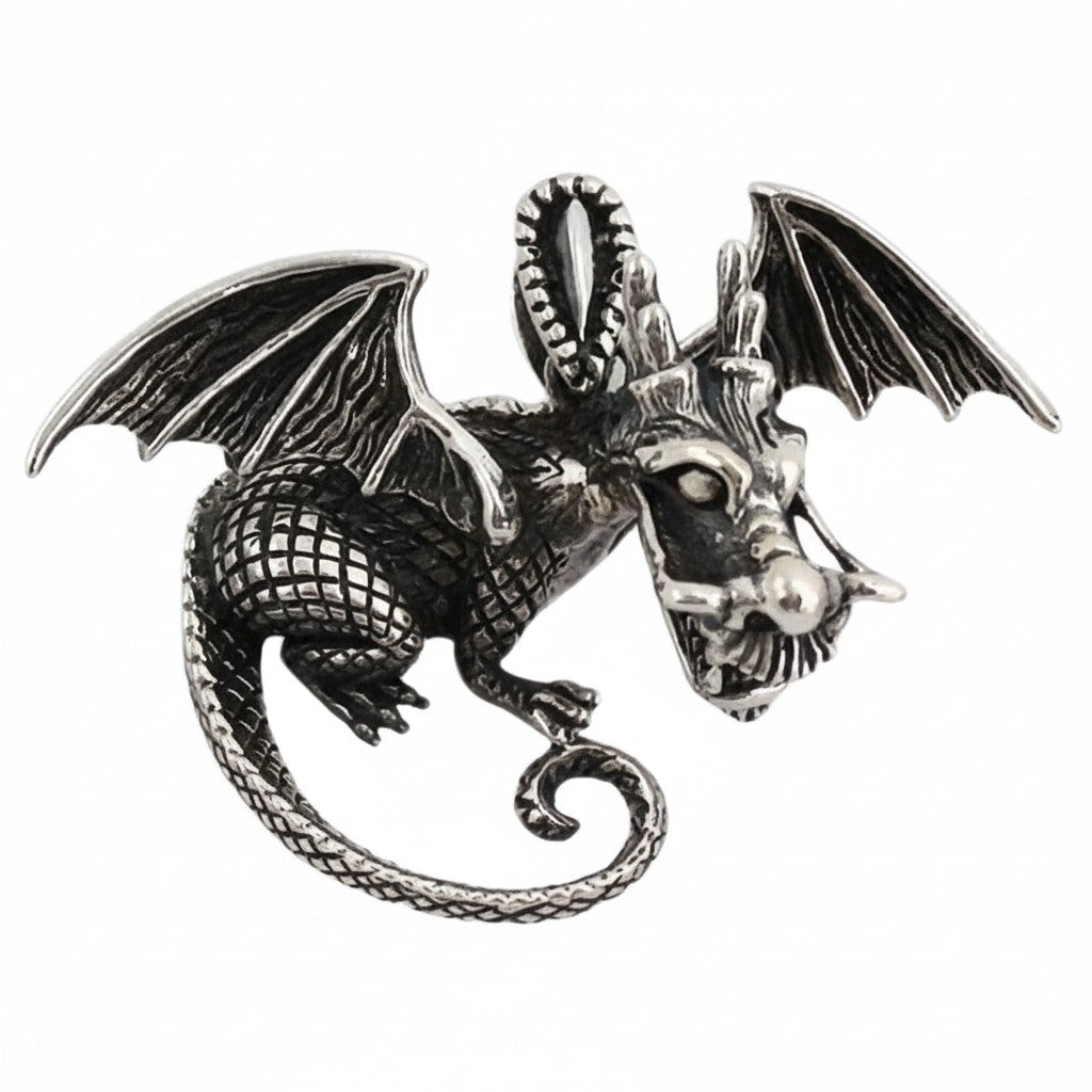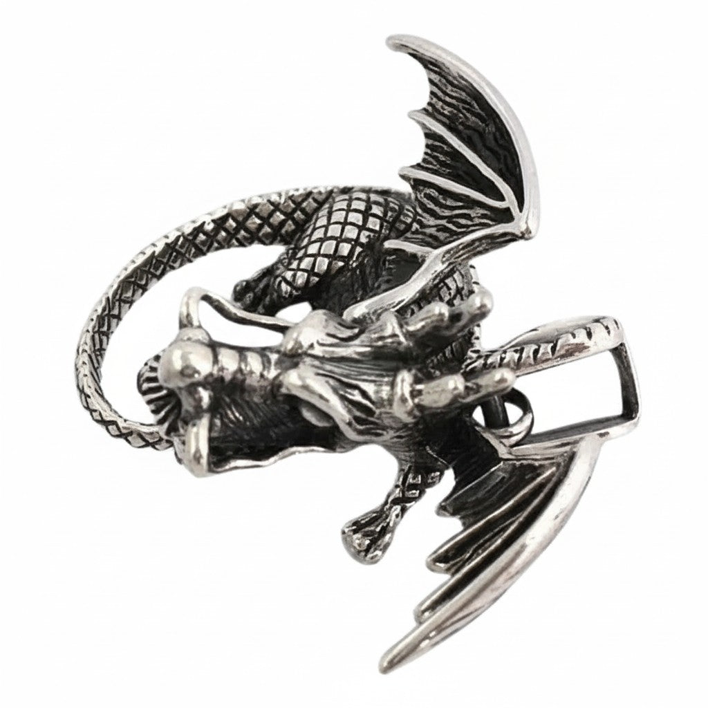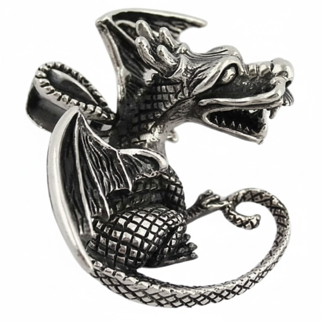 Acest pandantiv este o adevărată capodoperă de artă mitologică, aducând la viață un dragon vestic legendar în detalii uimitoare. Creatura este surprinsă într-o postură puternică, cu gura deschisă într-un răget sfidător. Fiecare element, de la solzii sculptați individual pe spate până la textura pielii aripilor sale puternice, este redat cu un realism incredibil. Întreaga piesă este tratată cu un finisaj oxidat întunecat, care pătrunde în sculpturile adânci, creând un contrast spectaculos cu accentele de argint lustruit. Cântărind un impresionant 30 de grame, această bijuterie din argint masiv are greutatea și prezența autoritară a bestiei mitice pe care o reprezintă. Este o adevărată declarație de putere pentru războinicul modern.