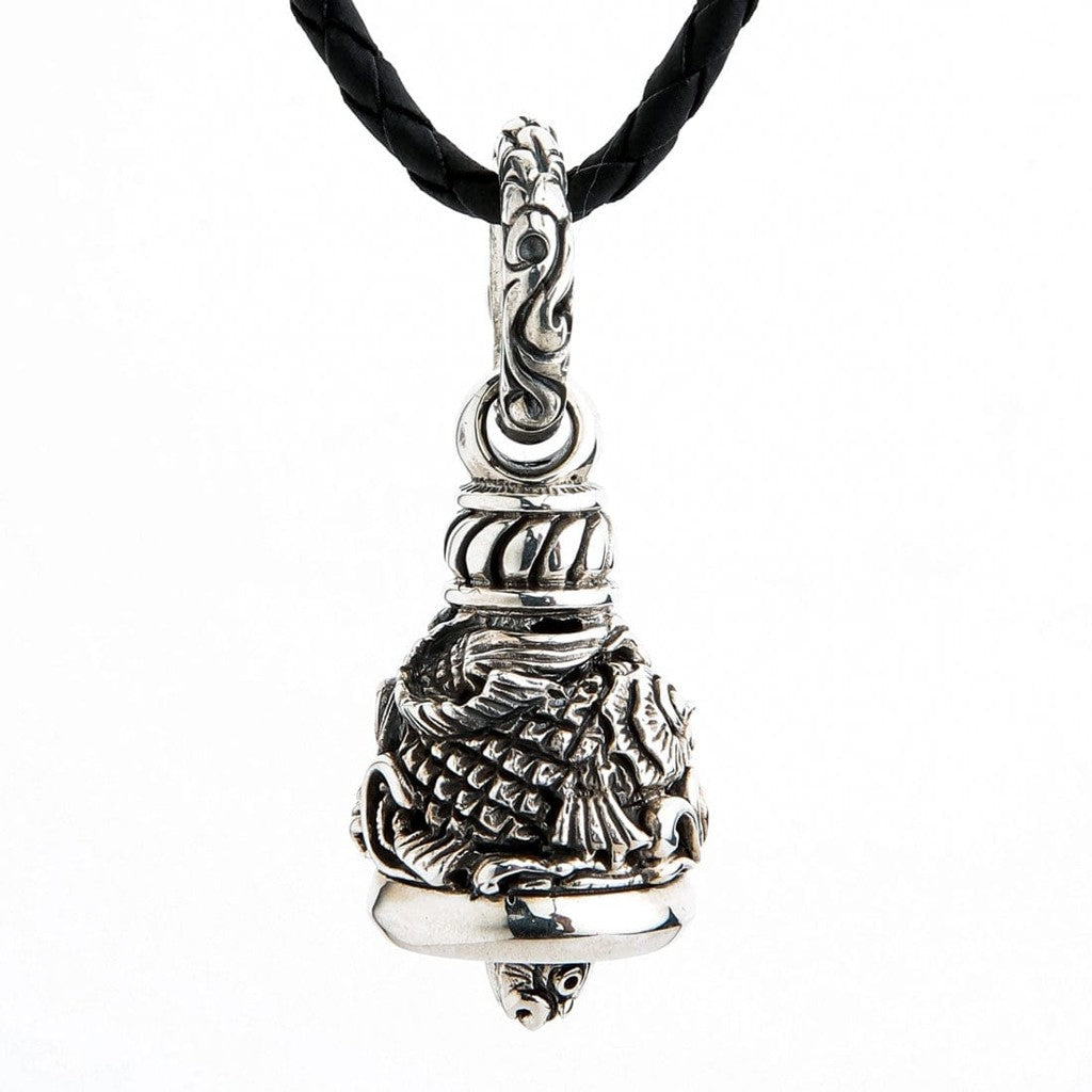 Acest talisman uimitor este realizat manual din 26 de grame de argint masiv, asigurând un sunet clar și pur. În interior, un mic clopoțel cu cap de koi continuă tema, adăugând un detaliu artistic și fermecător. Întreaga piesă, de la solzii detaliați ai koi-ului până la anoul ornamentat, este finisată lustruit și oxidat pentru profunzime incredibilă și un aspect robust, antic. Descoperă mai mulți protectori puternici în colecția noastră Guardian Bells.