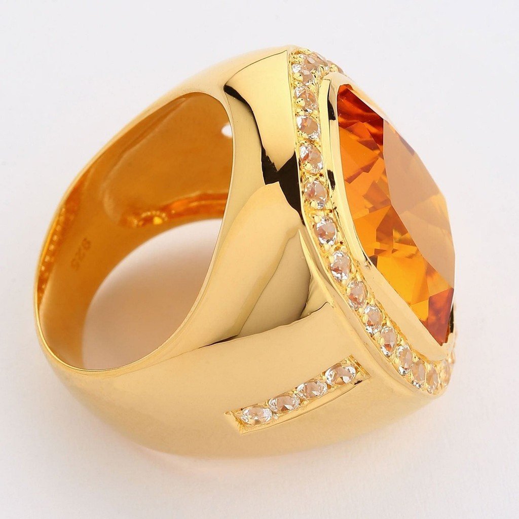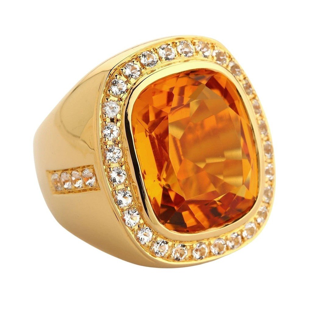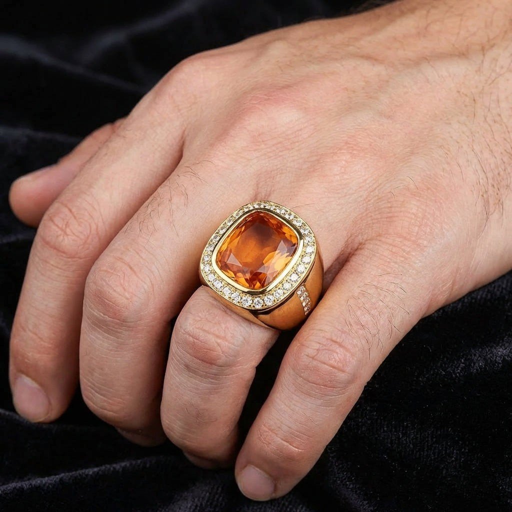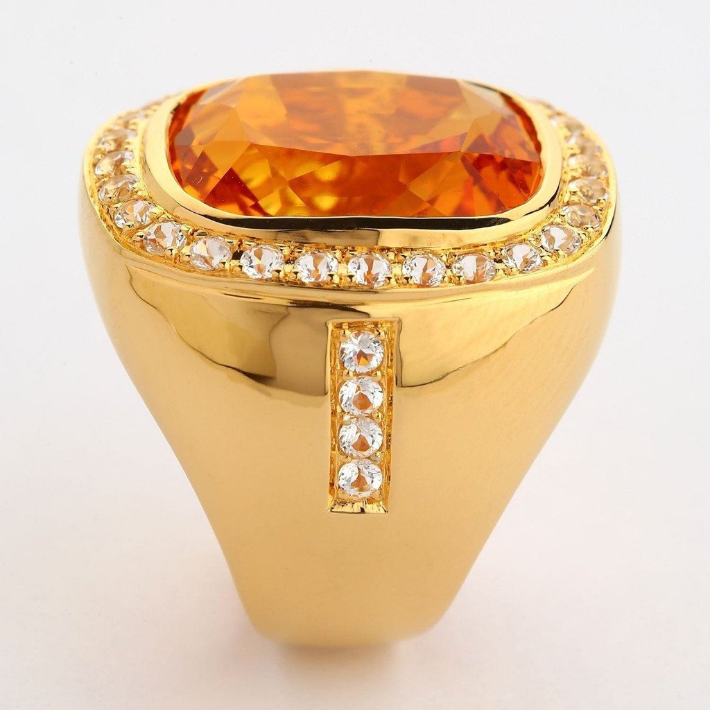 Răsfață-te cu lux și rafinament alături de Inelul bărbătesc uriaș cu citrin natural, meticulos lucrat pentru a evidenția eleganța masculină cu o strălucire captivantă. Având o piatră prețioasă citrin natural de 21 de carate, într-o nuanță șampanie impresionantă, încadrată superb de un halou de safire albe strălucitoare, acest inel exemplifică luxul rafinat, fiind ideal pentru orice bărbat cu gusturi distinse.