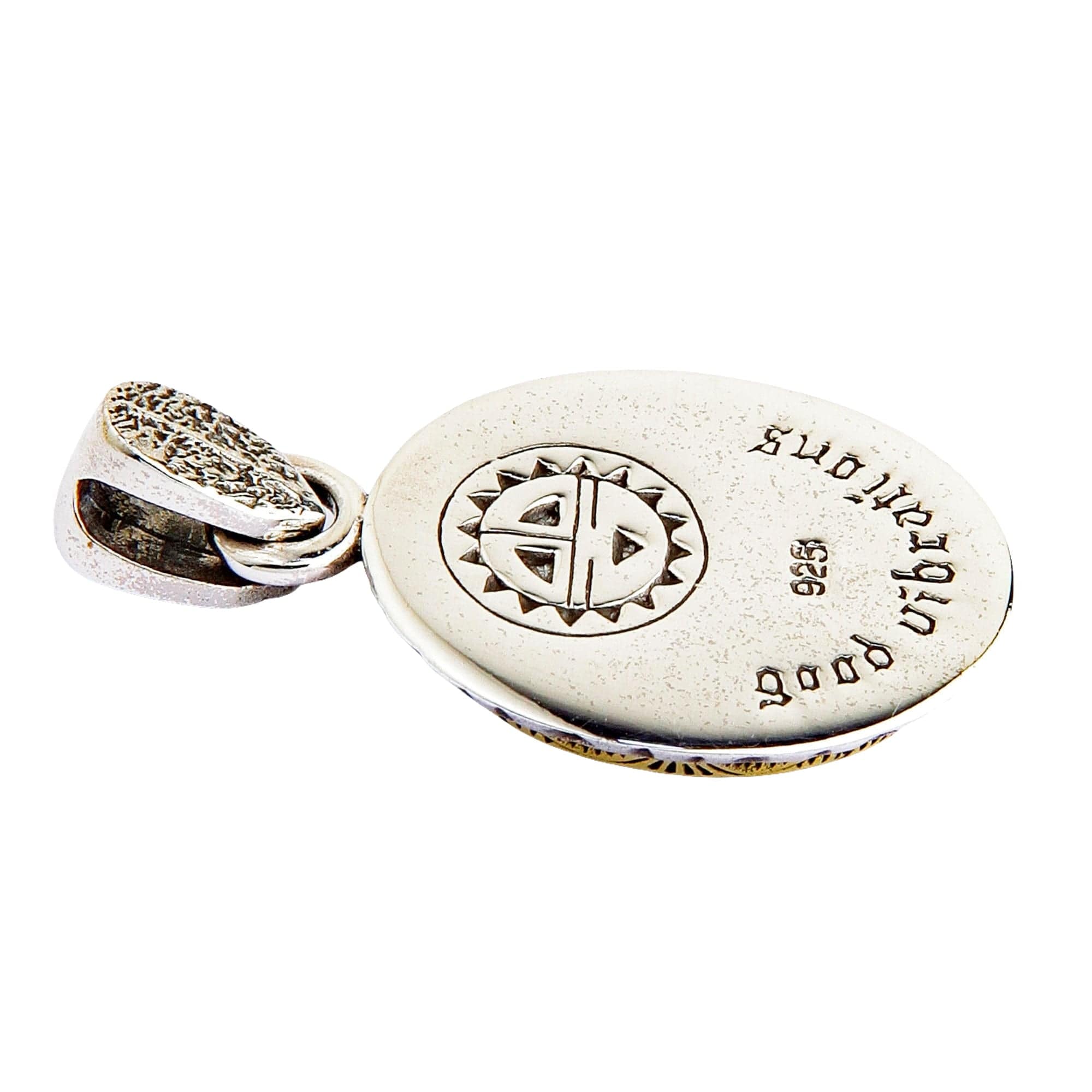 Dar povestea nu se oprește aici. Spatele pandantivului dezvăluie un simbol solar Zia, care reprezintă cele patru direcții sacre, înconjurat de mesajul cald „good vibrations”. Este o amuletă ce amintește să îmbrățișezi bucuria și să trăiești în armonie.