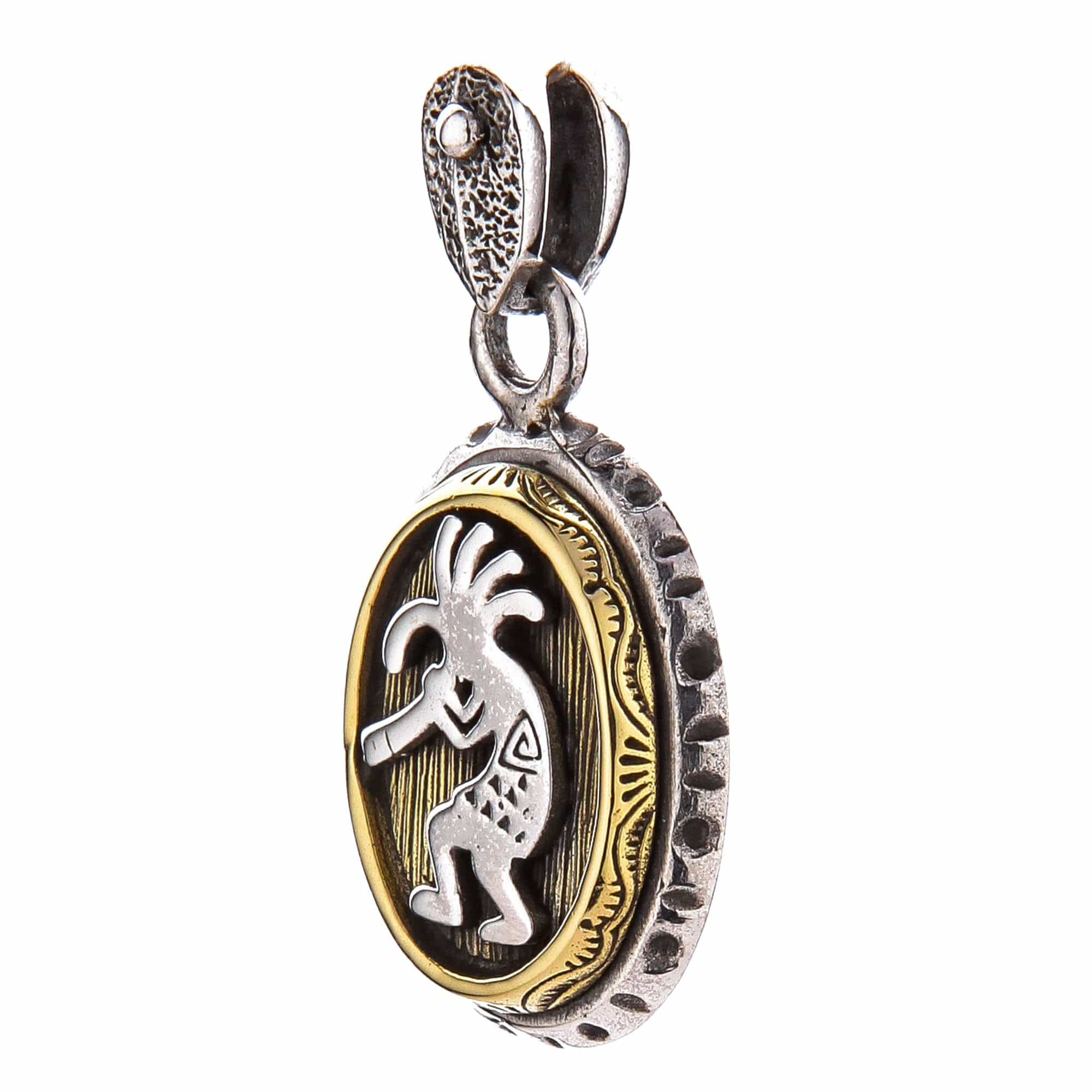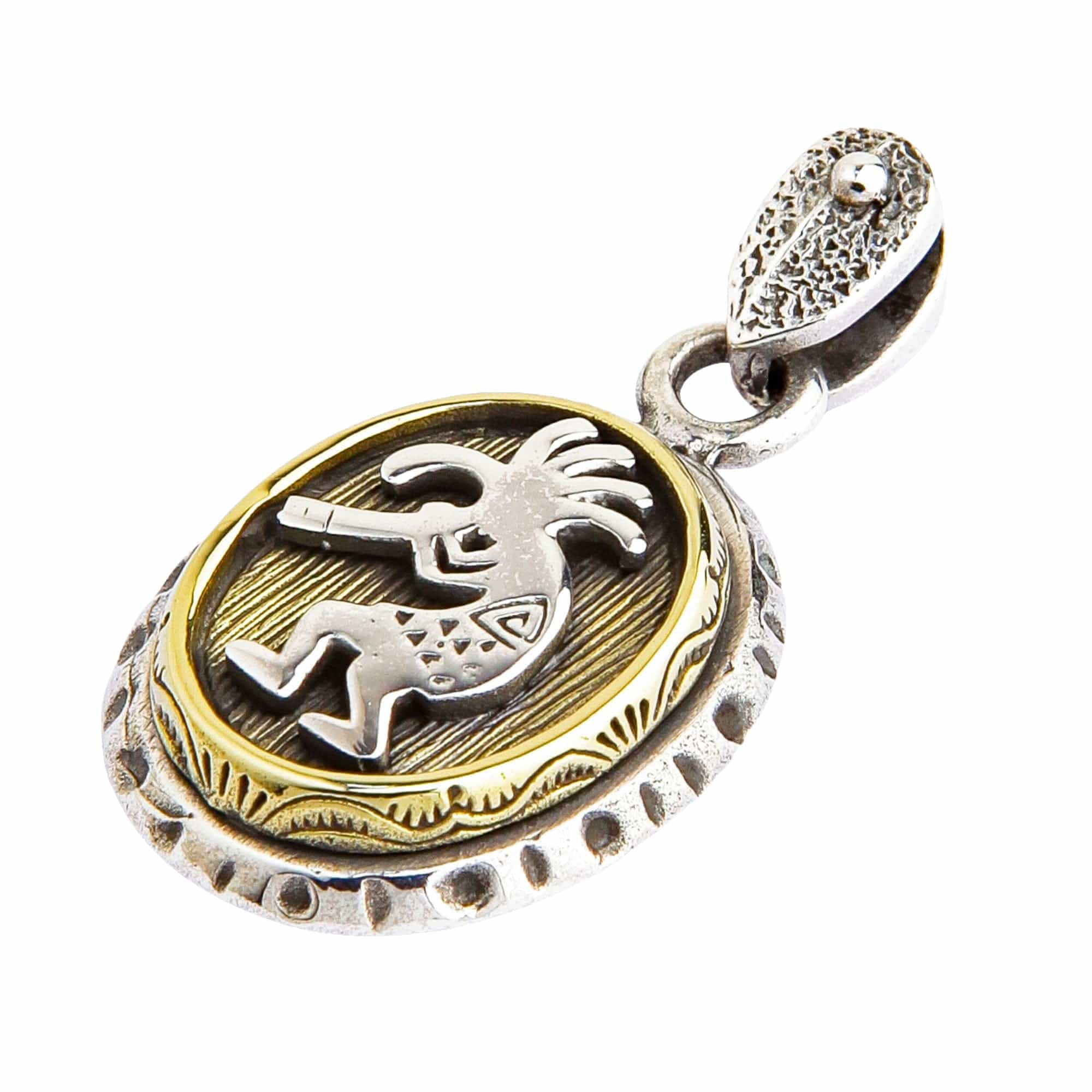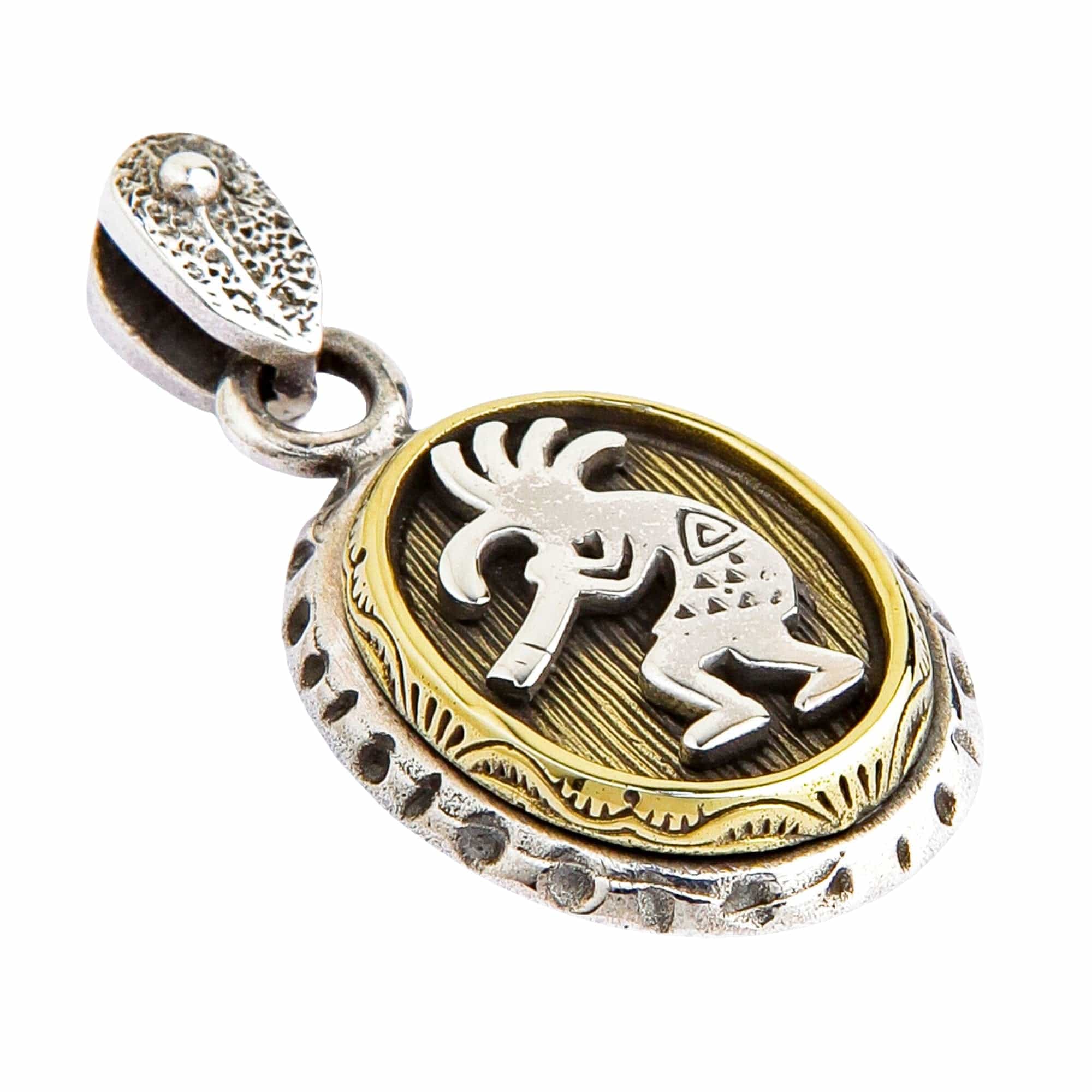 Acest pandantiv lucrat manual spune o poveste din orice unghi. Partea din față prezintă celebrul fluieraș cocoșat, Kokopelli, o figură venerată în cultura Pueblo. Este redat în argint lustruit pe un fundal de alamă texturată, simbolizând călătoria sa de a răspândi muzică și abundență. Rama rustică din argint oxidat și anoul adaugă o notă atemporală, pământească.