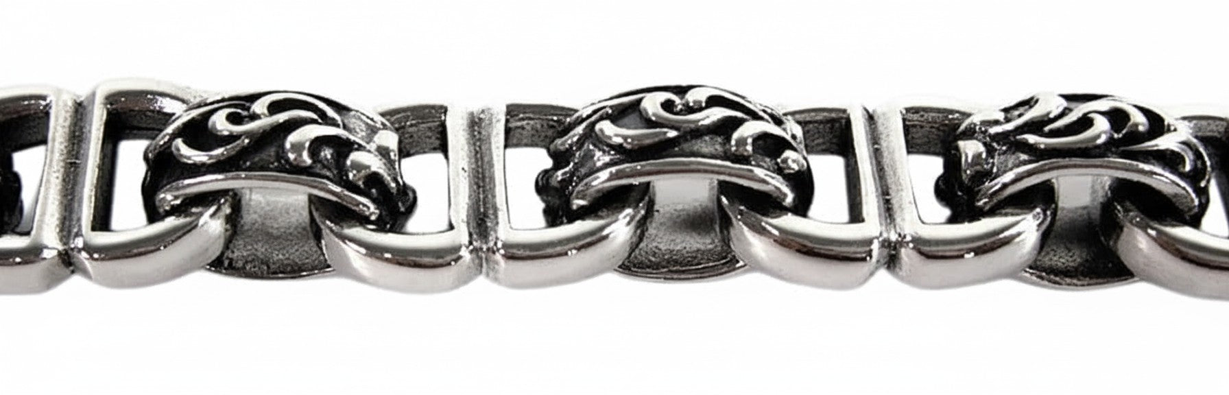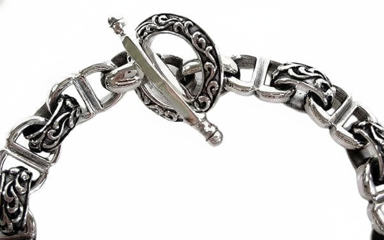 Acesta nu este doar o brățară; este o declarație de 65 de grame de măiestrie detaliată. Brățara noastră Ornate Toggle este realizată din argint masiv 925 pentru bărbatul care apreciază arta purtabilă, substanțială. Definită de motive tribale adânci și de o închizătoare robustă, decorativă, această piesă iese în evidență în orice colecție de bijuterii biker sau gotice.