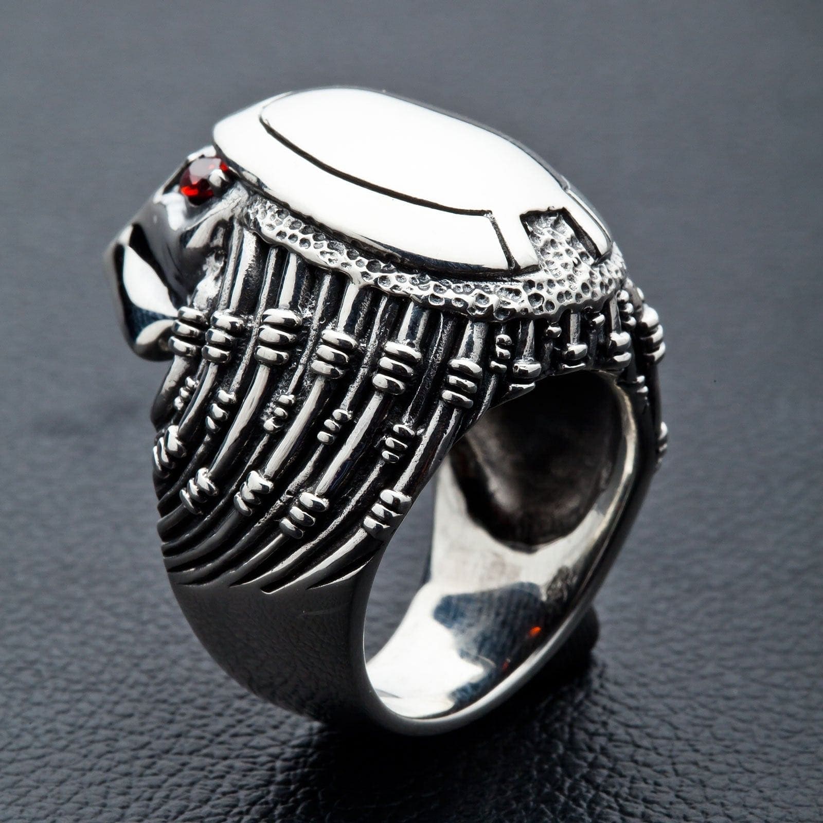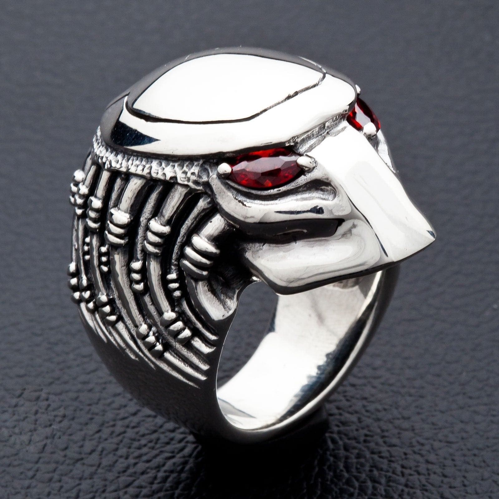 Î: Ce reprezintă ochii roșii de pe inel? R: Cele două pietre roșii strălucitoare de pe acest inel predator din argint sterling reprezintă celebrul sistem de țintire cu trei puncte laser al Yautja, folosit pentru a fixa prada înainte de atac. Această detaliere adaugă un plus de precizie amenințătoare și autenticitate designului, pe care adevărații fani îl vor aprecia.