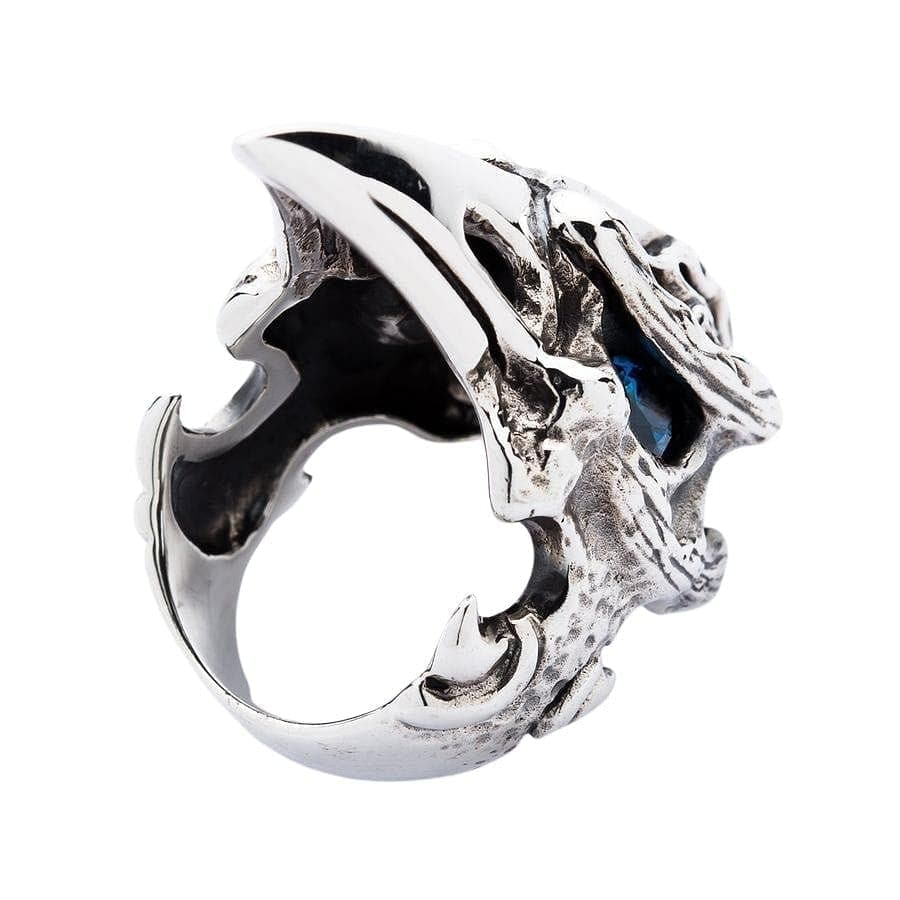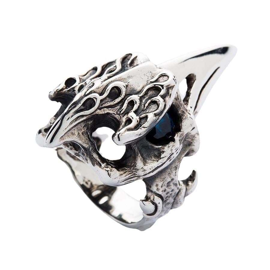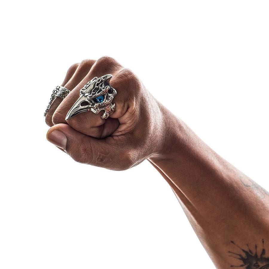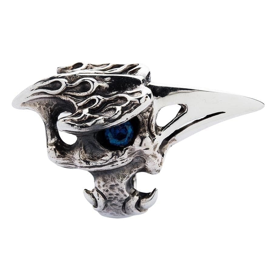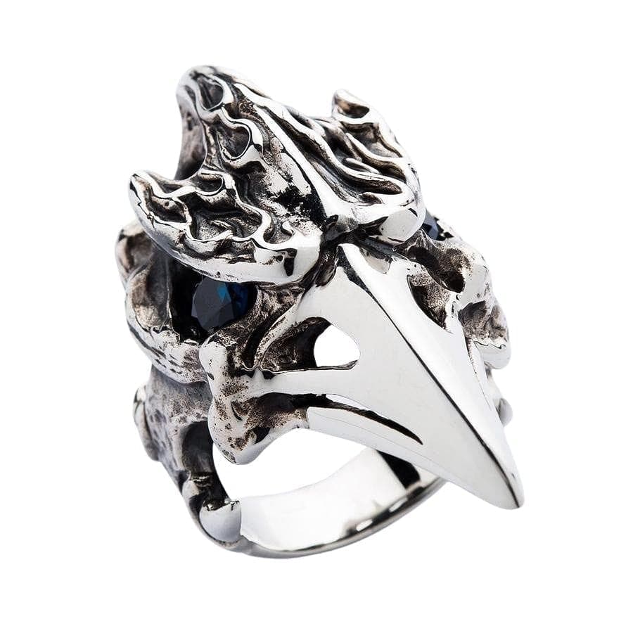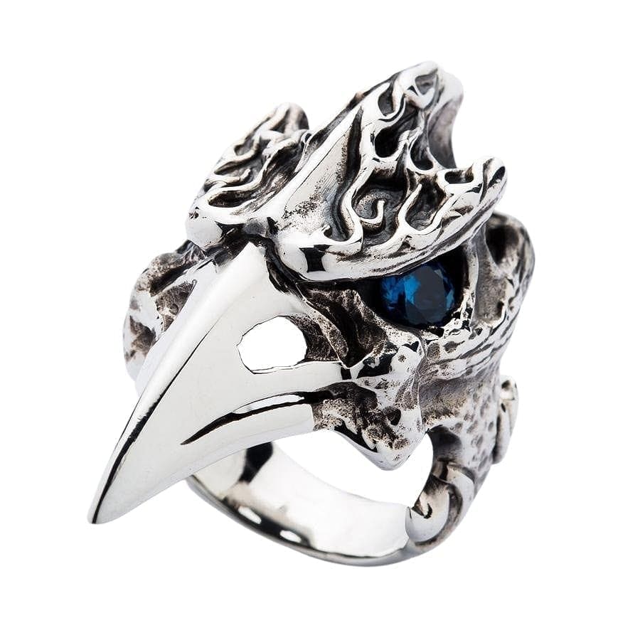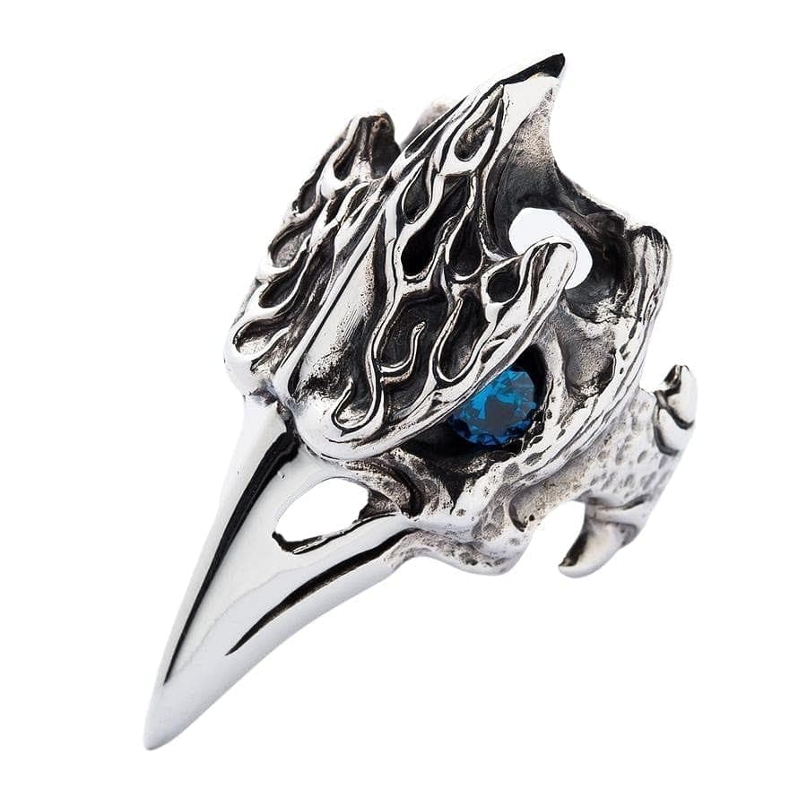 Acesta este un inel plin de atitudine. Inspirat de mitologia nordică și de corbii atotvăzători ai lui Odin, Huginn și Muninn, această piesă este un talisman al inteligenței și profeției. Designul este o combinație uimitoare de texturi: craniul este sculptat cu flăcări gotice și os rugos, oxidat, în timp ce ciocul lung și amenințător este lustruit până la o strălucire de oglindă. Sufletul inelului este ochiul său pătrunzător din piatră prețioasă topaz albastru, care strălucește cu o privire intensă, atotștiutoare, din orbita sa întunecată și goală. La 1x2 inch, aceasta este cu adevărat o piesă statement.