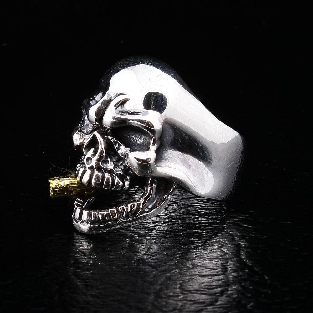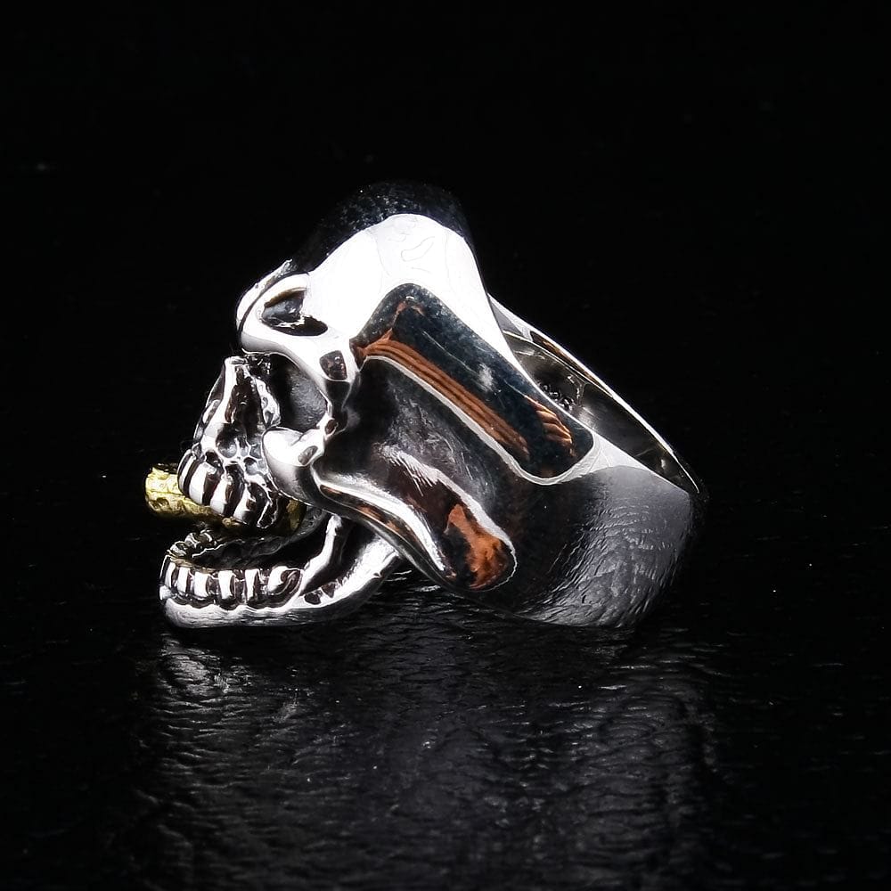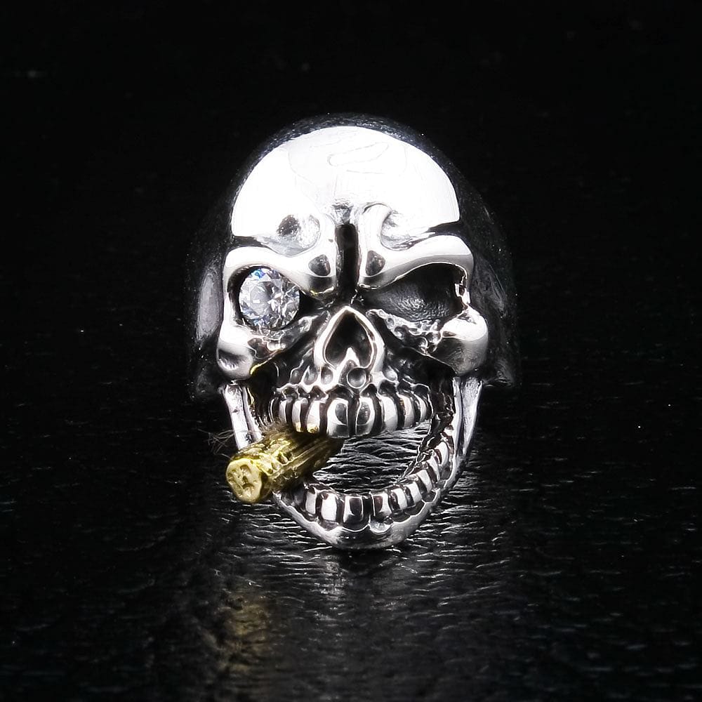 Designul surprinde esența sfidării și individualității – trăsături scheletice sculptate cu atenție, accente oxidate pentru profunzime și un trabuc realist cu tentă aurie pentru un plus de stil. Ochiul cu diamant CZ captează lumina, oferind un contrast izbitor cu argintiul robust, făcând acest inel să iasă în evidență din orice unghi. Perfect pentru motocicliști, iubitori ai modei gotice și oricine adoptă un stil neînfricat.