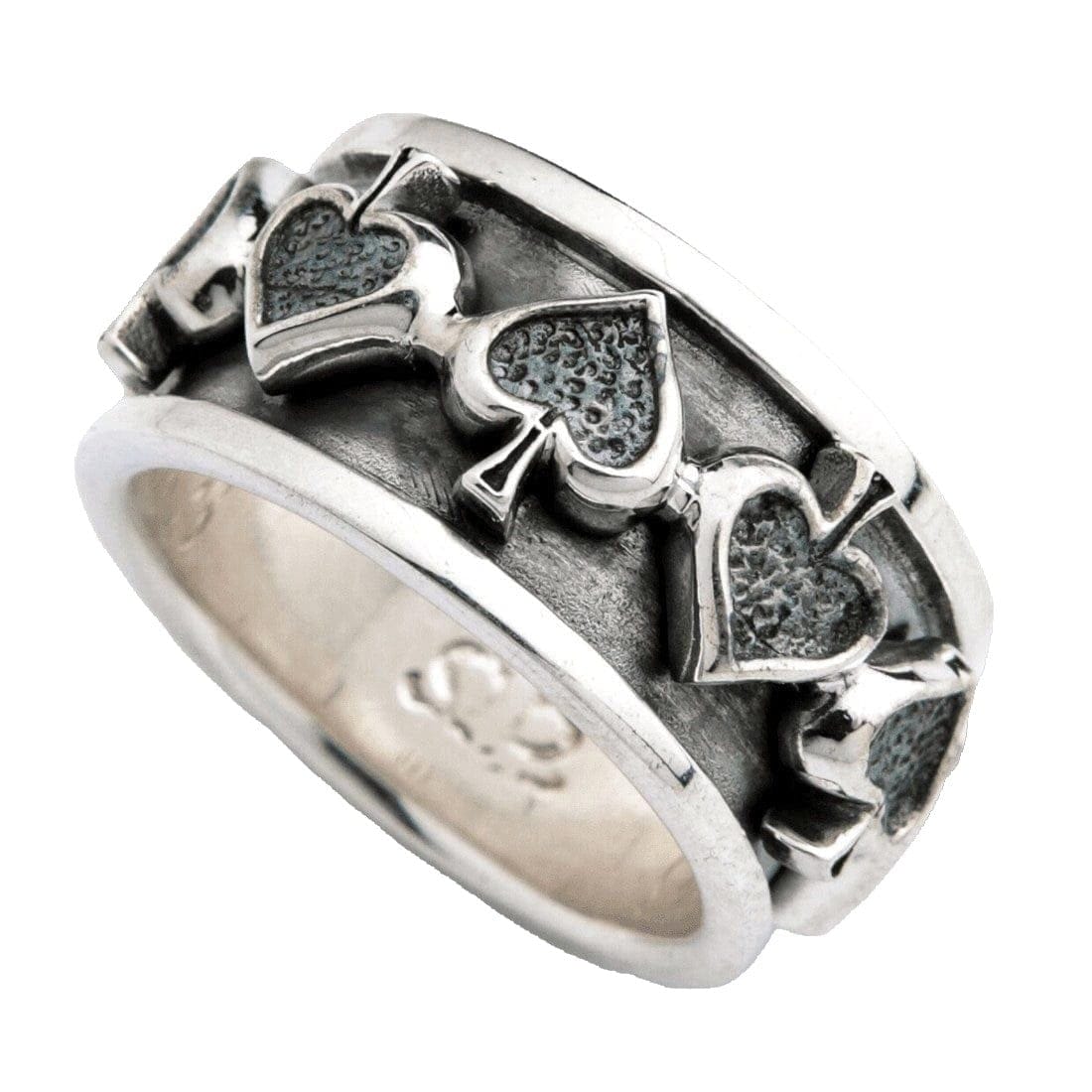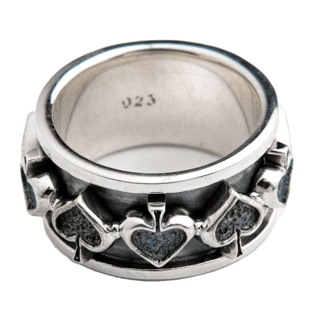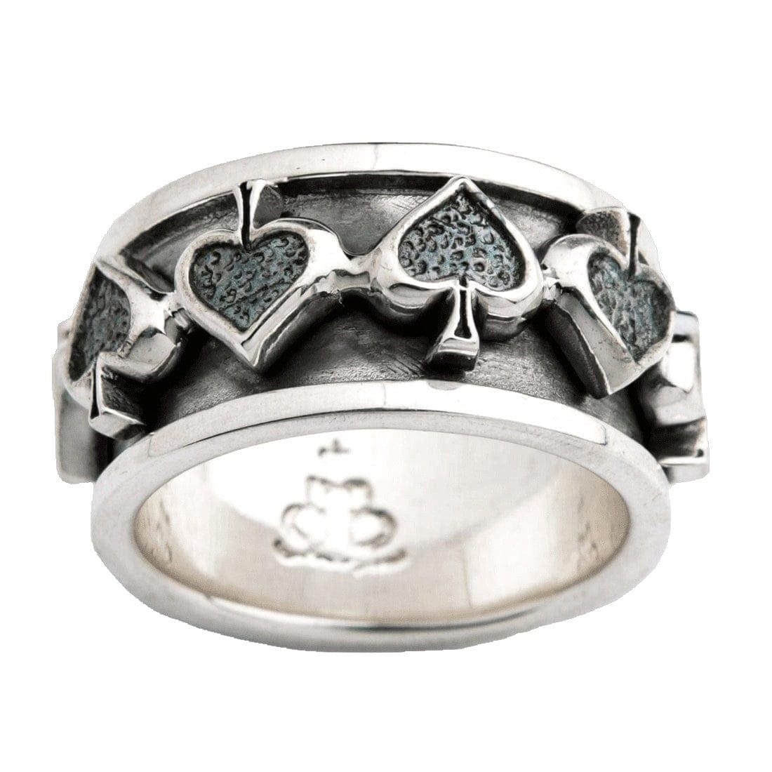 Geniul acestui inel constă în designul său dinamic, din două părți. O bandă interioară solidă se așază confortabil pe deget, în timp ce banda exterioară este proiectată să se rotească liber, oferind o experiență interactivă și satisfăcătoare pentru mâinile neliniștite. Această bandă rotativă este o pânză pentru jocul suprem de putere, având un model repetitiv de simboluri de pică reliefate și lustruite. În lumea cărților și a contraculturii, pica—în special Asul de pică—reprezintă puterea supremă, destinul și o recunoaștere curajoasă a mortalității. Pe măsură ce simbolurile se rotesc, spun povestea unei vieți trăite la limită, o continuă întoarcere a roții norocului, unde puterea și destinul sunt mereu în mișcare. Fiecare simbol este așezat pe un fundal întunecat, texturat, iar întreaga piesă de 19 grame este realizată din argint masiv, fiind o declarație puternică și jucăușă.