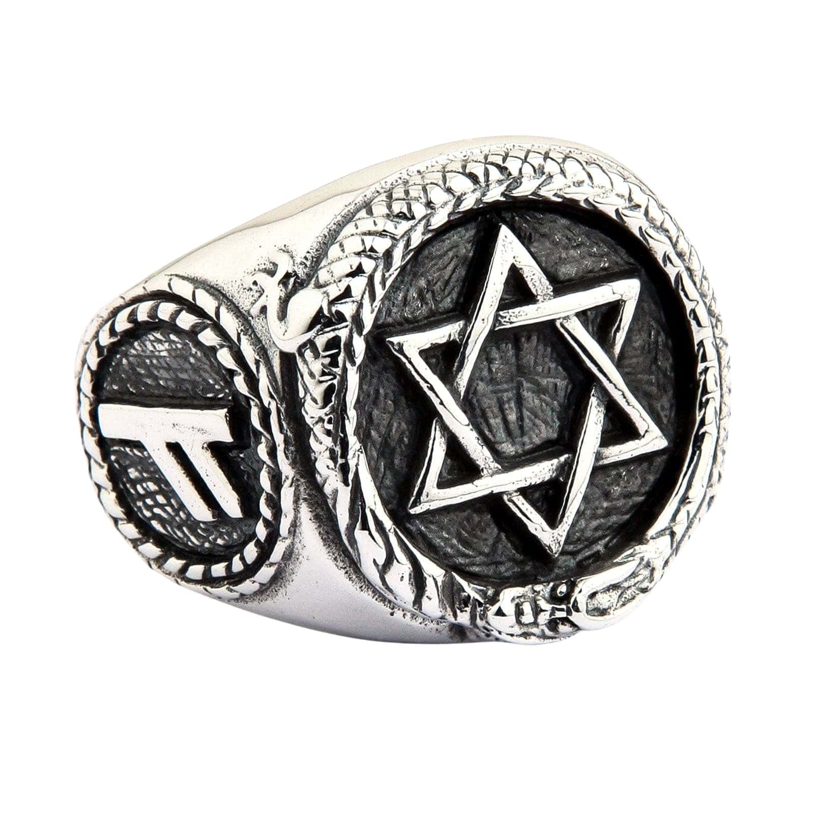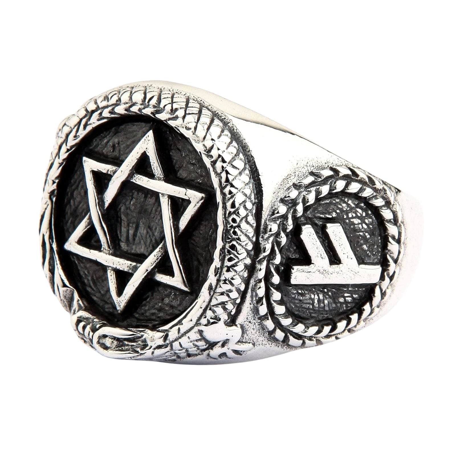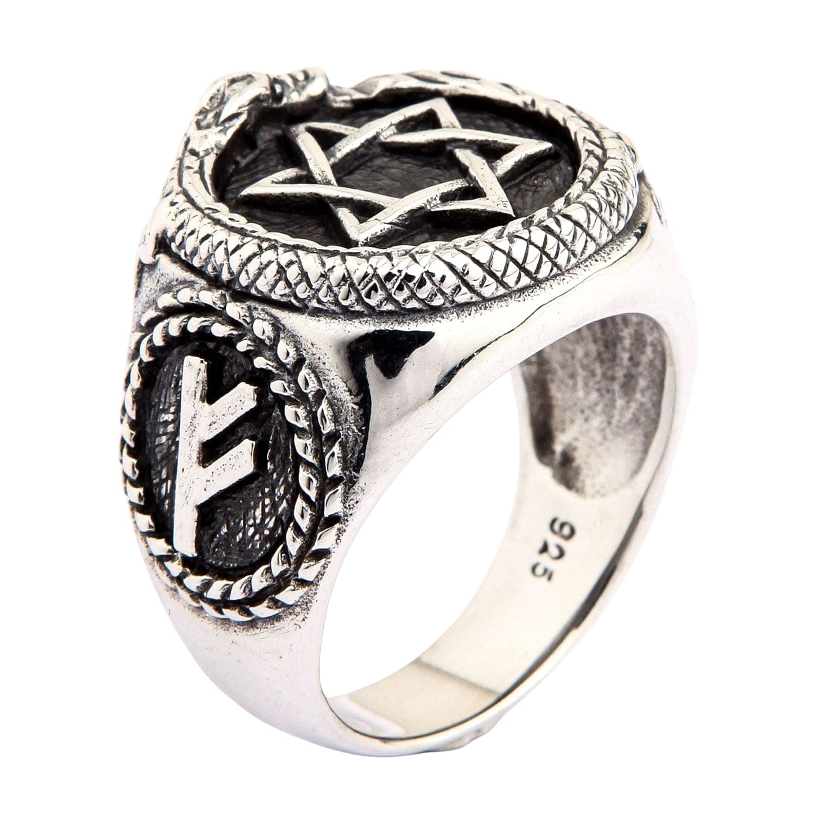 2. Este acesta un inel religios? Deși Steaua lui David este principalul simbol al iudaismului, în acest context, combinată cu Ouroboros și rune nordice, este prezentată ca un simbol mistic și alchimic (Sigiliul lui Solomon). Este destinat pasionaților de simbolism gotic, biker și ezoteric.