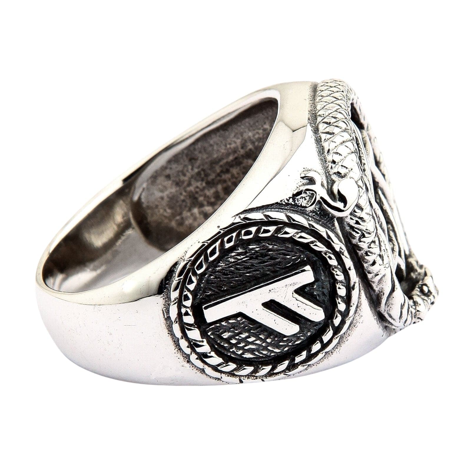 🐉 Detalii complexe cu dragon și rune: Elementul central este înconjurat de un dragon Ouroboros detaliat, iar banda prezintă rune adânc sculptate și texturi evidențiate printr-un finisaj oxidat.