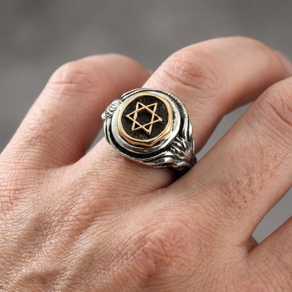 Acesta nu este doar un inel, ci un talisman ezoteric puternic. Inelul nostru unic pentru bărbați, Steaua lui David, este o piesă de impact pentru căutătorii cunoașterii ascunse, care îmbină magistral două dintre cele mai profunde simboluri ale misticismului. Forjat din argint sterling masiv și alamă cu accente contrastante, acesta este un inel pentru cei care înțeleg și respectă echilibrul fundamental al universului.