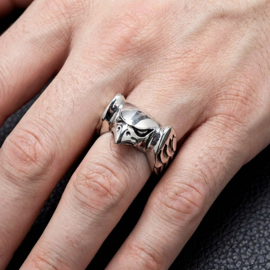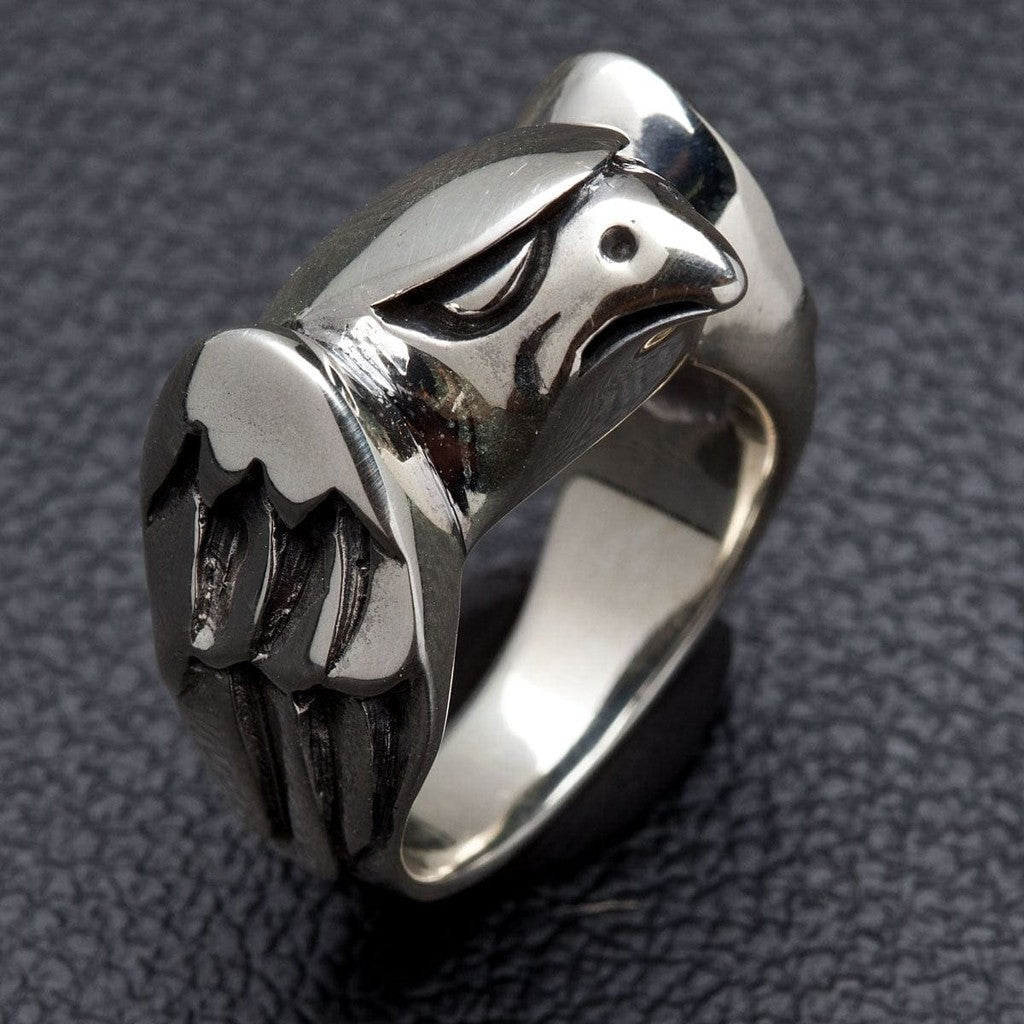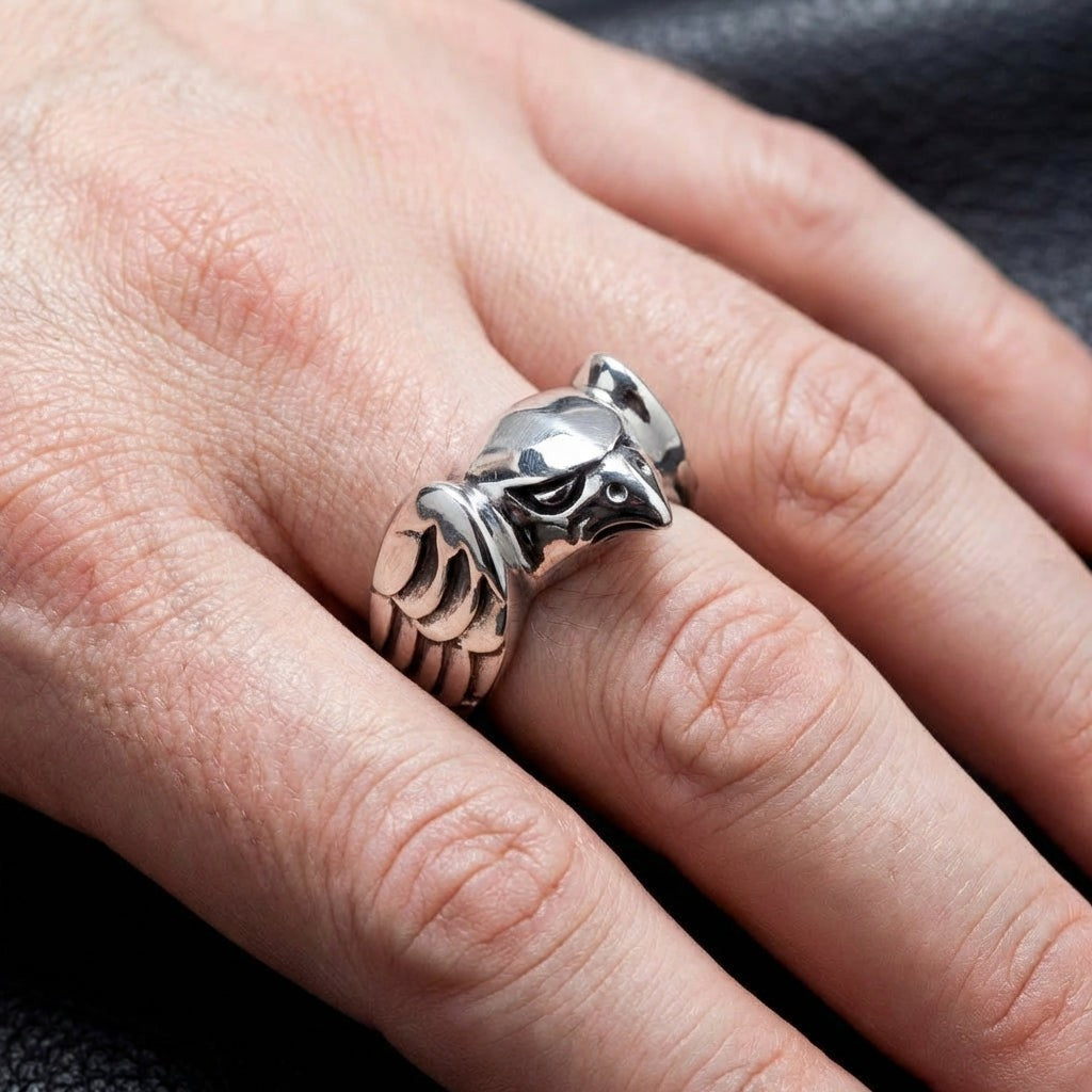 Considerat mesager al îngerilor, șoimul modest își face loc printre accesoriile tale cu acest inel bărbătesc unic. Redând privirea caracteristică a păsării și aripile ridicate, această piesă este mai subțire decât alte modele ale noastre, dar păstrează un nivel impresionant de detaliu. A fost realizată manual de meșterii noștri argintari și finisată la cele mai înalte standarde.