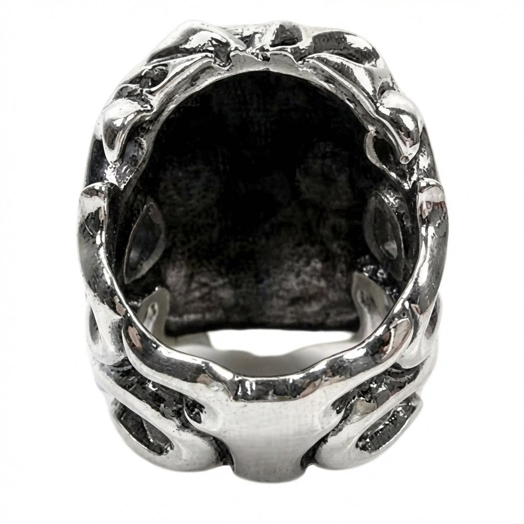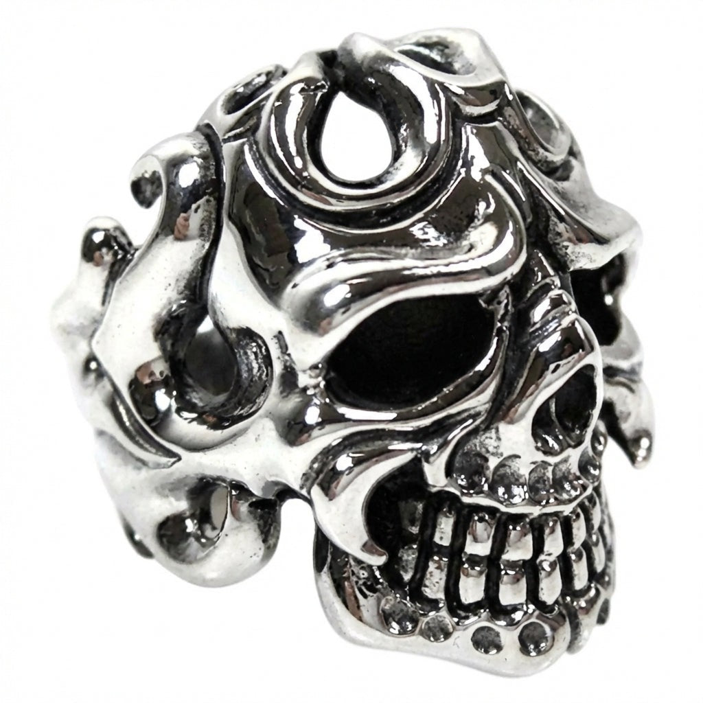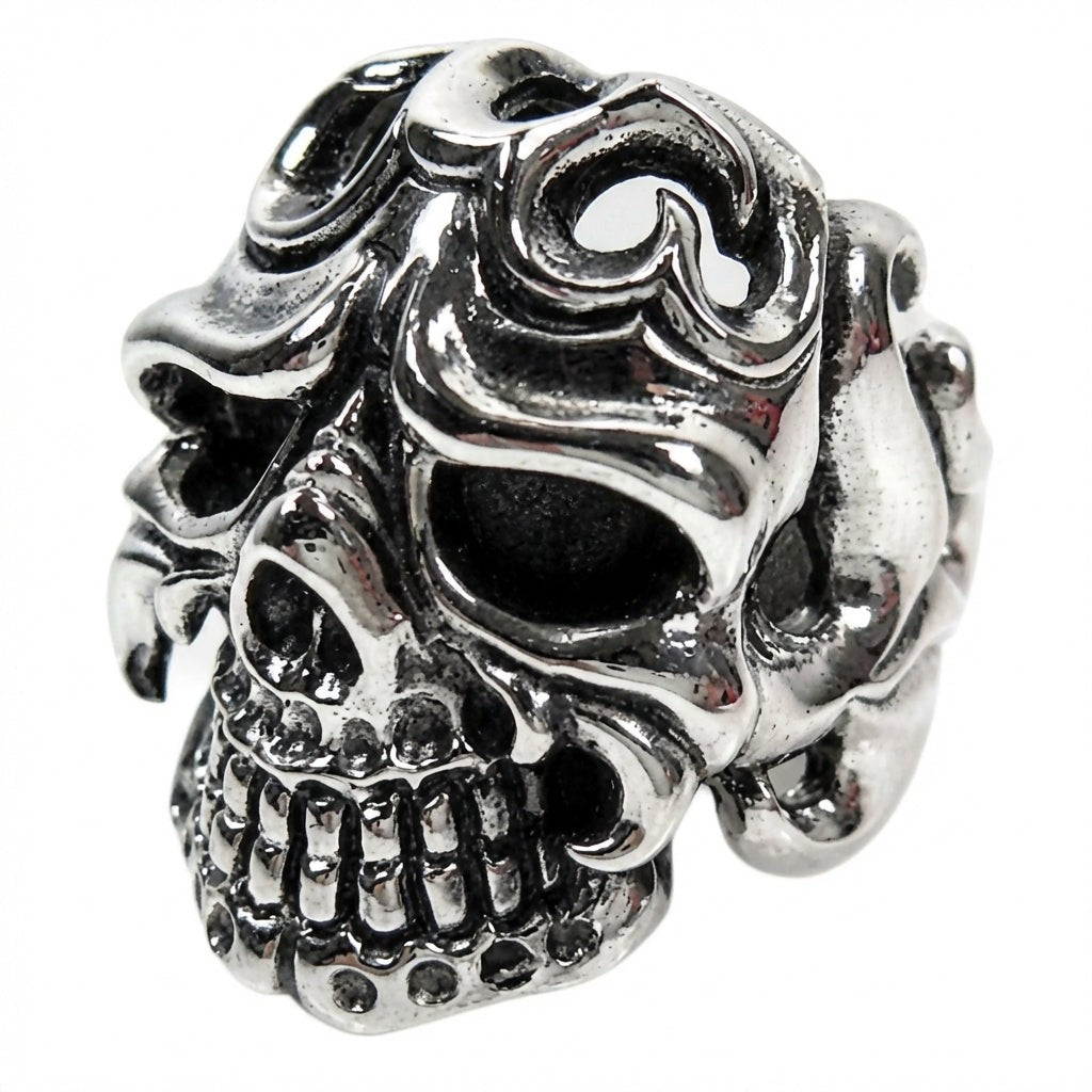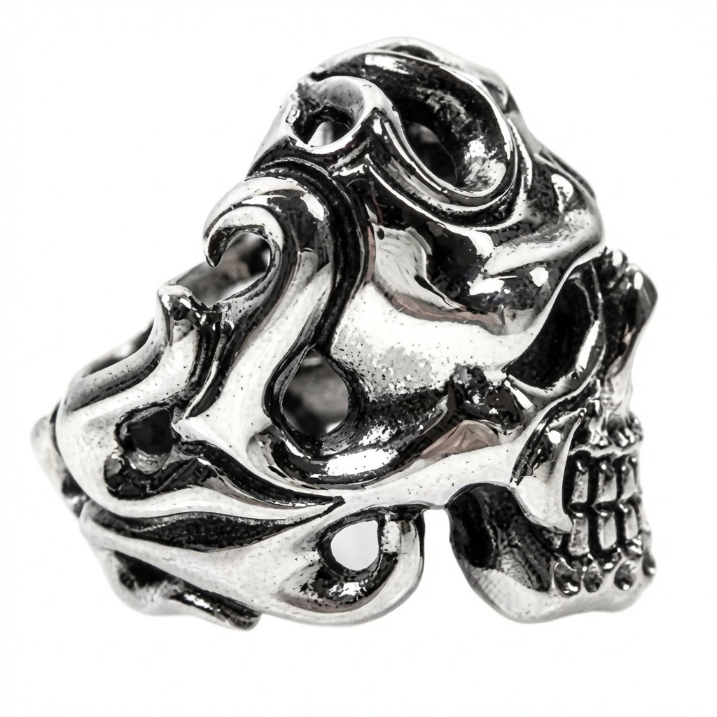 Cu un inel tip craniu, împodobit cu modele tribale detaliate care adaugă profunzime și caracter, subliniindu-ți stilul biker unic.