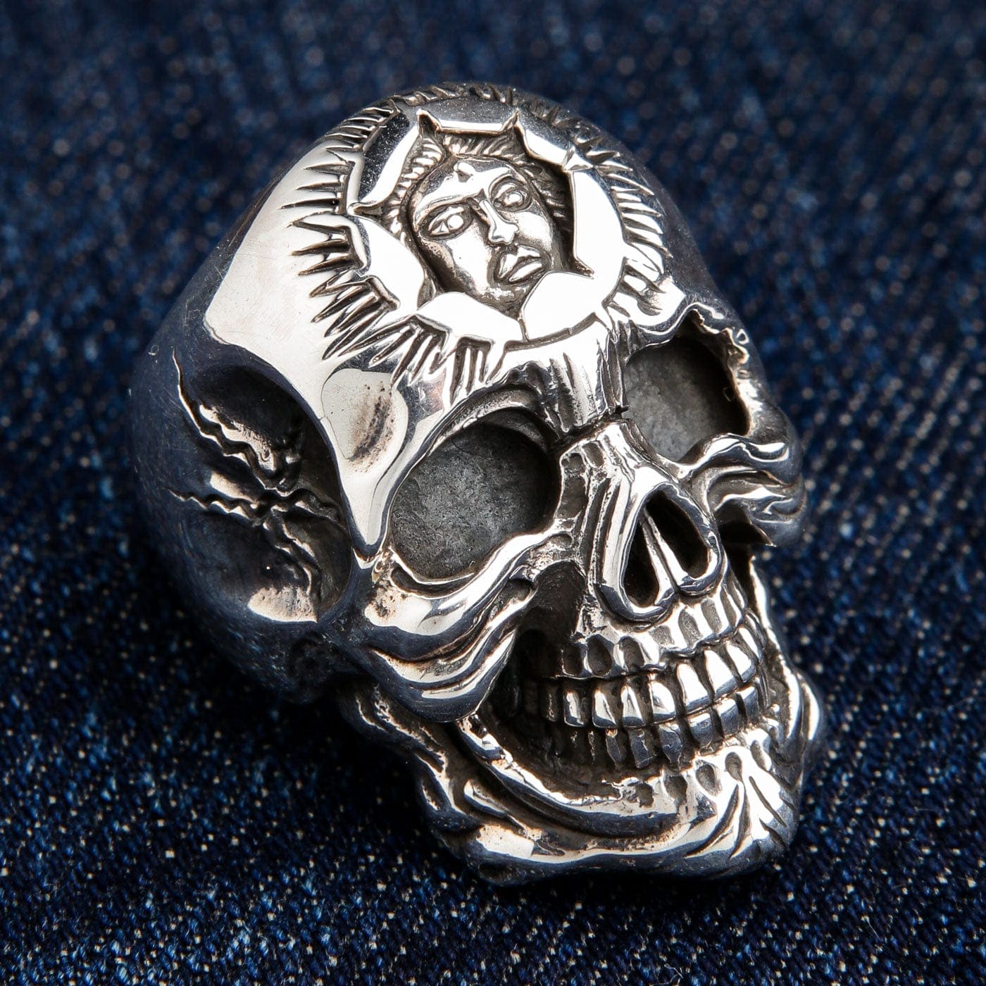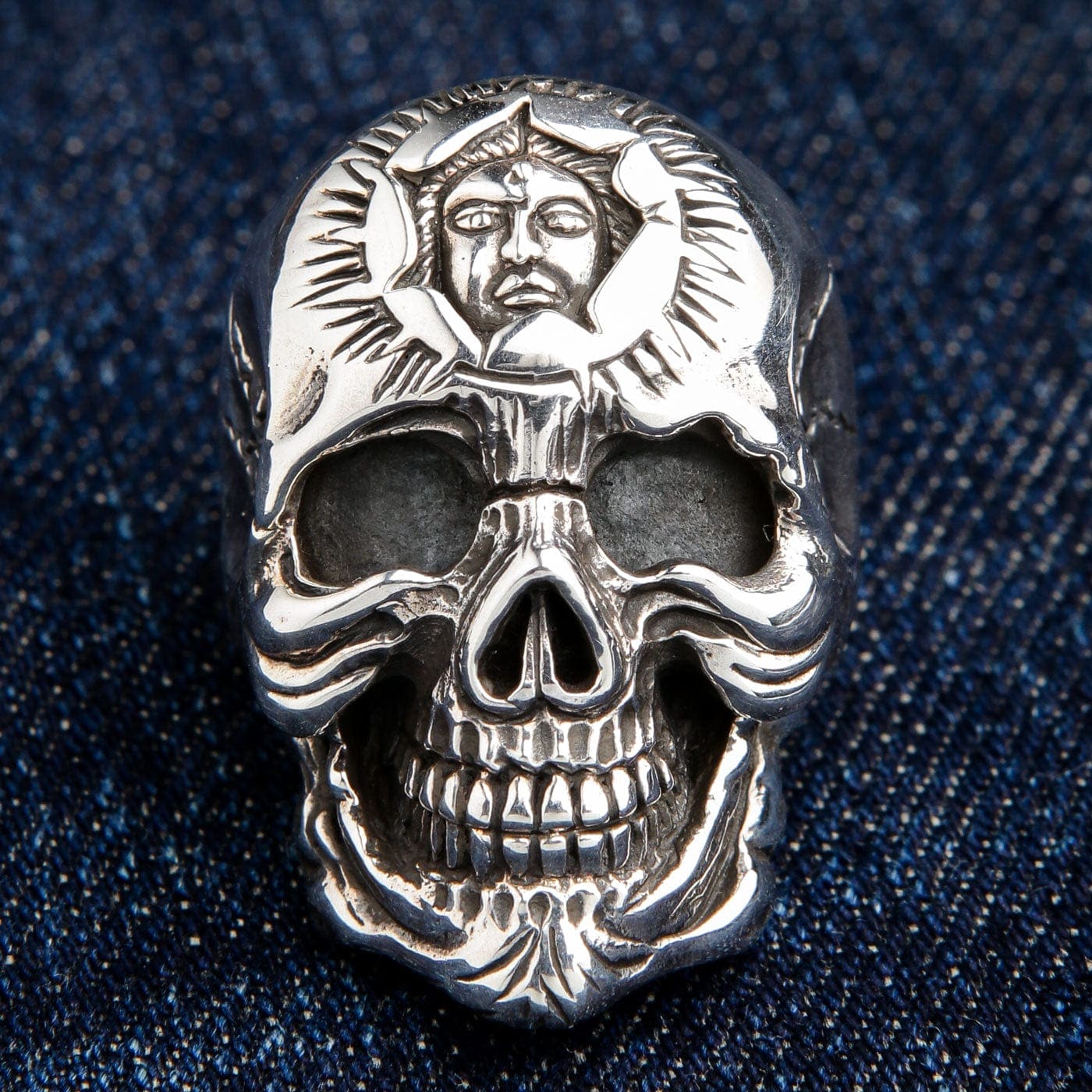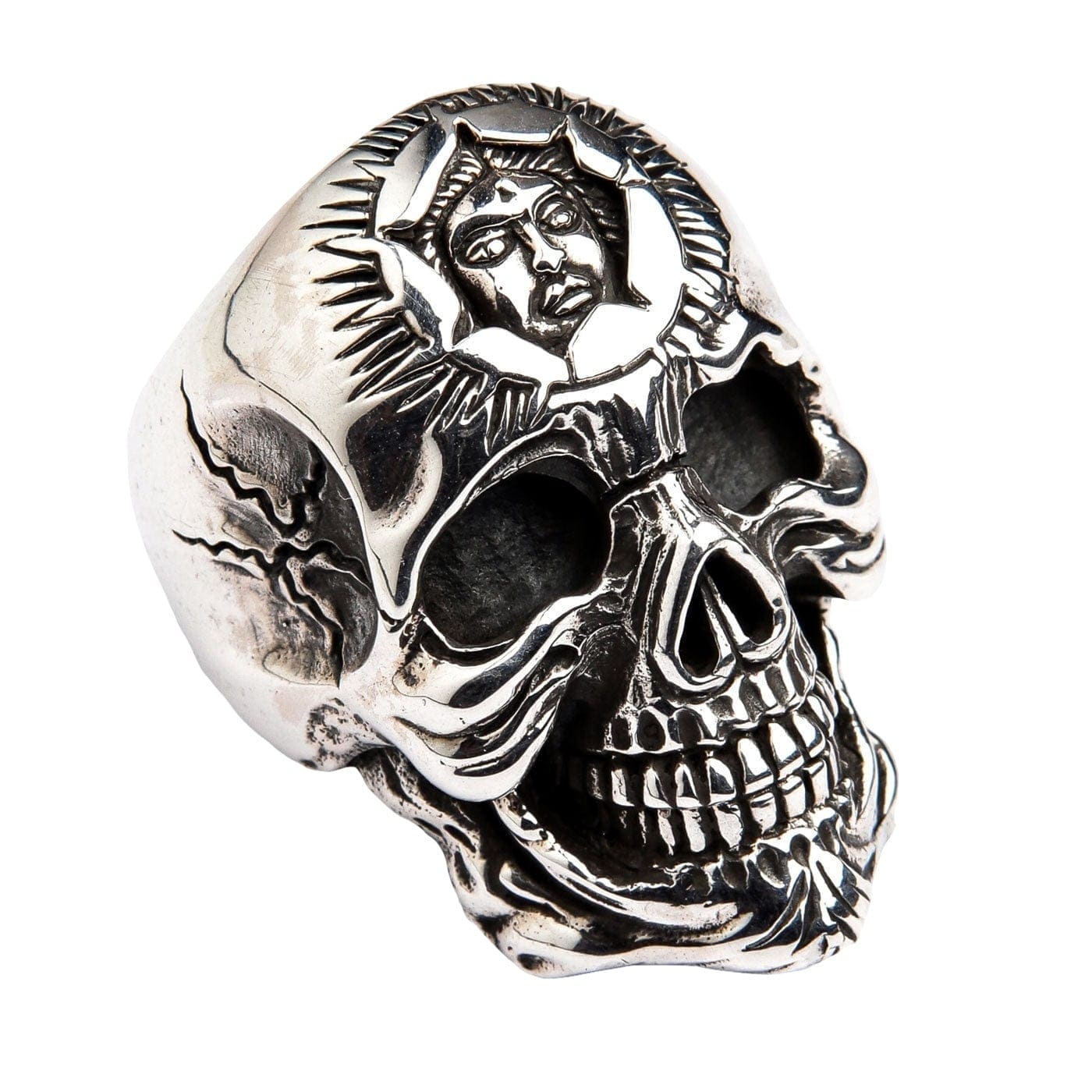 Lasă-ți bijuteriile să vorbească pentru tine — poartă cu îndrăzneală Inelul Heavy Sun God din Argint Sterling cu Craniu.